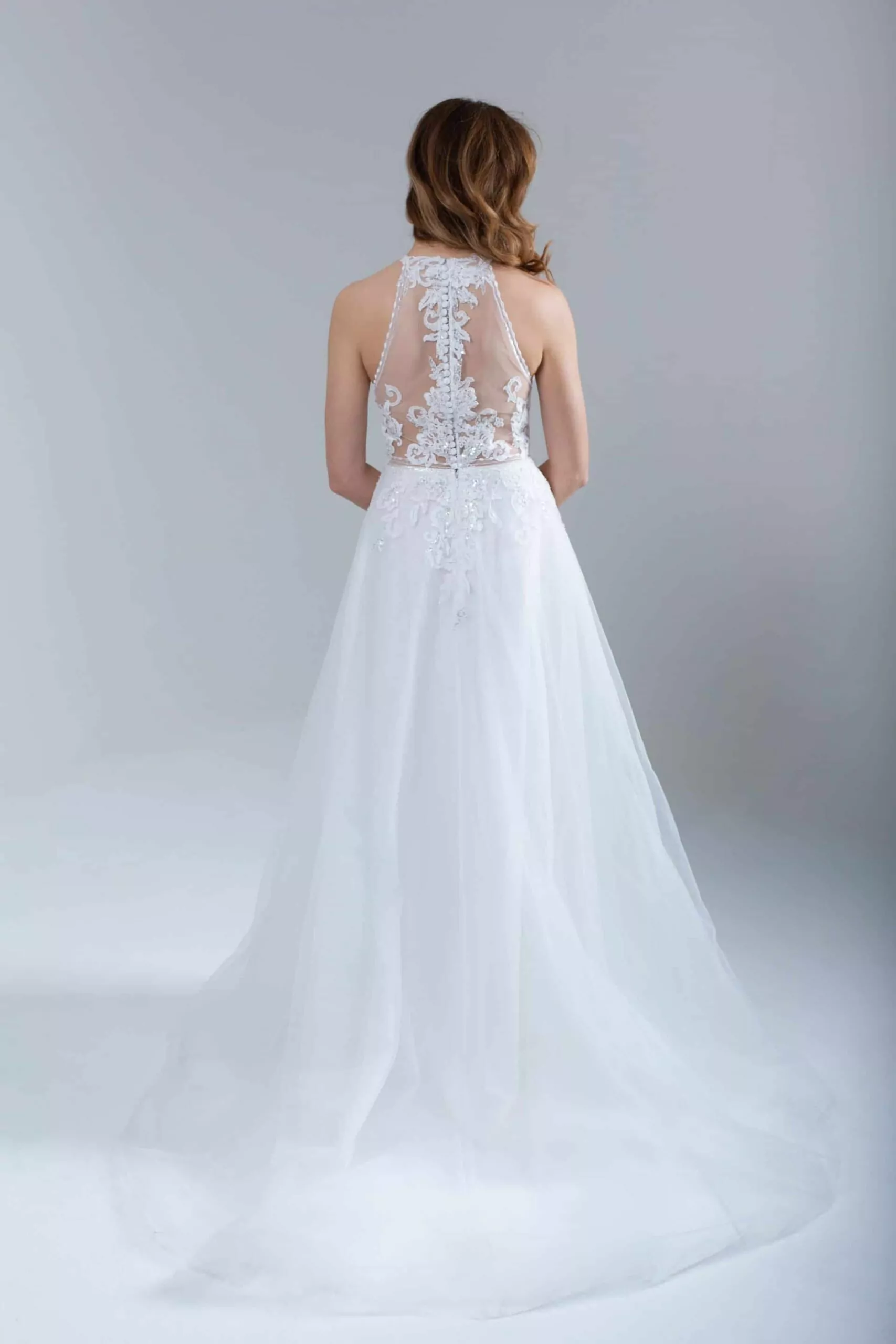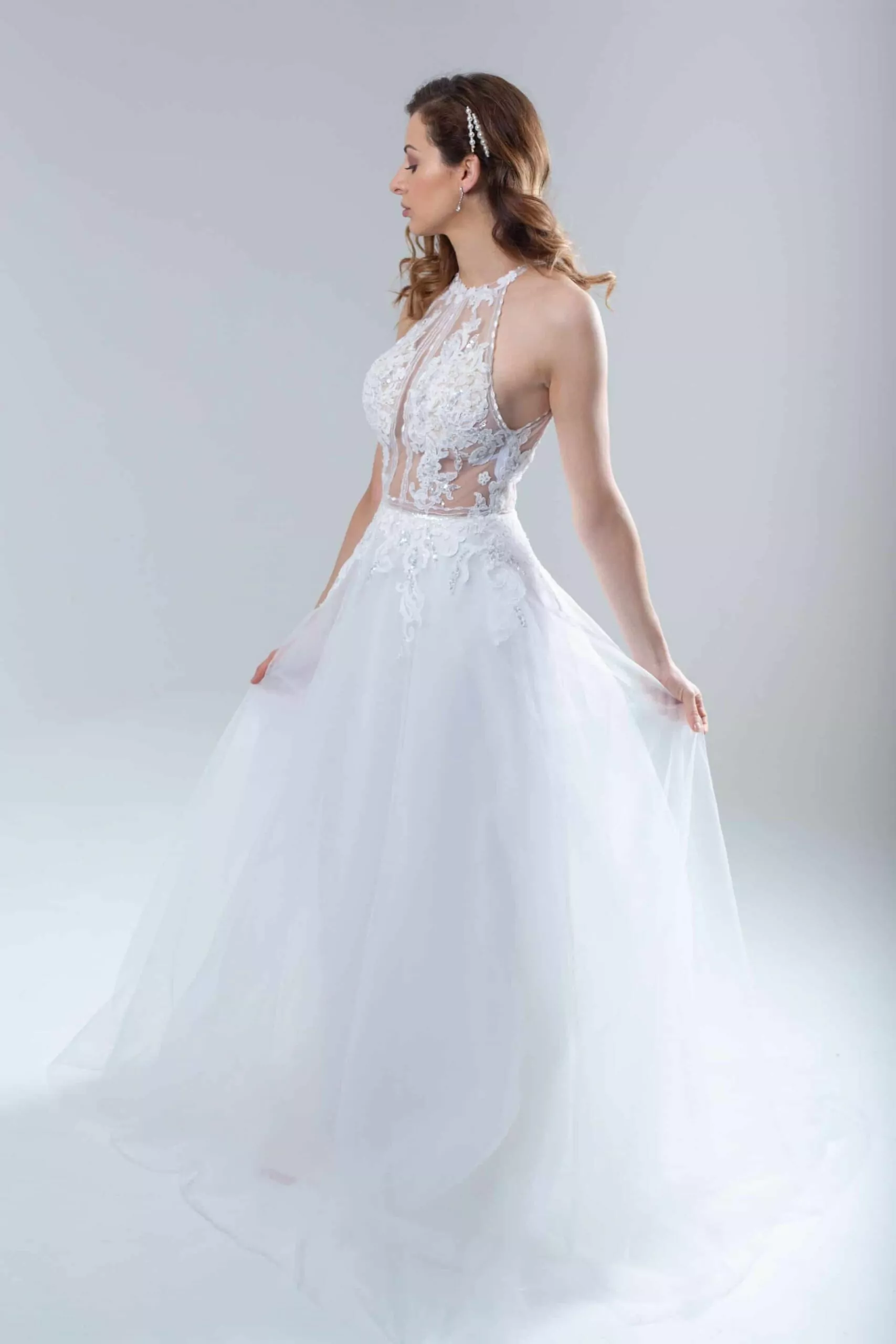 Modernes Brautkleid mit detailreichen Verzierungen im Oberteil.