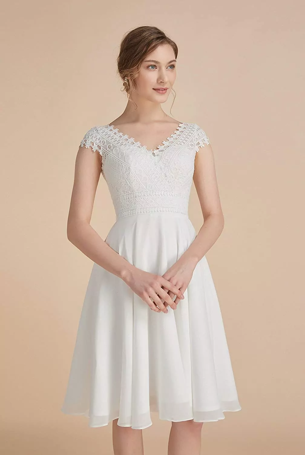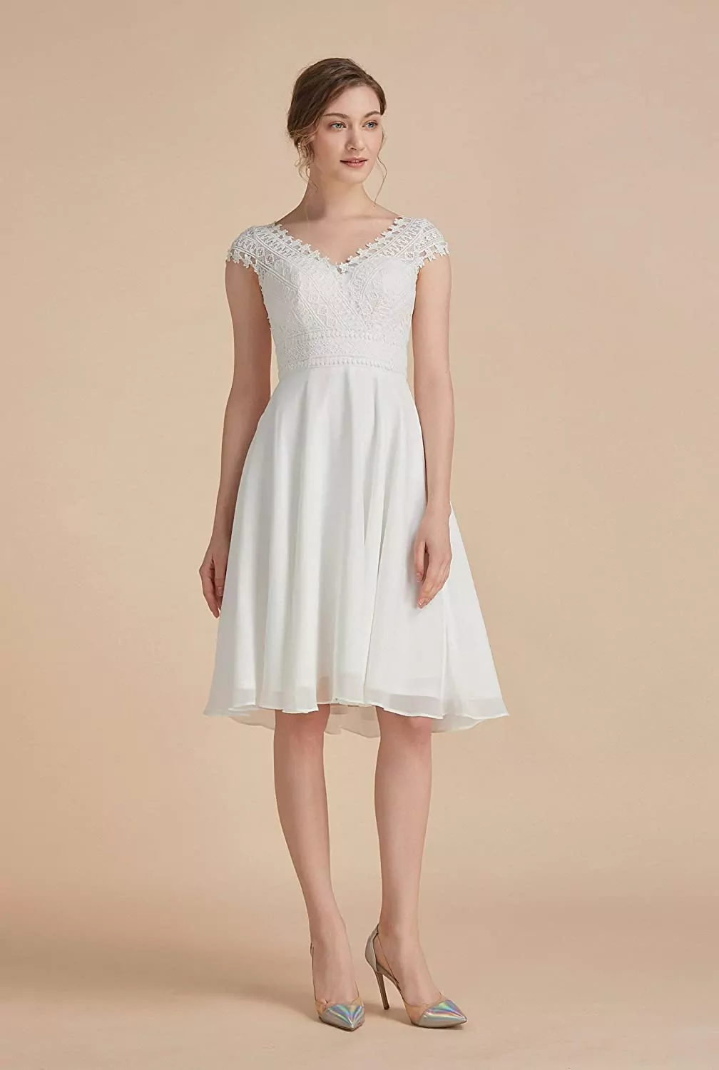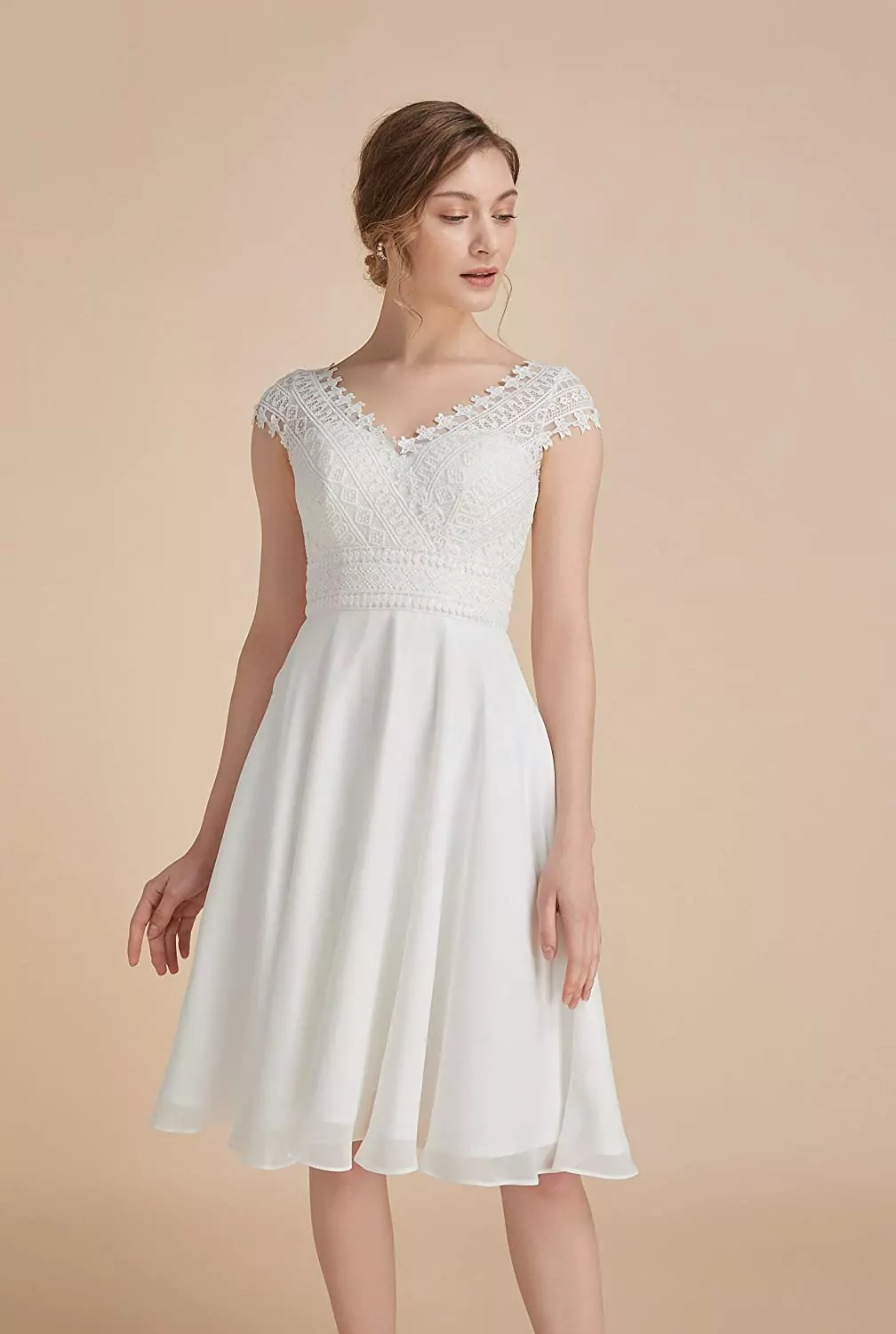 Bei einem knielangen Brautkleid ist auch die Wahl passender Brautschuhe nicht zu unterschätzen. Im Einklang mit schönen Waden und Knöcheln unterstreichen sie einen ästhetische Gesamteindruck. Als Faustregel gilt: je kleiner die Körbchengröße desto tiefer darf der V-Ausschnitt sein. Dieser verleiht Größe und kaschiert auch ein wenig Übergewicht. Cap-Ärmel kaschieren den Schulterbereich ohne dabei die Arme zu verhüllen. Im strahlenden Weiß wirkt das Kleid bei kalten Hauttypen, allen voran dem Wintertypen harmonisch; besonders bei schöngebräunter Haut ensteht dabei ein toller Kontrast. Bräute mit einem warmen und hellen Teint könnten darin eher blass erscheinen. Wir empfehlen dieses Modell auch für eine standesamtliche Hochzeit.Bitte versteh diese Hinweise nur als allgemeine Ratschläge basierend auf den Merkmalen des hier angebotenen Brautkleids. Jedes Kleid hat seine eigene Ausstrahlung und seinen eigenen Charakter – genau wie du. Wenn dieses DEIN Kleid ist, wird es auch entgegen unserer Tips zu dir passsen. Über Geschmack lässt sich bekanntlich nicht streiten. Wenn du dir bei deiner Kaufentscheidung unsicher bist, lass dich professionell beraten, frag deine engsten Vertrauten und hör vor allem auf dein Bauchgefühl.
