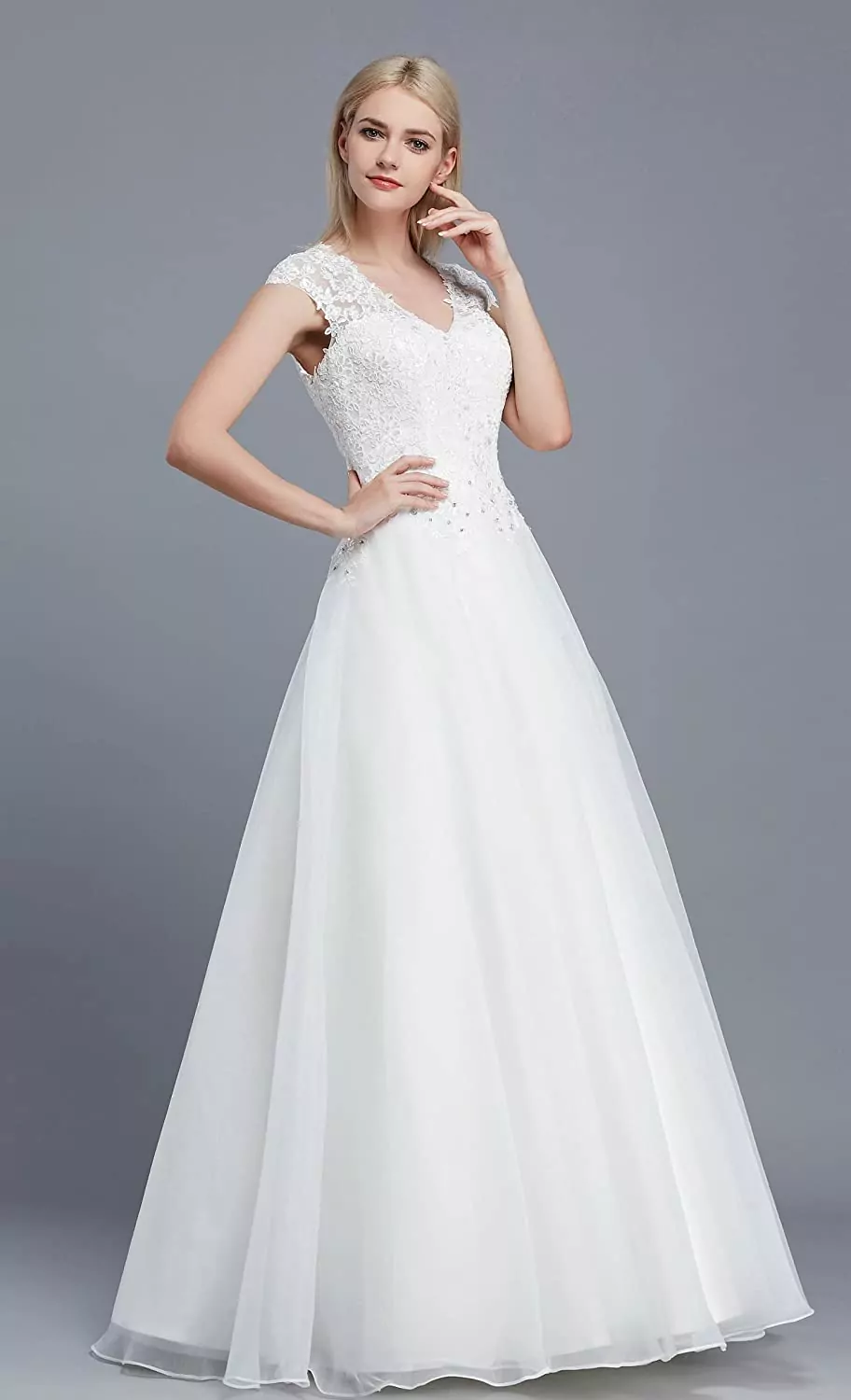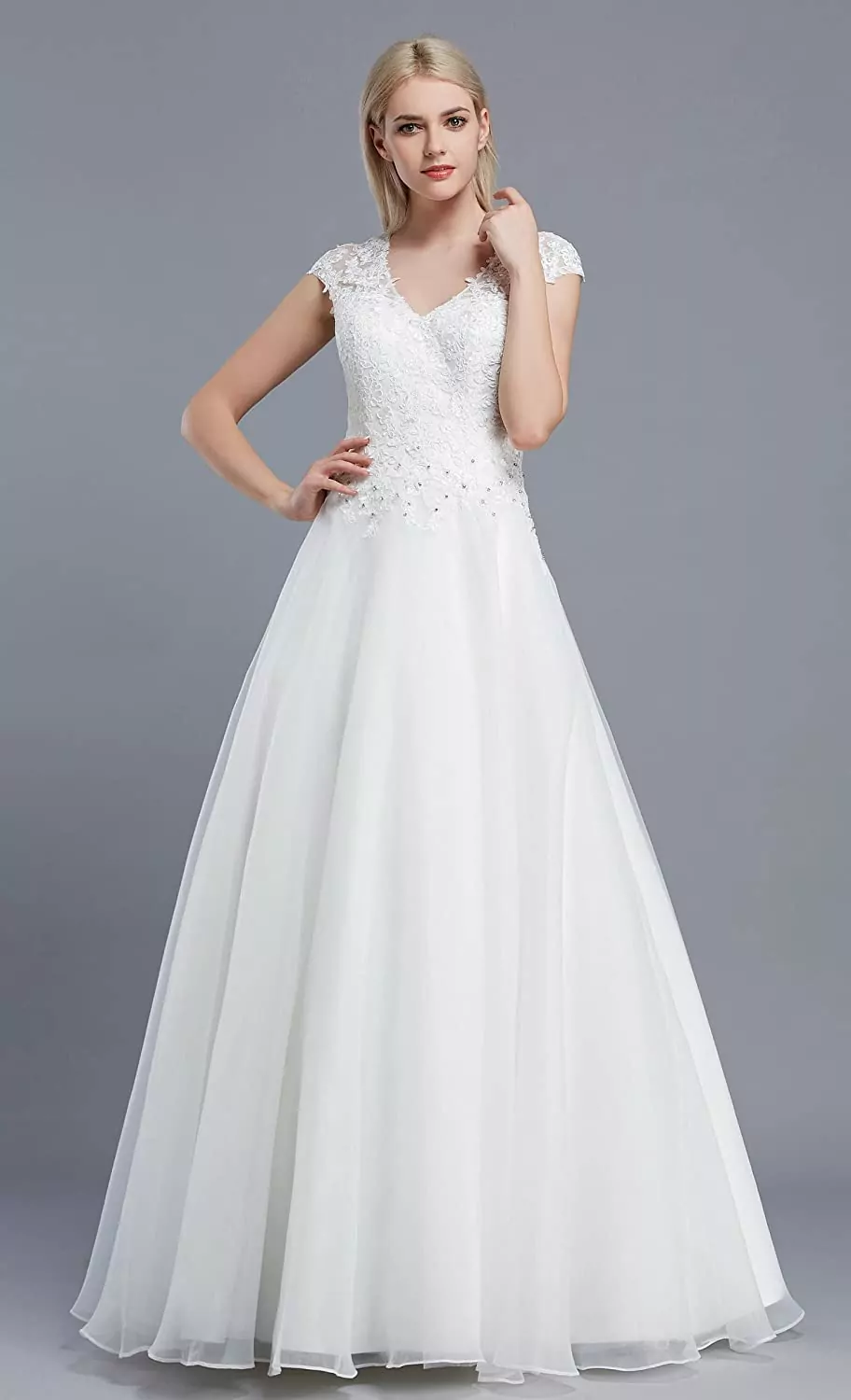 Der A-Linien Schnitt, Klassiker unter den Brautkleidern, kaschiert Problemzonen unterhalb der Taille und betont die Vorzüge des Oberkörpers. Als besonders zierliche Braut, könnte der Eindruck entsteht, im Kleid zu "versinken"; geeignete Alternativen wären ein Etui Brautkleid oder ein kurzer Empire Schnitt. Das bodenlange Brautkleid verhüllt nicht nur die Beine sondern auch zum größten Teil die Schuhe, die du trägst. Dementsprechend können diese eher bequem anstatt bezaubernd ausfallen. Als Faustregel gilt: je kleiner die Körbchengröße desto tiefer darf der V-Ausschnitt sein. Dieser verleiht Größe und kaschiert auch ein wenig Übergewicht. Cap-Ärmel kaschieren den Schulterbereich ohne dabei die Arme zu verhüllen. Im strahlenden Weiß wirkt das Kleid bei kalten Hauttypen, allen voran dem Wintertypen harmonisch; besonders bei schöngebräunter Haut ensteht dabei ein toller Kontrast. Bräute mit einem warmen und hellen Teint könnten darin eher blass erscheinen.Bitte versteh diese Hinweise nur als allgemeine Ratschläge basierend auf den Merkmalen des hier angebotenen Brautkleids. Jedes Kleid hat seine eigene Ausstrahlung und seinen eigenen Charakter – genau wie du. Wenn dieses DEIN Kleid ist, wird es auch entgegen unserer Tips zu dir passsen. Über Geschmack lässt sich bekanntlich nicht streiten. Wenn du dir bei deiner Kaufentscheidung unsicher bist, lass dich professionell beraten, frag deine engsten Vertrauten und hör vor allem auf dein Bauchgefühl.