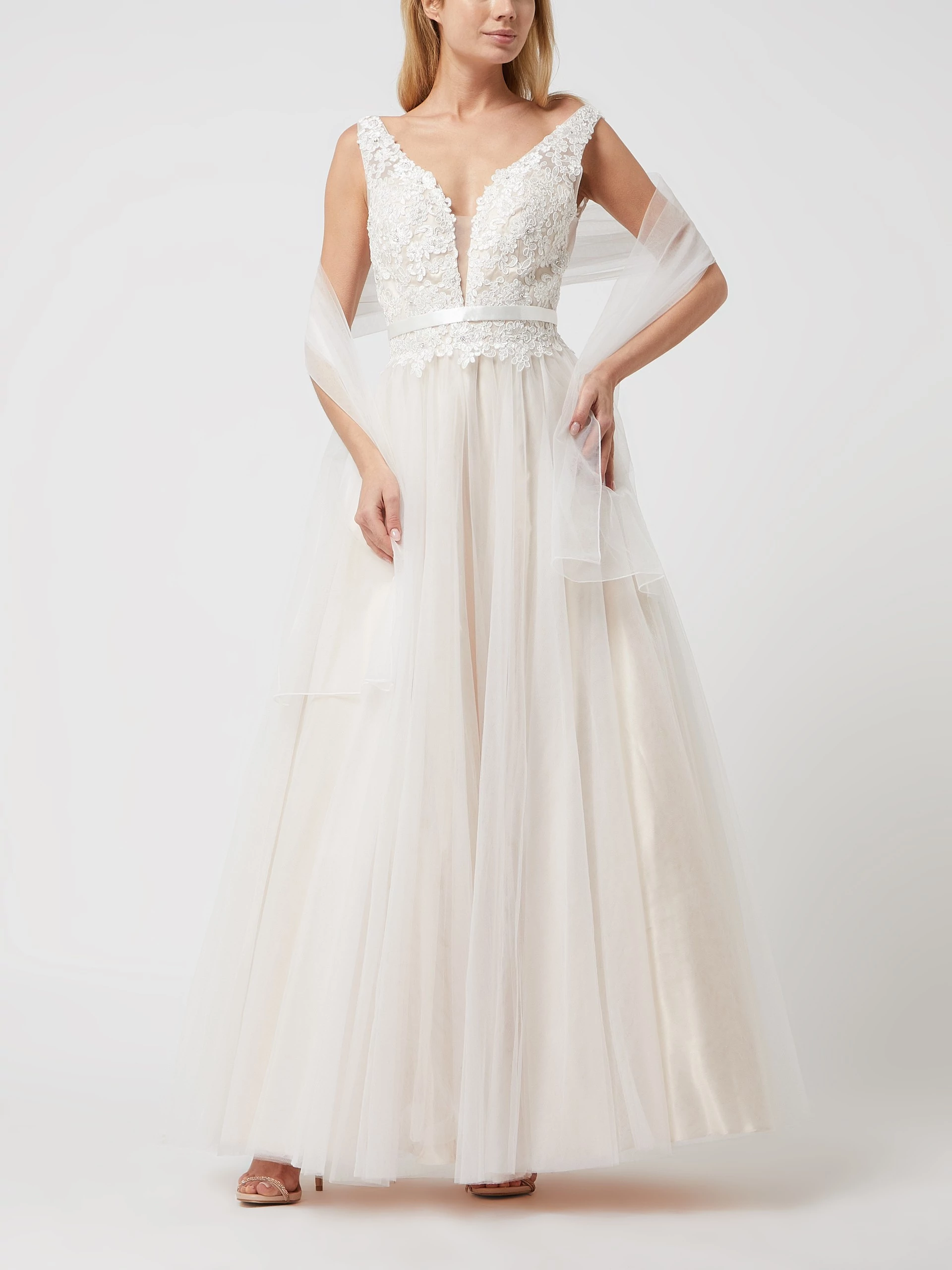 Das bodenlange Brautkleid verhüllt nicht nur die Beine sondern auch zum größten Teil die Schuhe, die du trägst. Dementsprechend können diese eher bequem anstatt bezaubernd ausfallen. Als Faustregel gilt: je kleiner die Körbchengröße desto tiefer darf der V-Ausschnitt sein. Dieser verleiht Größe und kaschiert auch ein wenig Übergewicht. Die Stola macht das Outfit wandelbar: So bleiben die Schultern bei der kirchlichen Trauung bedeckt und vor Luftzügen geschützt. Für den festlichen Teil entfaltet das Kleid im Handumdrehen seine volle Pracht.Bitte versteh diese Hinweise nur als allgemeine Ratschläge basierend auf den Merkmalen des hier angebotenen Brautkleids. Jedes Kleid hat seine eigene Ausstrahlung und seinen eigenen Charakter – genau wie du. Wenn dieses DEIN Kleid ist, wird es auch entgegen unserer Tips zu dir passsen. Über Geschmack lässt sich bekanntlich nicht streiten. Wenn du dir bei deiner Kaufentscheidung unsicher bist, lass dich professionell beraten, frag deine engsten Vertrauten und hör vor allem auf dein Bauchgefühl.