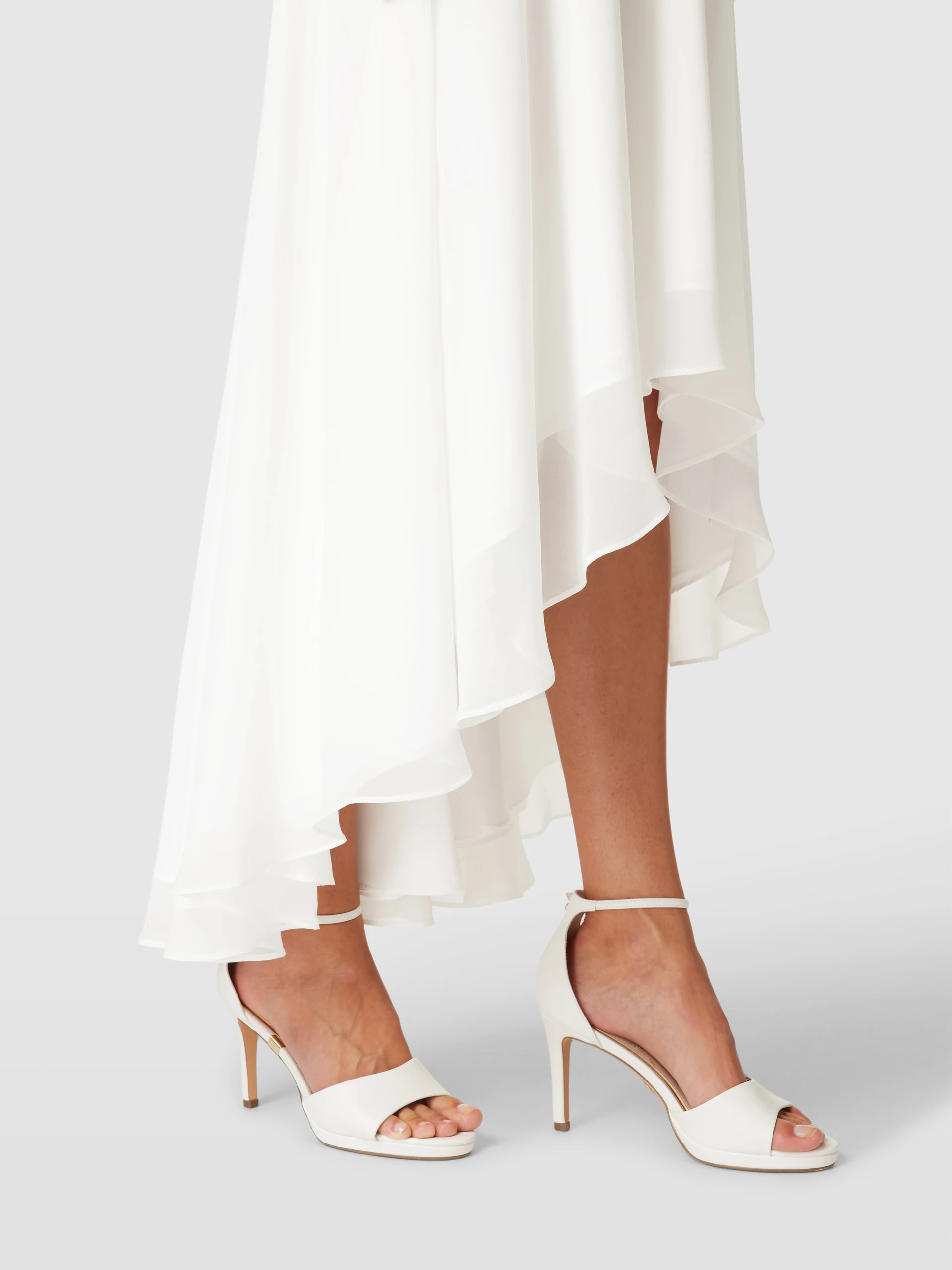 Das Vokuhila Brautkleid führt den Blick über Beine und Knöchel auf das Schuhwerk, was entsprechend sorgfältig ausgesucht werden darf. Der herzförmige Ausschnitt formt ein schönes Dekolleté. Im strahlenden Weiß wirkt das Kleid bei kalten Hauttypen, allen voran dem Wintertypen harmonisch; besonders bei schöngebräunter Haut ensteht dabei ein toller Kontrast. Bräute mit einem warmen und hellen Teint könnten darin eher blass erscheinen. Wir empfehlen dieses Modell auch für eine standesamtliche Hochzeit.Bitte versteh diese Hinweise nur als allgemeine Ratschläge basierend auf den Merkmalen des hier angebotenen Brautkleids. Jedes Kleid hat seine eigene Ausstrahlung und seinen eigenen Charakter – genau wie du. Wenn dieses DEIN Kleid ist, wird es auch entgegen unserer Tips zu dir passsen. Über Geschmack lässt sich bekanntlich nicht streiten. Wenn du dir bei deiner Kaufentscheidung unsicher bist, lass dich professionell beraten, frag deine engsten Vertrauten und hör vor allem auf dein Bauchgefühl.
