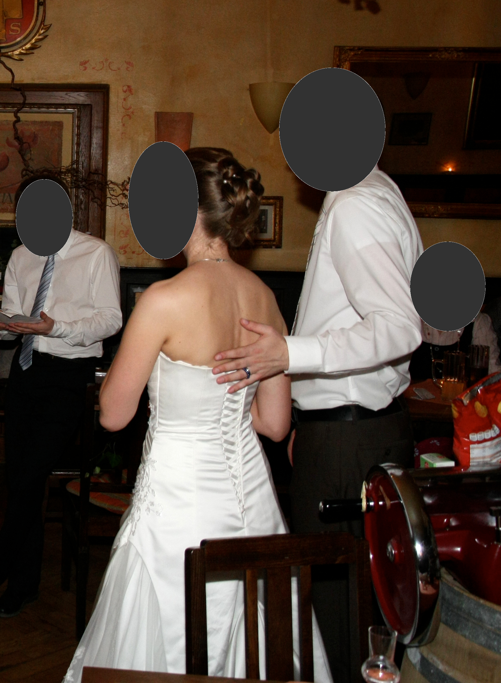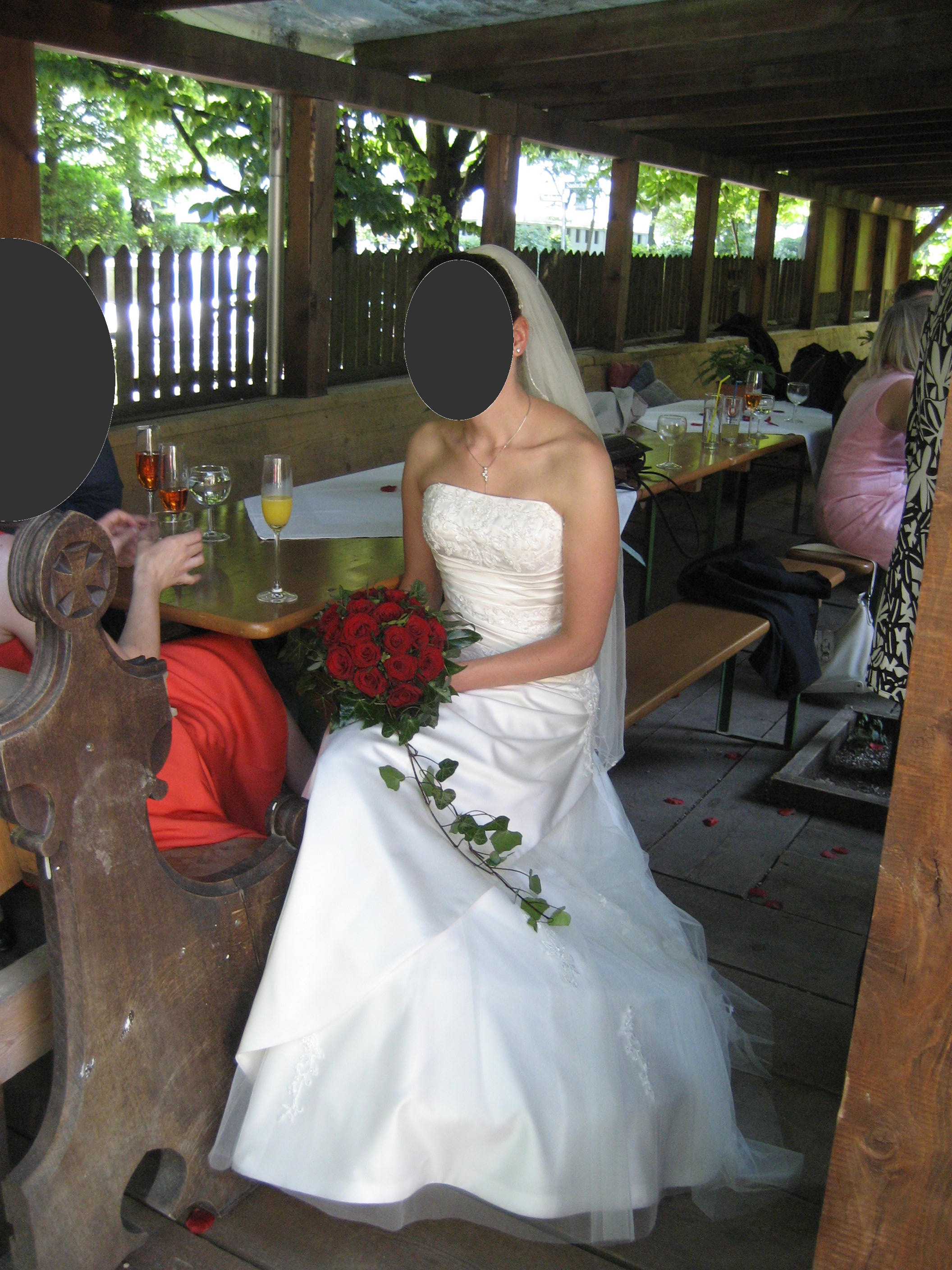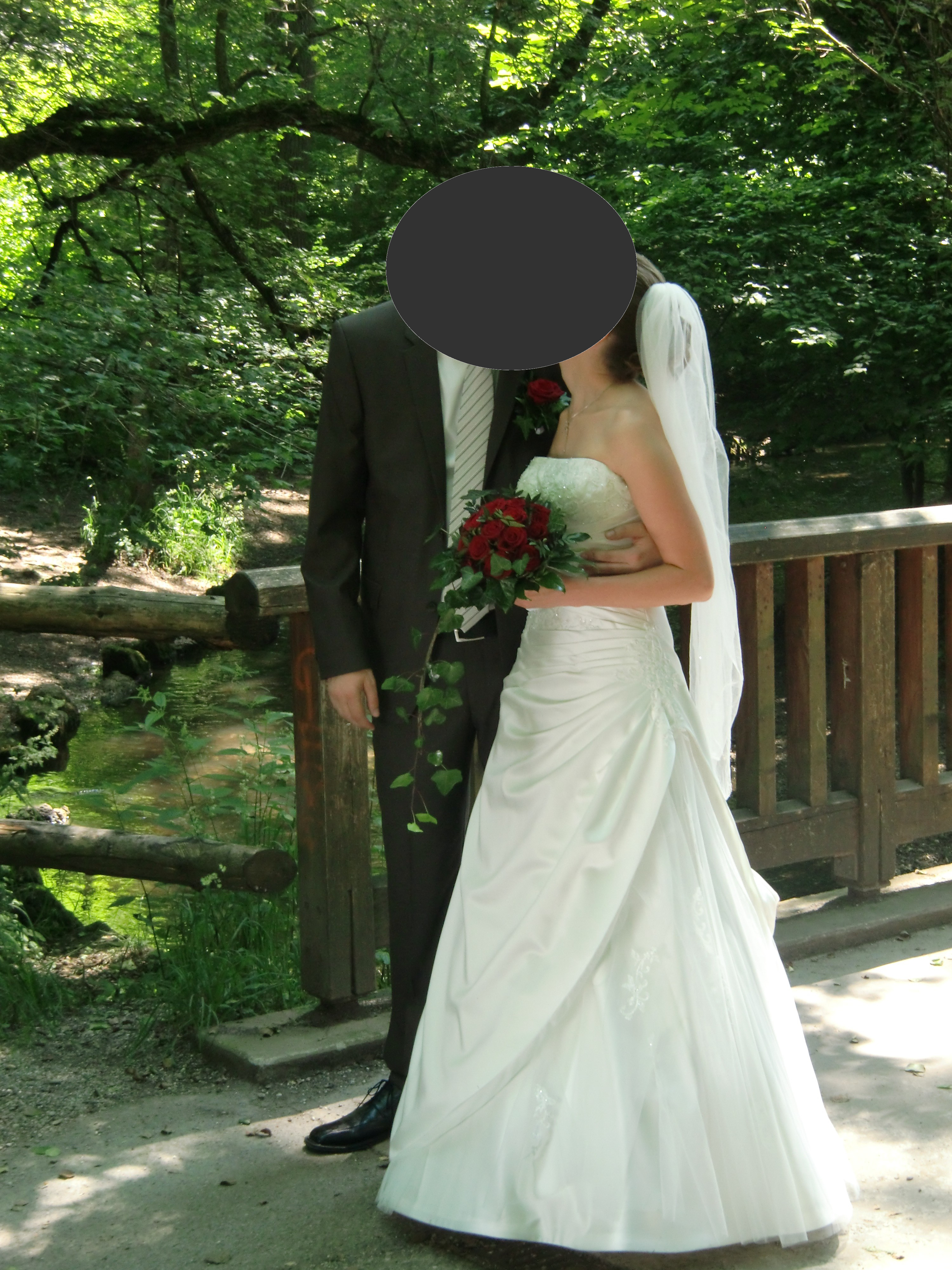 Ich habe eine Grösse von 1,70 m und die Schuhe hatten ca. 5 cm Absatz. Das Brautkleid habe ich einmal zur kirchlichen Trauung getragen und anschliessend professionell reinigen lassen.
