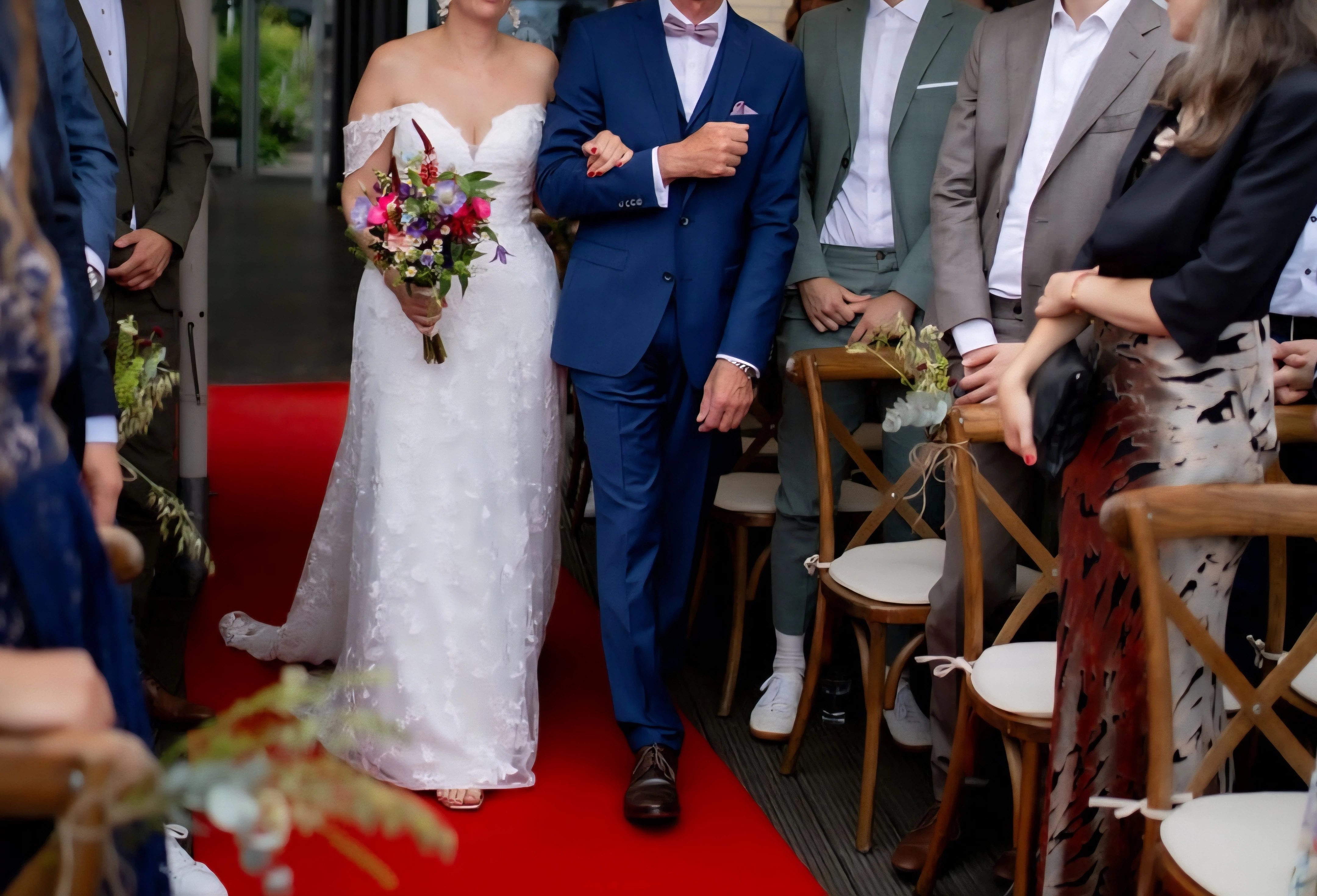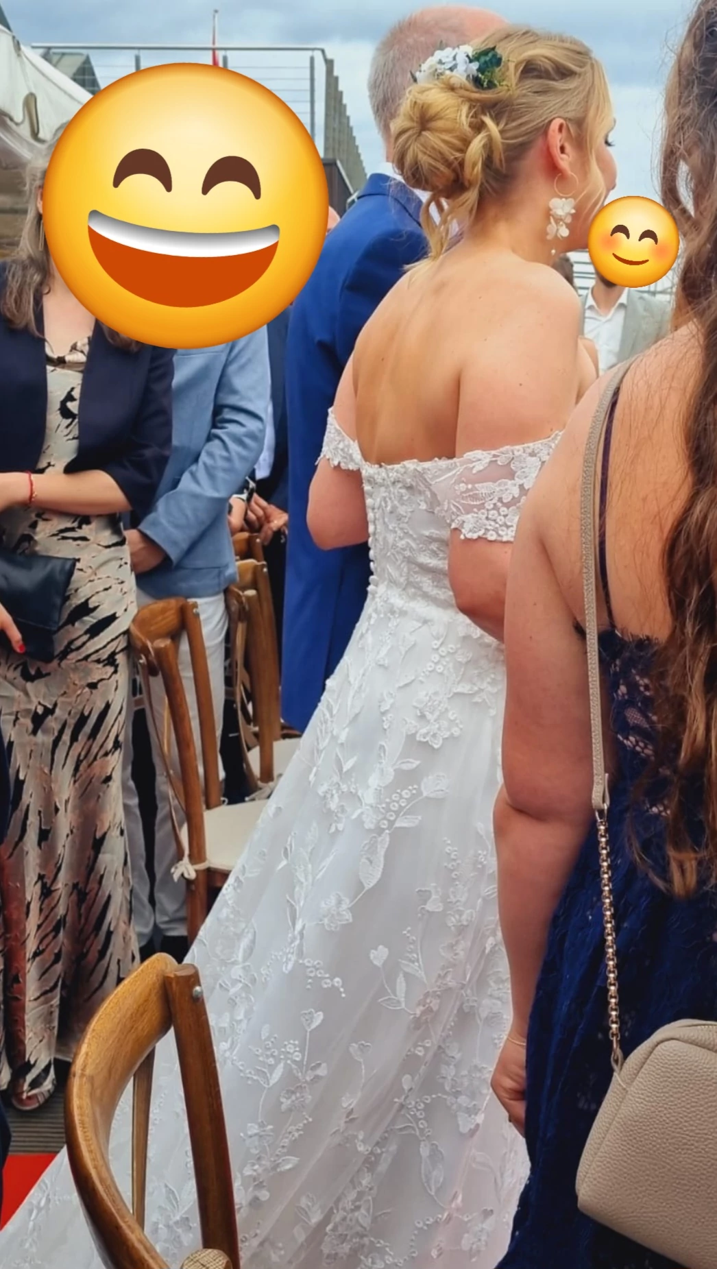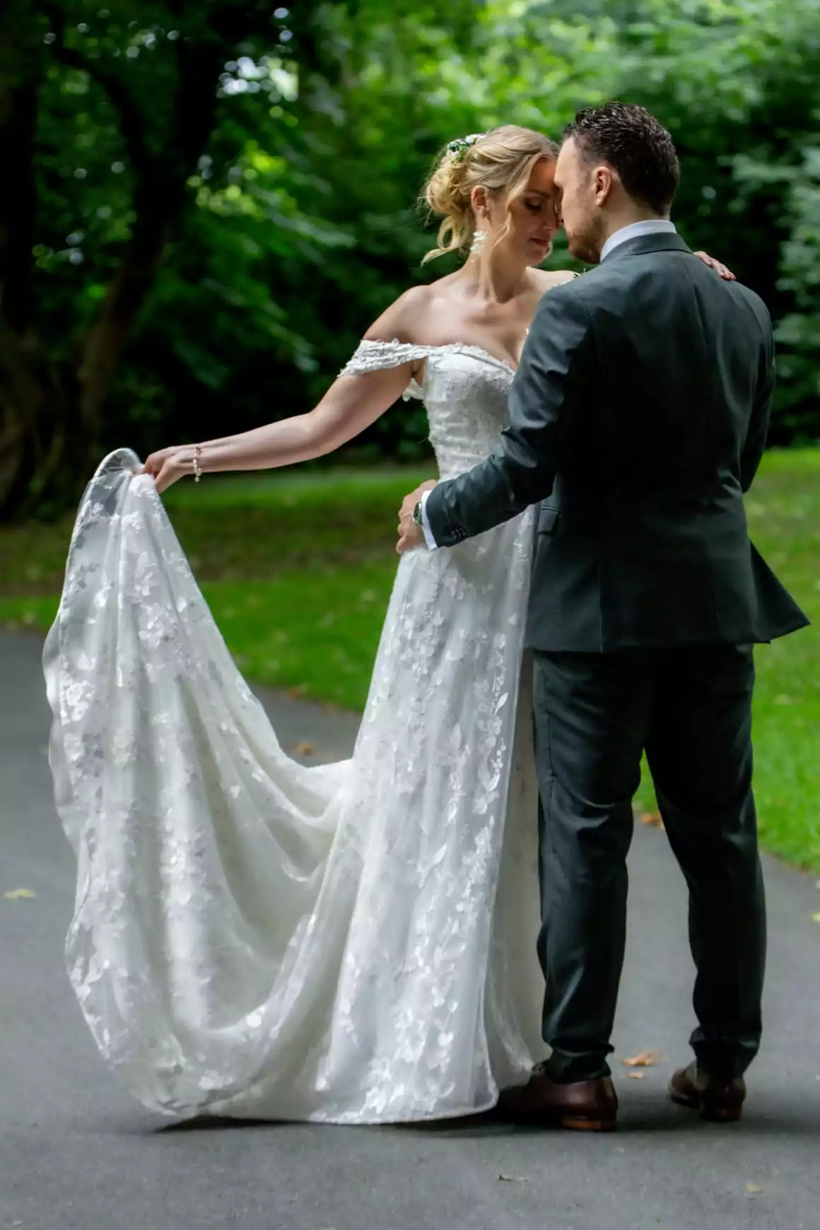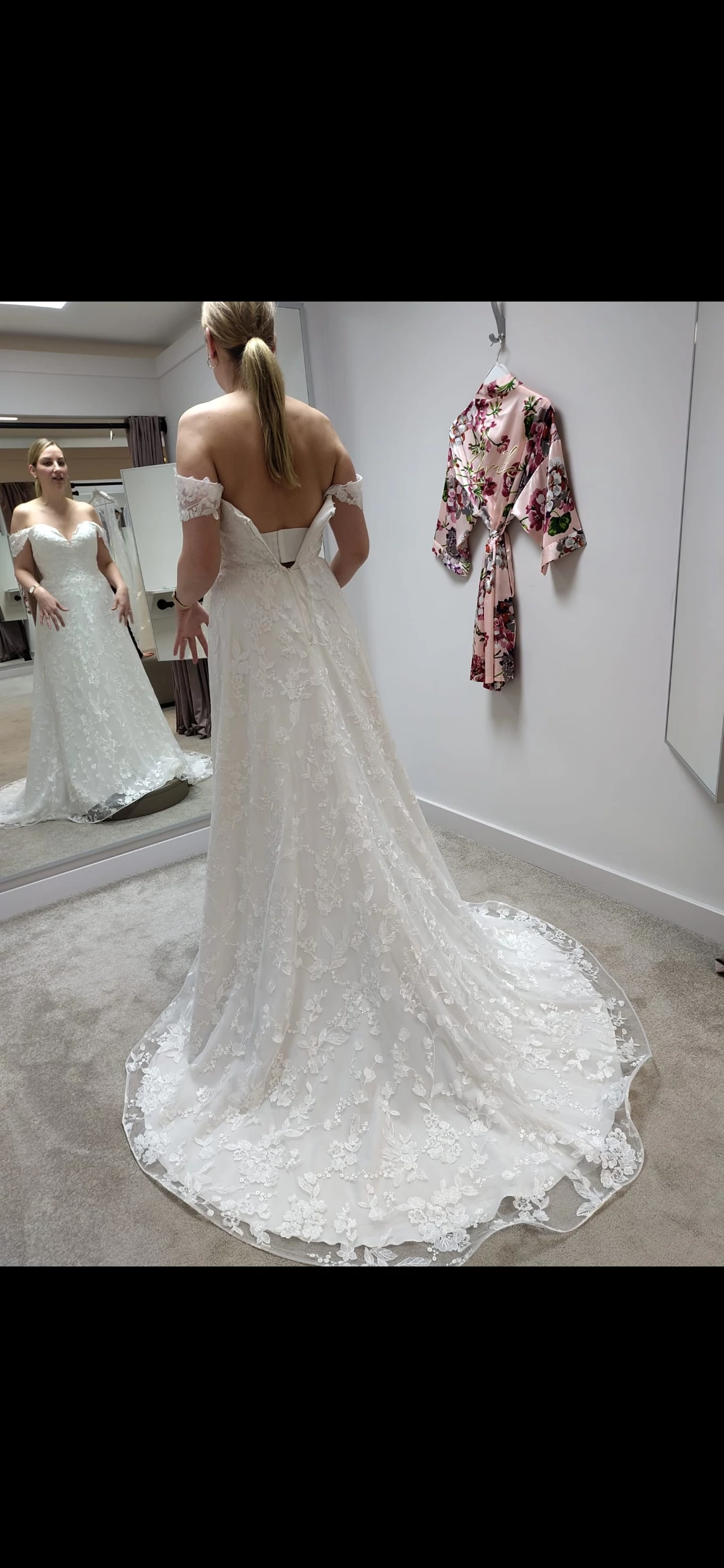 "Wunderschönes Spitzenkleid mit Schleppe und Carmen-trägern"