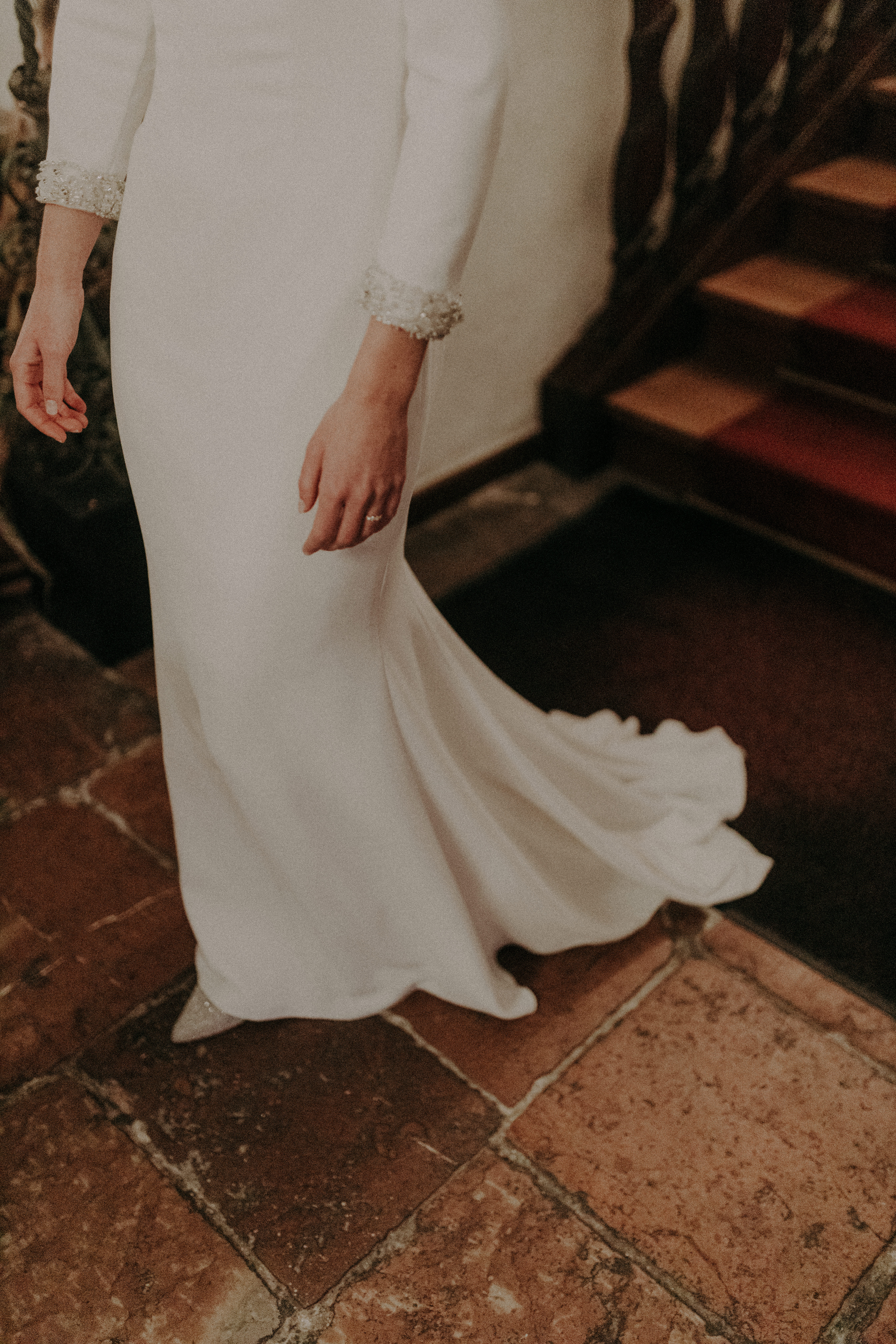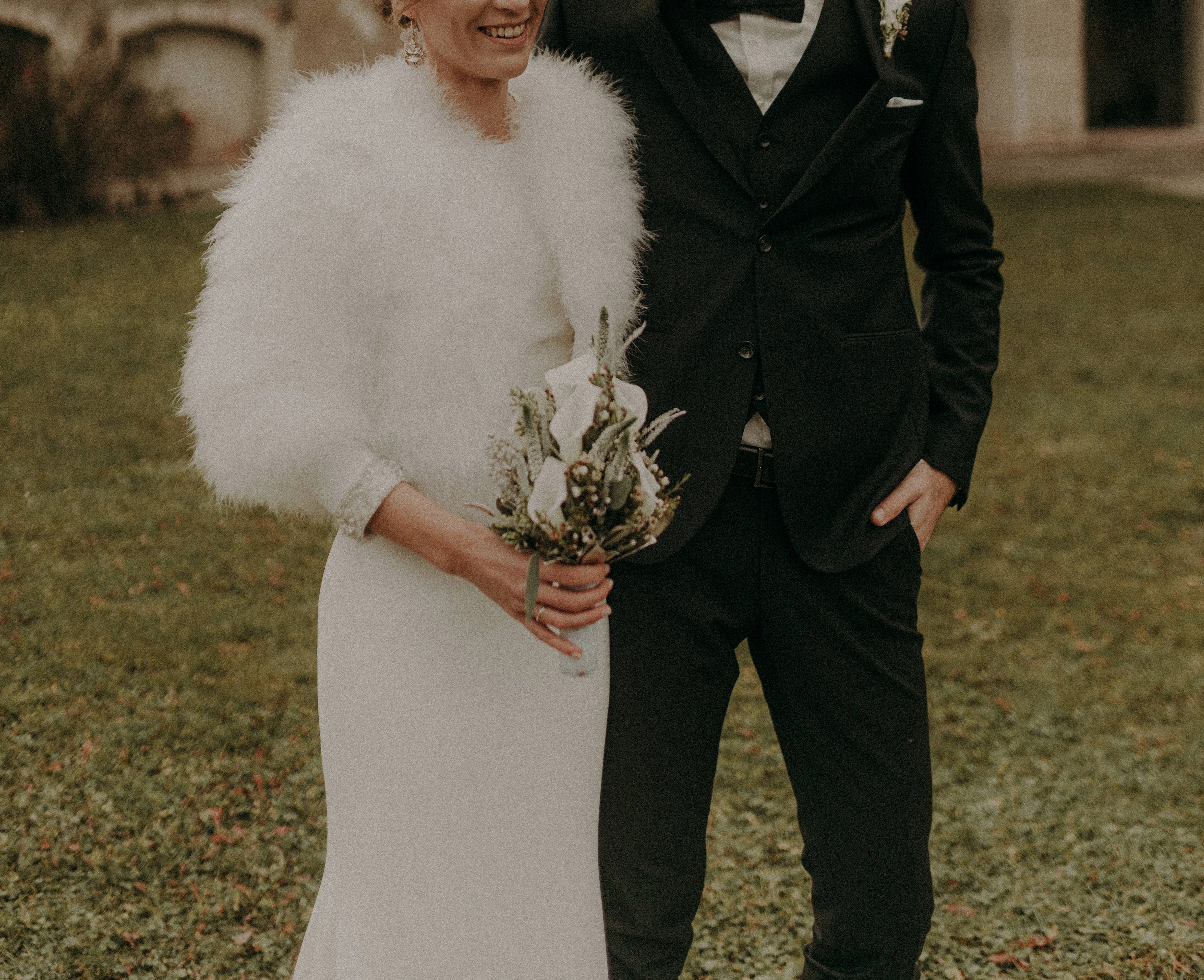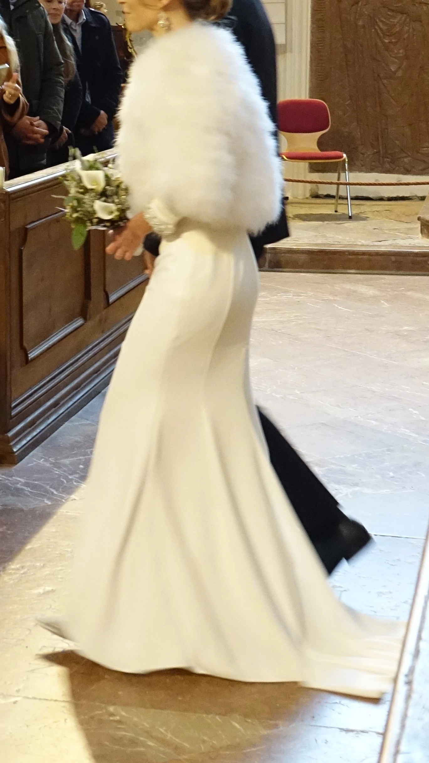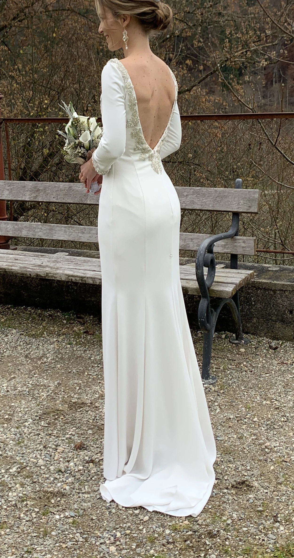 "Ich war lange auf der Suche nach einem Kleid, das sich für eine Winterhochzeit eignet. Zum Glück fiel mir dieses Kleid von Pronovias in die Hände, welches sich Dank der ursprünglich sehr langen Schleppe so abändern ließ, dass es zu meinem Traumkleid wurde. Die Schleppe wurde gekürzt und daraus 3/4 Ärmel mit besonderen Applikationen am Ende gezaubert. Somit ist dieses Kleid ein absolutes Unikat! Ein wenig Schleppe sollte es dann aber doch sein, welche sich zum Tanzen später sehr einfach hochknüpfen ließ.
