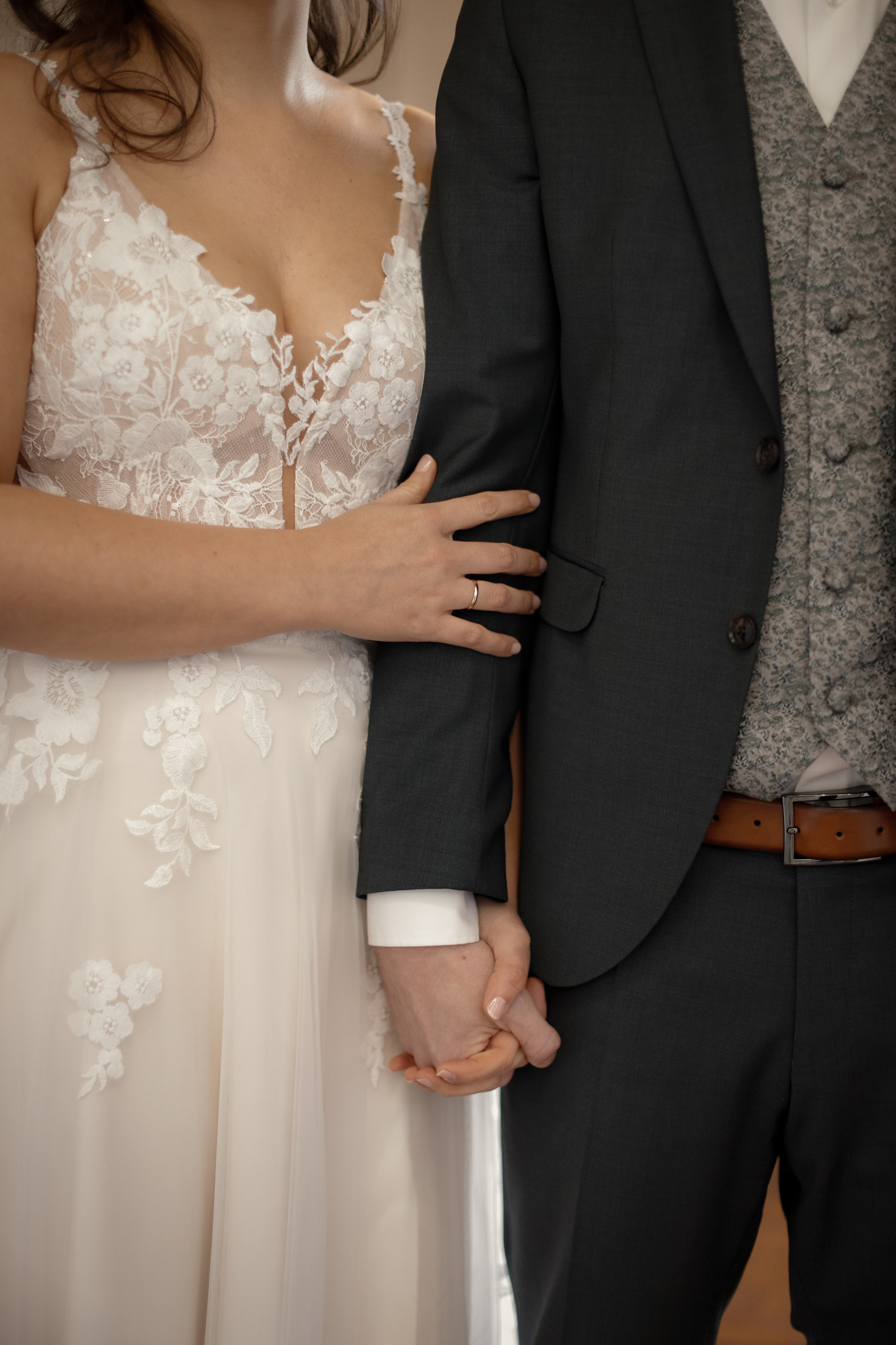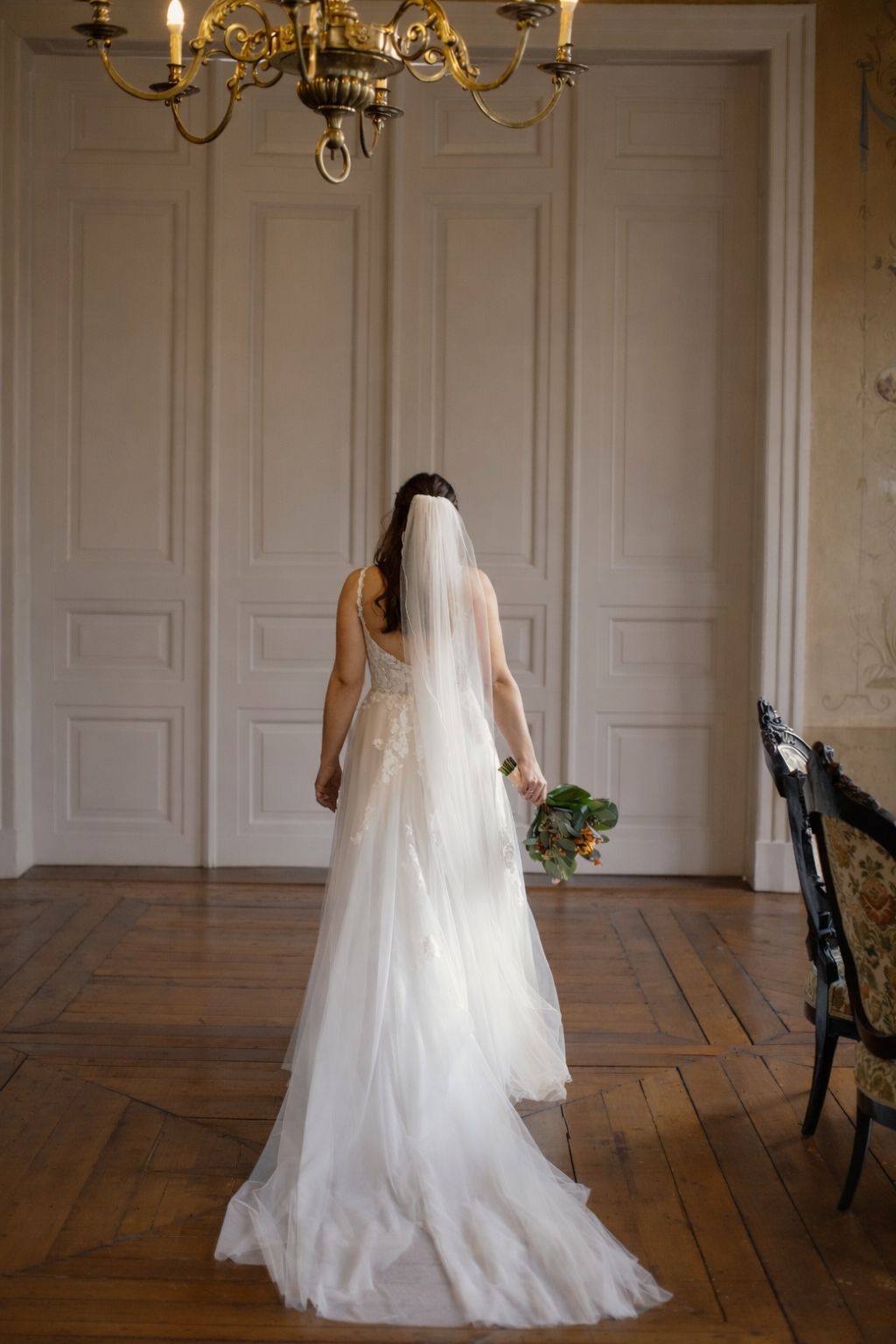 Besonderheiten: Die Schleppe kann mithilfe von zwei durchsichtigen Druckknöpfen unterhalb des Reißverschlusses hochgeknöpft werden. Perfekt für den Hochzeitstanz und die Party 🙂