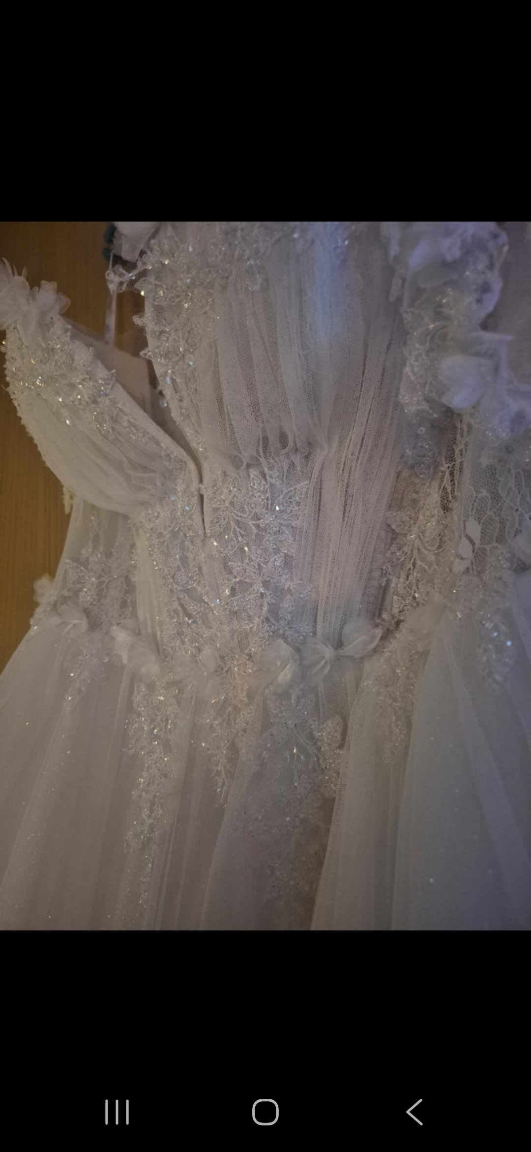 "Maßgeschneidert, mit Korsett zum Zuschnüren hinten, hochwertige Materialien, Prinzessinnenkleid. 1x getragen, nicht gereinigt, in gutem Zustand. Glitzert, wenn das Licht in einem bestimmten Licht fällt. Größe 42-46. "
