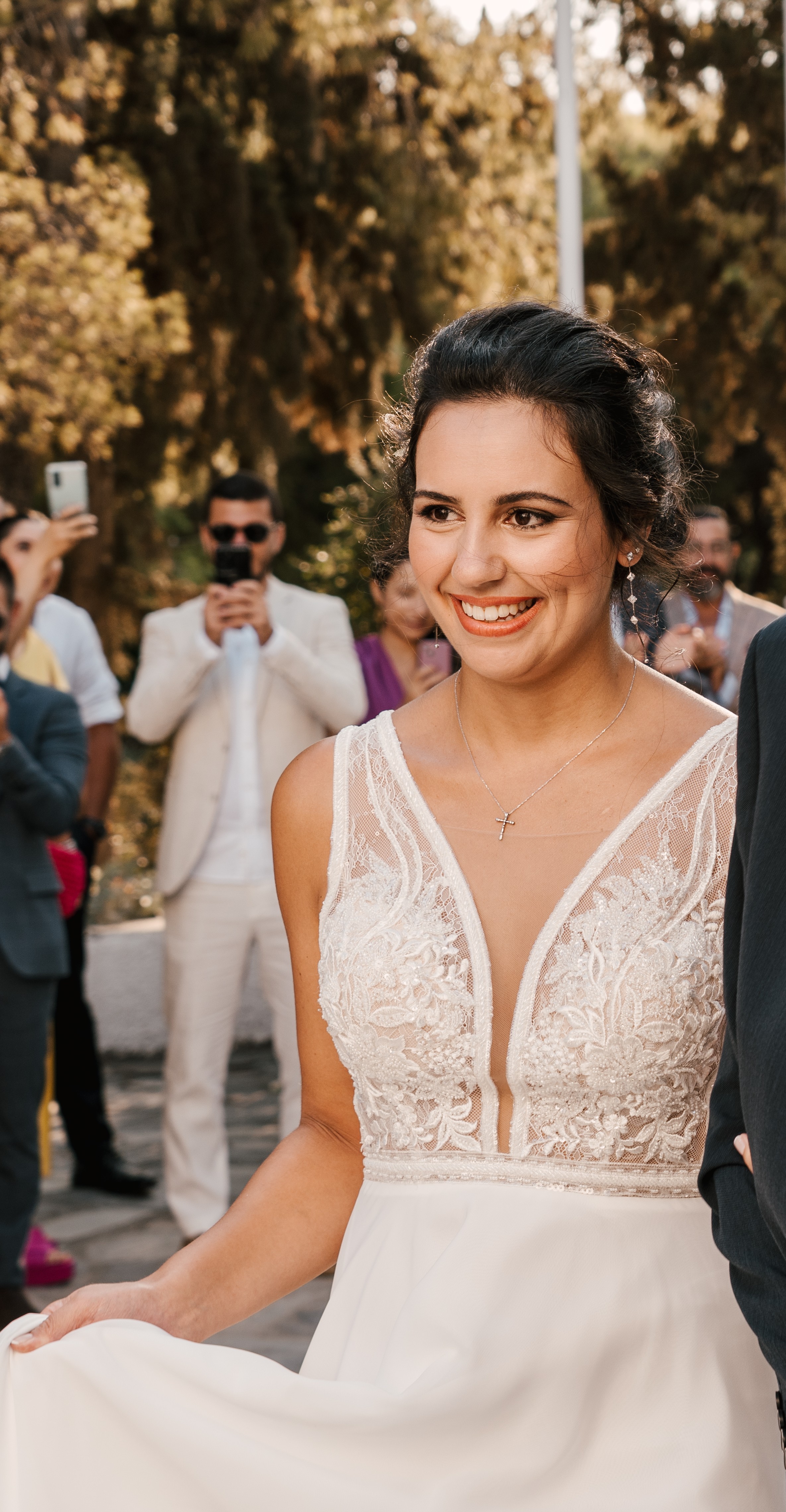 "Das Brautkleid hat einen sehr langen, glatten Rock aus feiner Musselin-Stoff. Der obere Teil des Kleides ist etwas ganz Besonderes: halbtransparent, mit vielen wunderschönen, funkelnden Details und einem eleganten Ausschnitt. Das Zusammenspiel von schlichter Eleganz im Rock und der kunstvollen, glitzernden Oberpartie verleiht dem Kleid einen edlen und romantischen Charakter. Das Brautkleid habe ich in einem Atelier in Madrid gekauft in 2022."