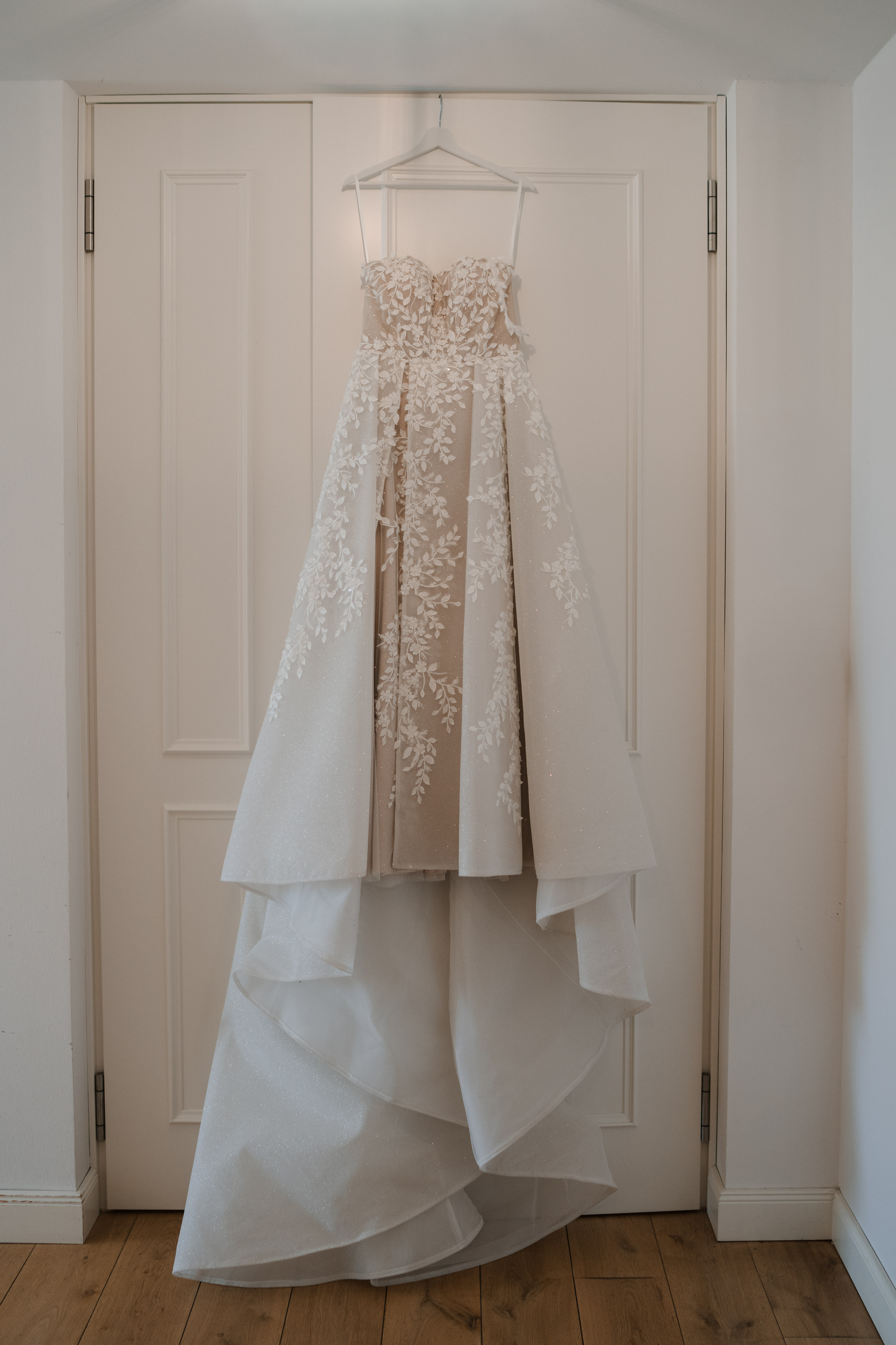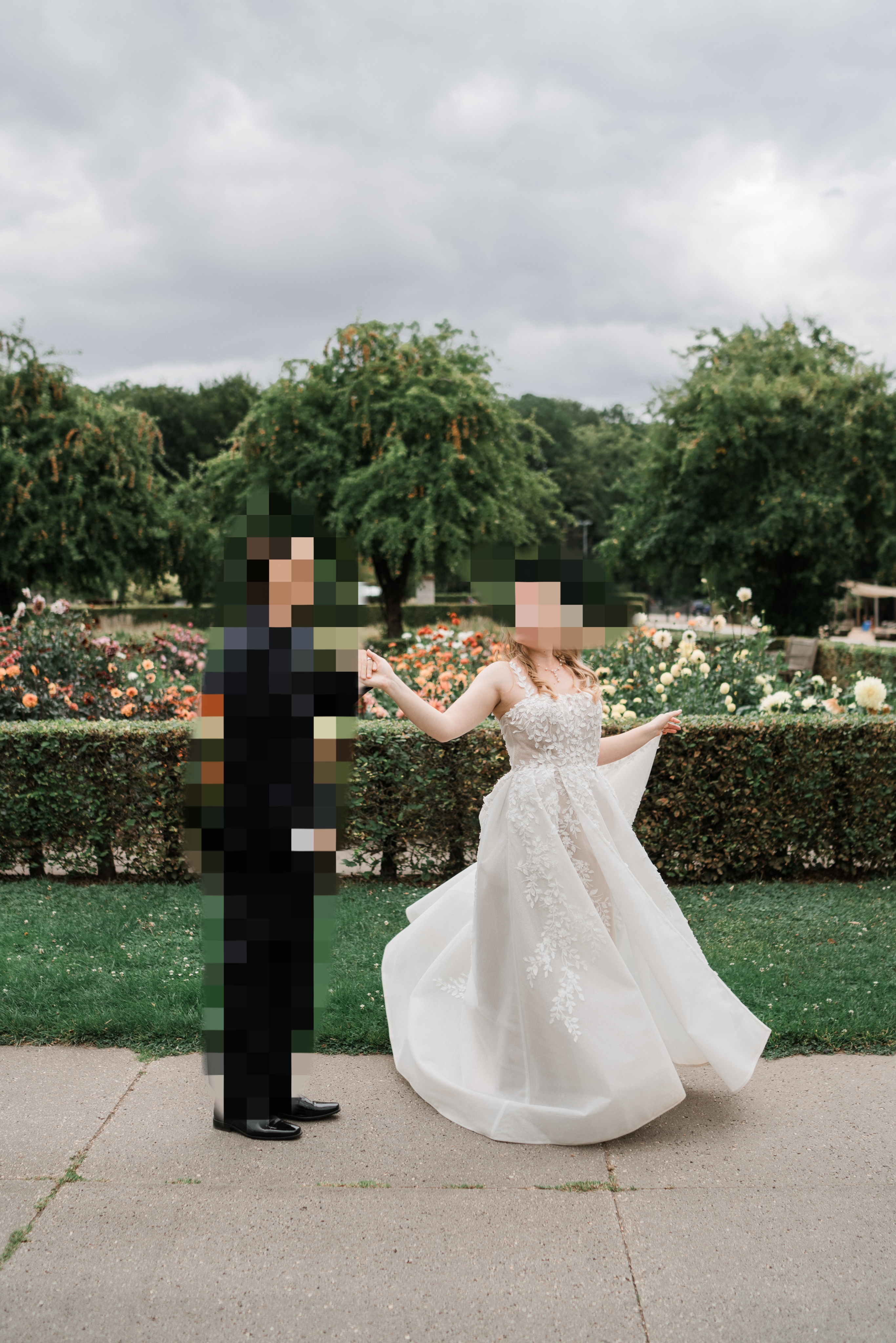 "Das Kleid hat nur eine Lage Tüll und die ist sehr steif, weshalb sie immer perfekt fällt und nicht gerichtet werden muss. Unten drunter ist eine zweite Lage Stoff, die das Tragen super angenehm macht. An einer Schlaufe kann das Kleid mit den Fingern gehalten werden. "