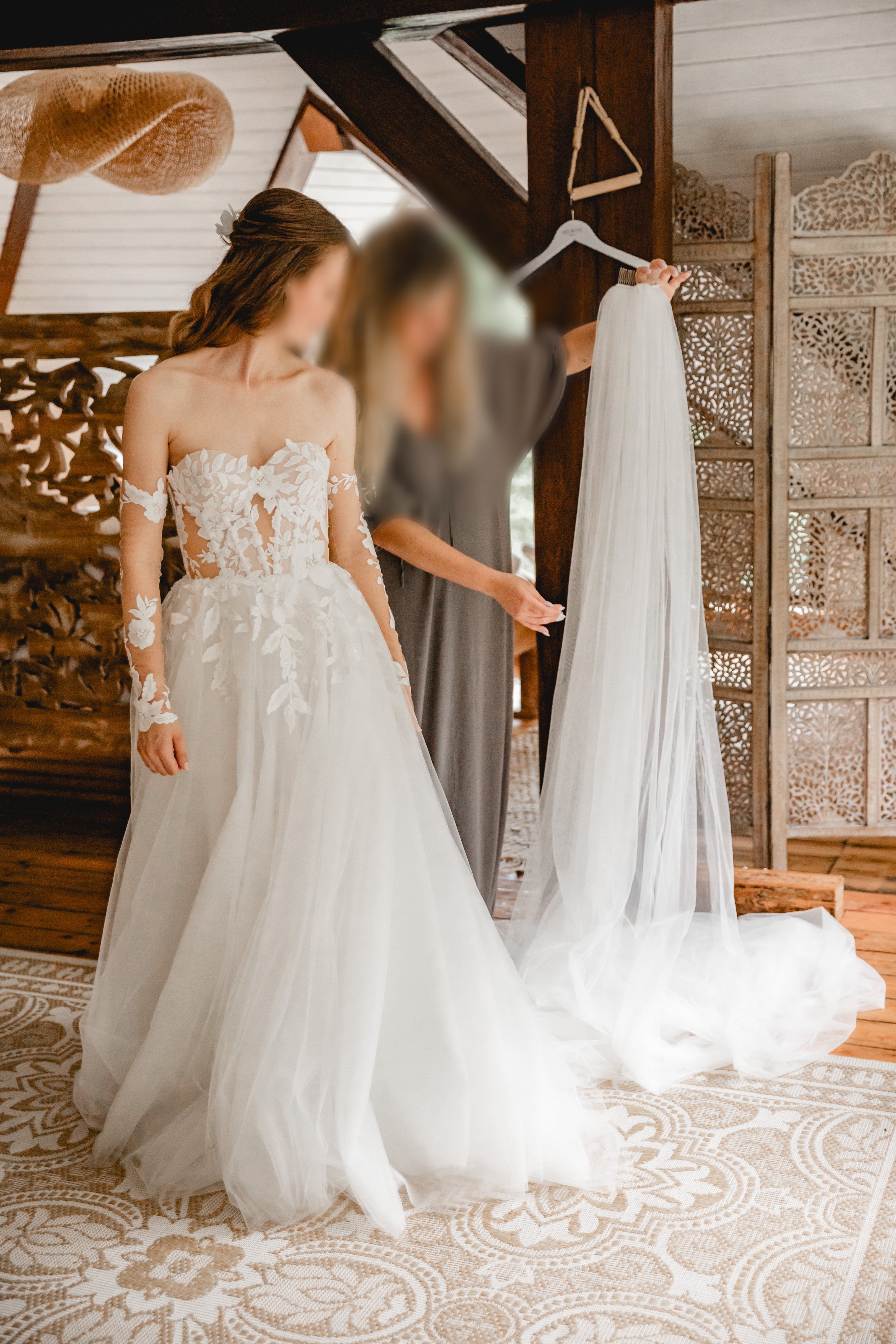 "Die Kombination aus romantischen, verzierten Elementen und den modernen transparenten Anteilen machen es einzigartig. Der Tüllrock und die eleganten Sleeves (für die Arme) sorgen für den Wow Effekt. Als weitere Option gibt es noch Carmen Träger zum anknüpfen (statt der Sleeves).