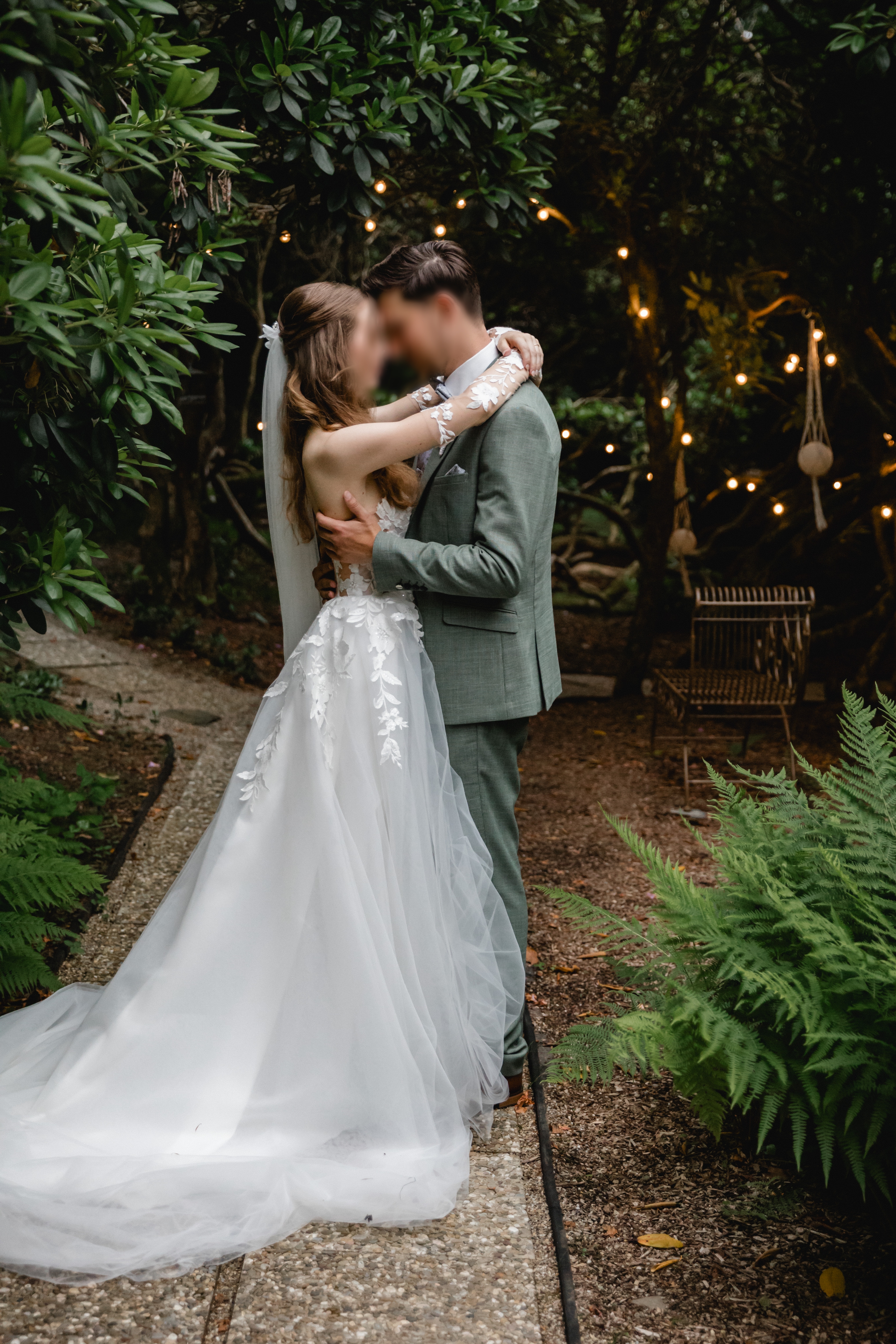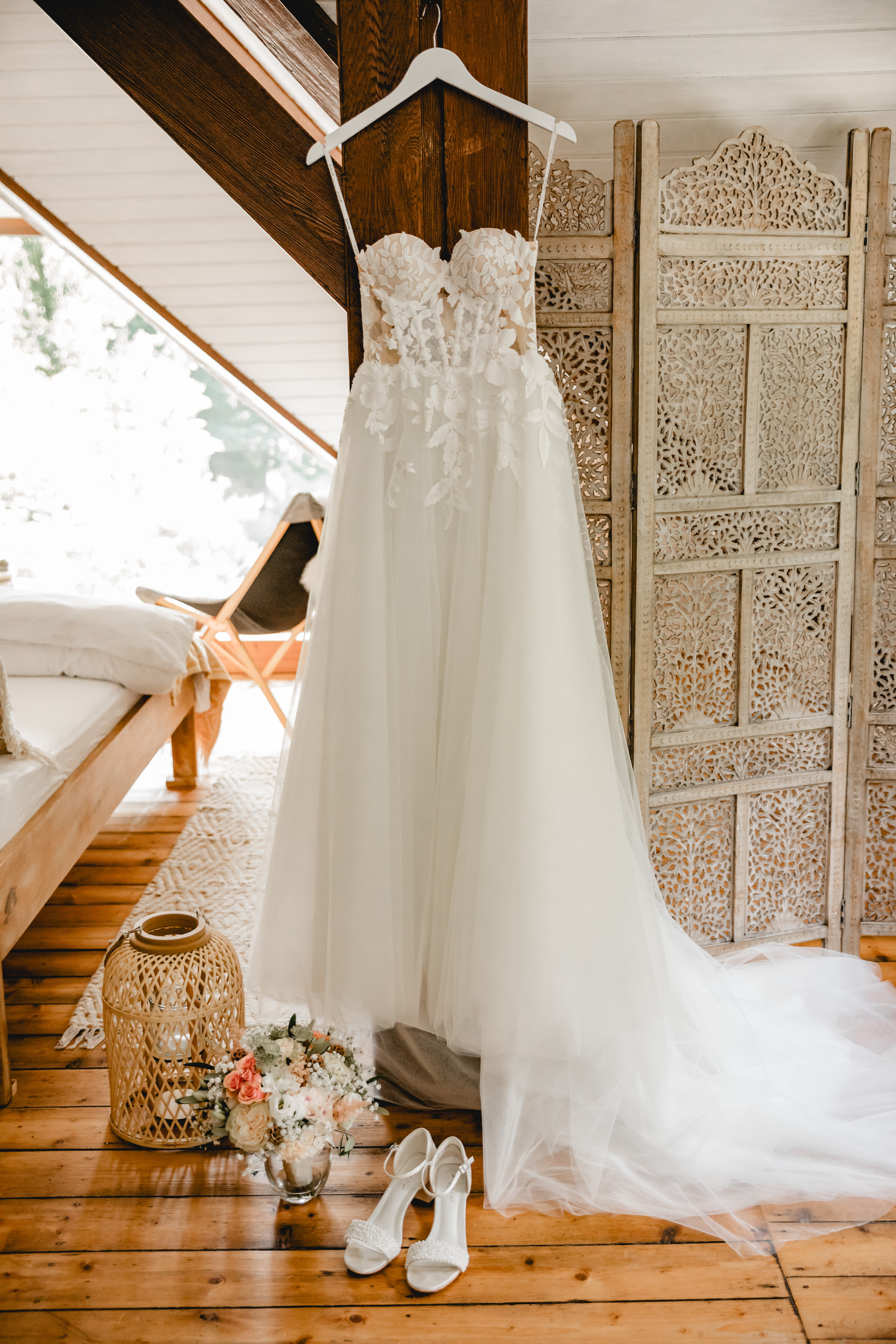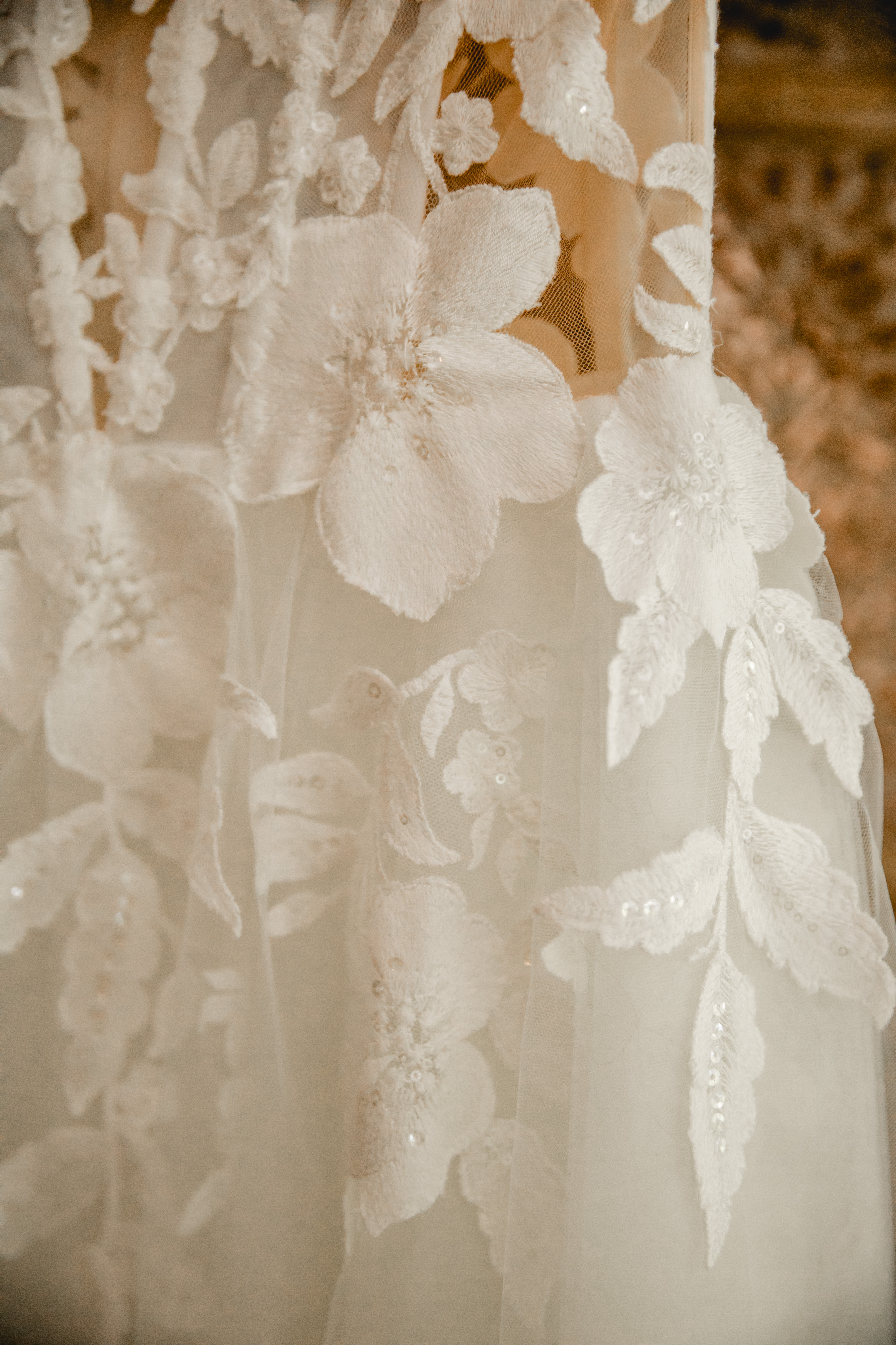 Es ist eine A-Linie mit halbtransparenter Corsage, die mit einer leicht glitzernden Blumenspitze verziert ist. Die dazugehörigen Sleeves (für die Arme) zaubern einen vollständigen, romantischen Look. Die Schleppe ist ein weiteres Highlight und kann auch hochgesteckt (mit Knöpfen befestigt) werden. Im Originaldesign ist der Tüllrock mit Glitzer, ich habe ihn allerdings ohne bestellt, für einen puren, matten Effekt und damit das Oberteil im Fokus ist. Die Corsage hat auch etwas mehr Spitze als das Original, da ich alle Corsagenstäbe verdeckt haben wollte :).