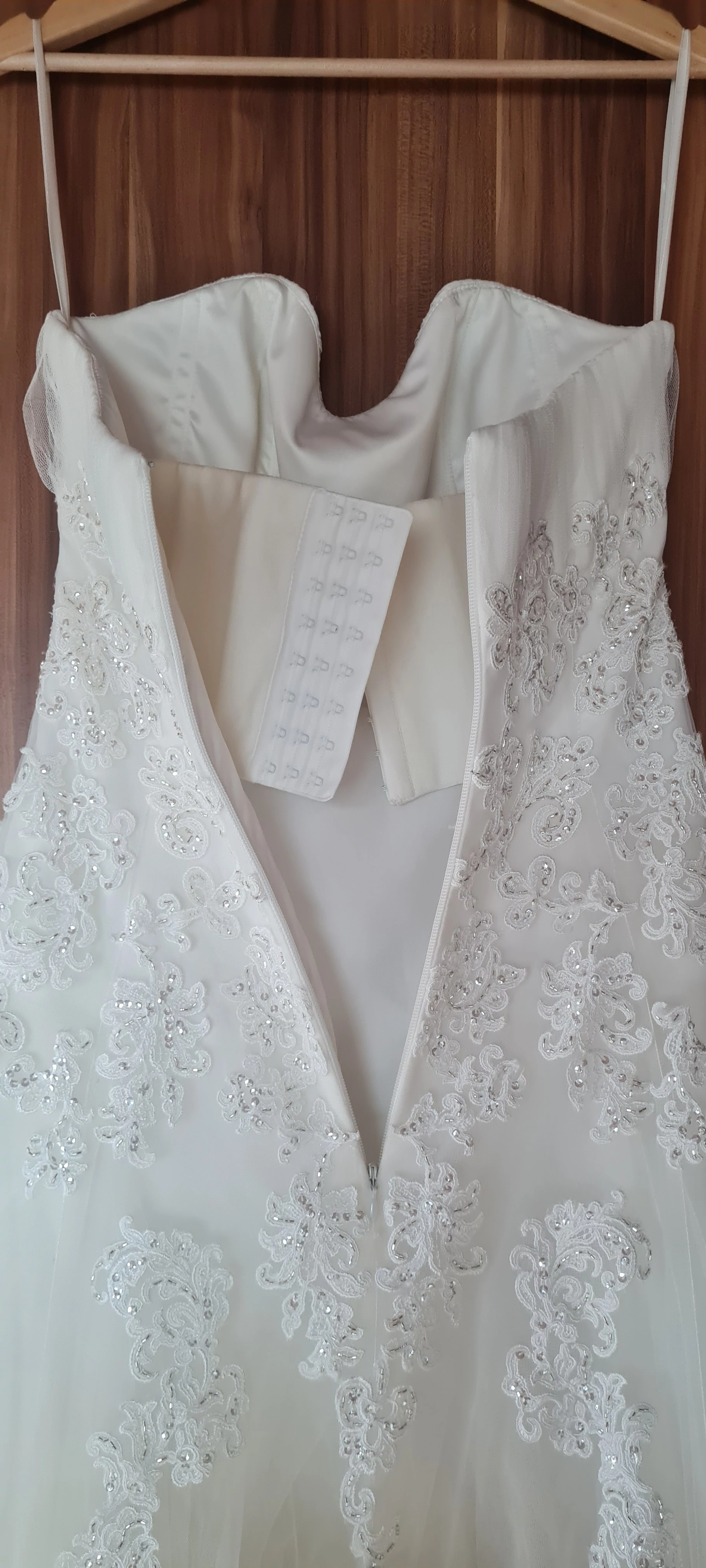 "Mein Kleid war sehr angenehm zu tragen, auch wenn es durch den grossen Reifrock und die Schleppe etwas ausladender war. Obwohl es trägerlos ist, brauch man keine Angst haben dass etwas rutschen könnte. Im Oberteil ist ein Korsett mit Gummizug eingenäht, hier ist auch kein BH zwingend notwendig.