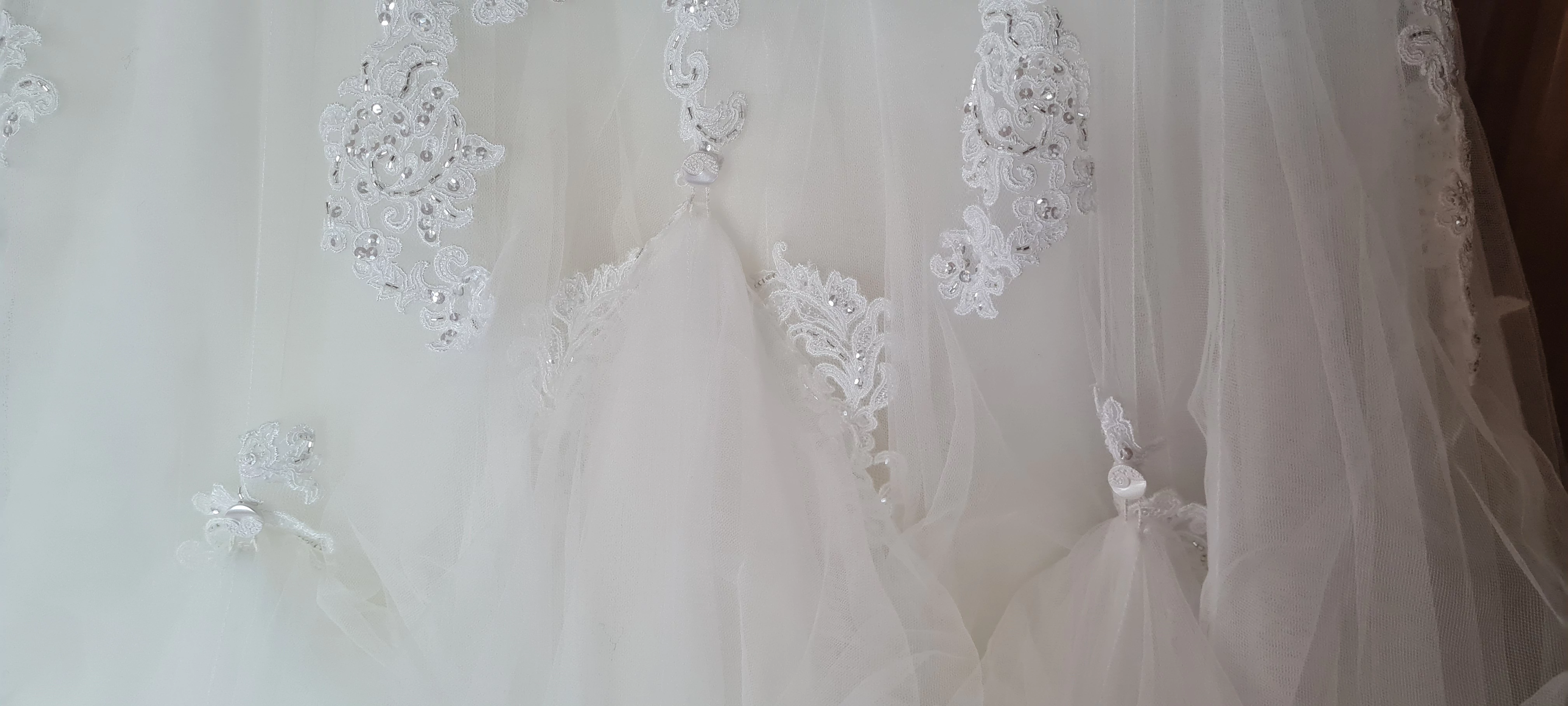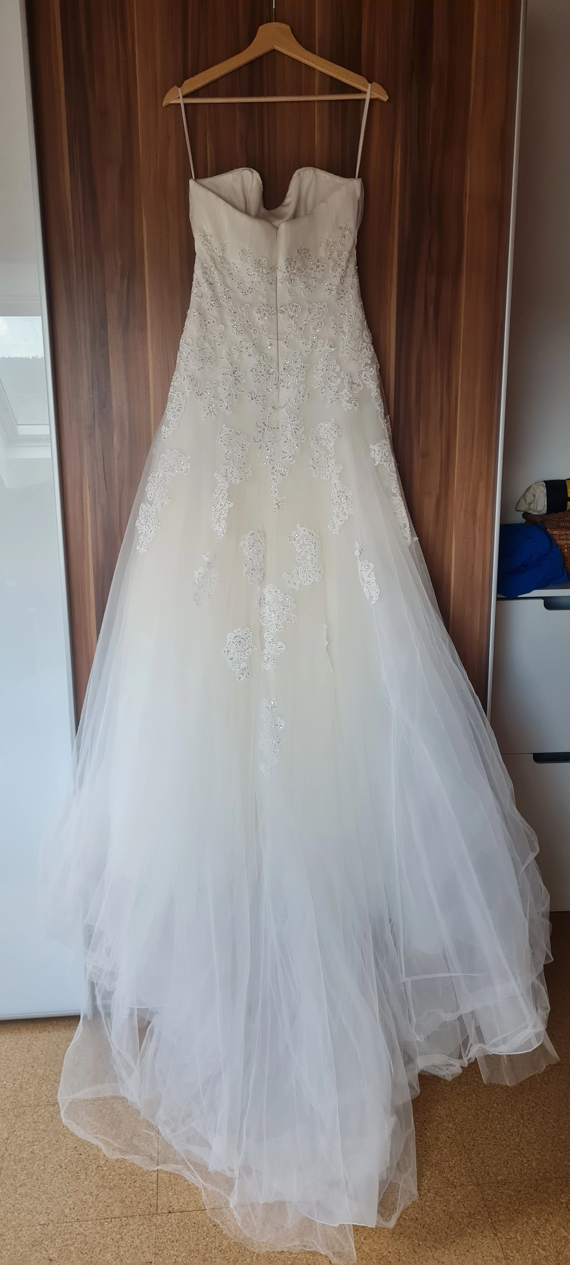 Die Schleppe kann hinten mit drei Knöpfen "hochgehängt" werden, was beim tanzen ganz hilfreich ist.