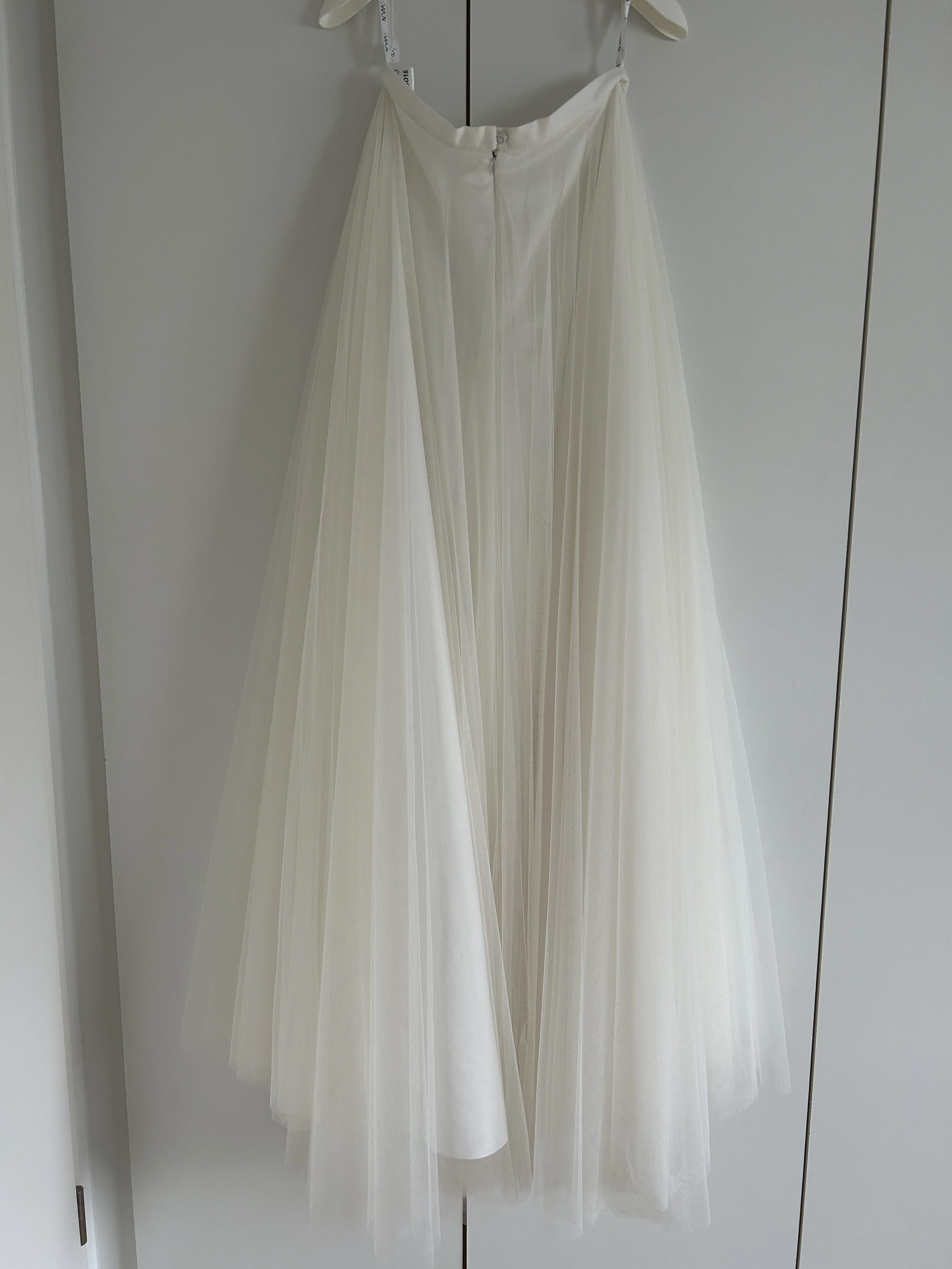 Der Rock zaubert im Handumdrehen eine traumhafte Silhouette – ganz ohne Reifrock – und lässt sich vielseitig kombinieren: ob mit einem feinen Spitzenoberteil, einem schlichten Top oder einem gemütlich-eleganten Hochzeitspulli für eine moderne Winterhochzeit.