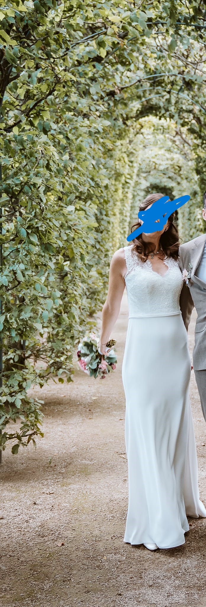 "Durch den weichen Stoff passt sich das Kleid an die Körperform an. Oben ist es aus Spitze und unten aus einem glatten Satinstoff mit einer kleinen Schleppe."
