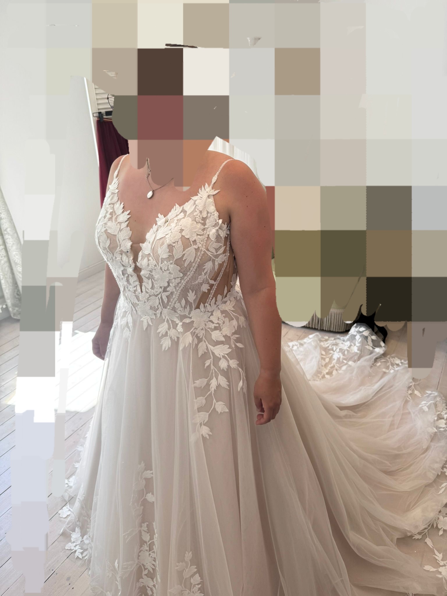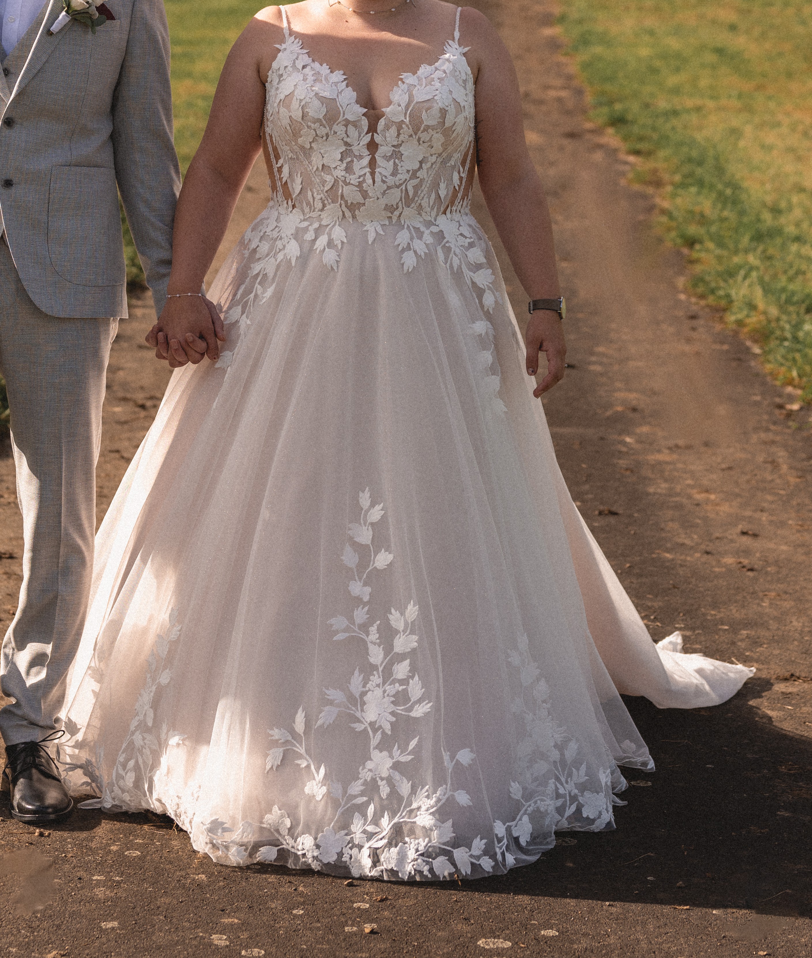 "Ich verkaufe mein geliebtes Brautkleid, da es eindeutig zu schade ist um auf dem Dachboden einzustauben. Ich habe es geliebt das es einen wunderschönen weiblichen Körper macht auch bei größeren Rundungen. Außerdem hat es mich etwas größer gemacht als ich bin (Körpergröße 160cm) ich habe Absätze mit ca. 5cm getragen, entsprechend wurde das Kleid geschneidert. Es hat einen tiefen Rückenausschnitt und eine lange Schleppe. Die Spitze vom Oberteil wird im Rock durch Tüll unterbrochen und findet sich dann am Saum wieder. Die Schleppe kann man hochstecken und somit ist das Kleid auch super zum Party machen geeignet. Dazu passend verkaufe ich einen Reifrock und den passenden Schleier."