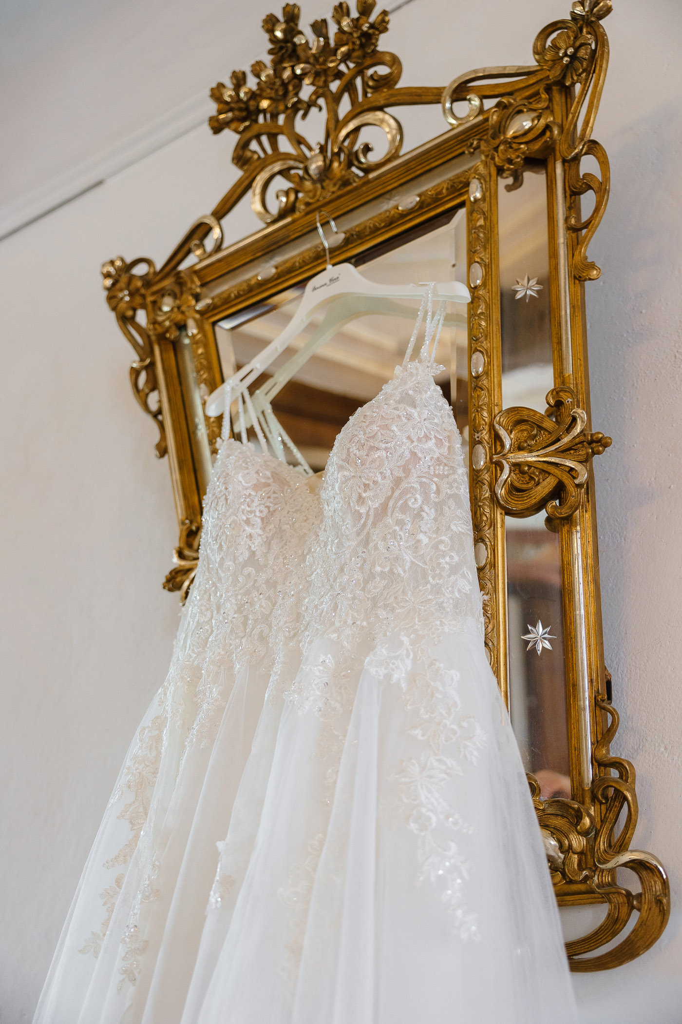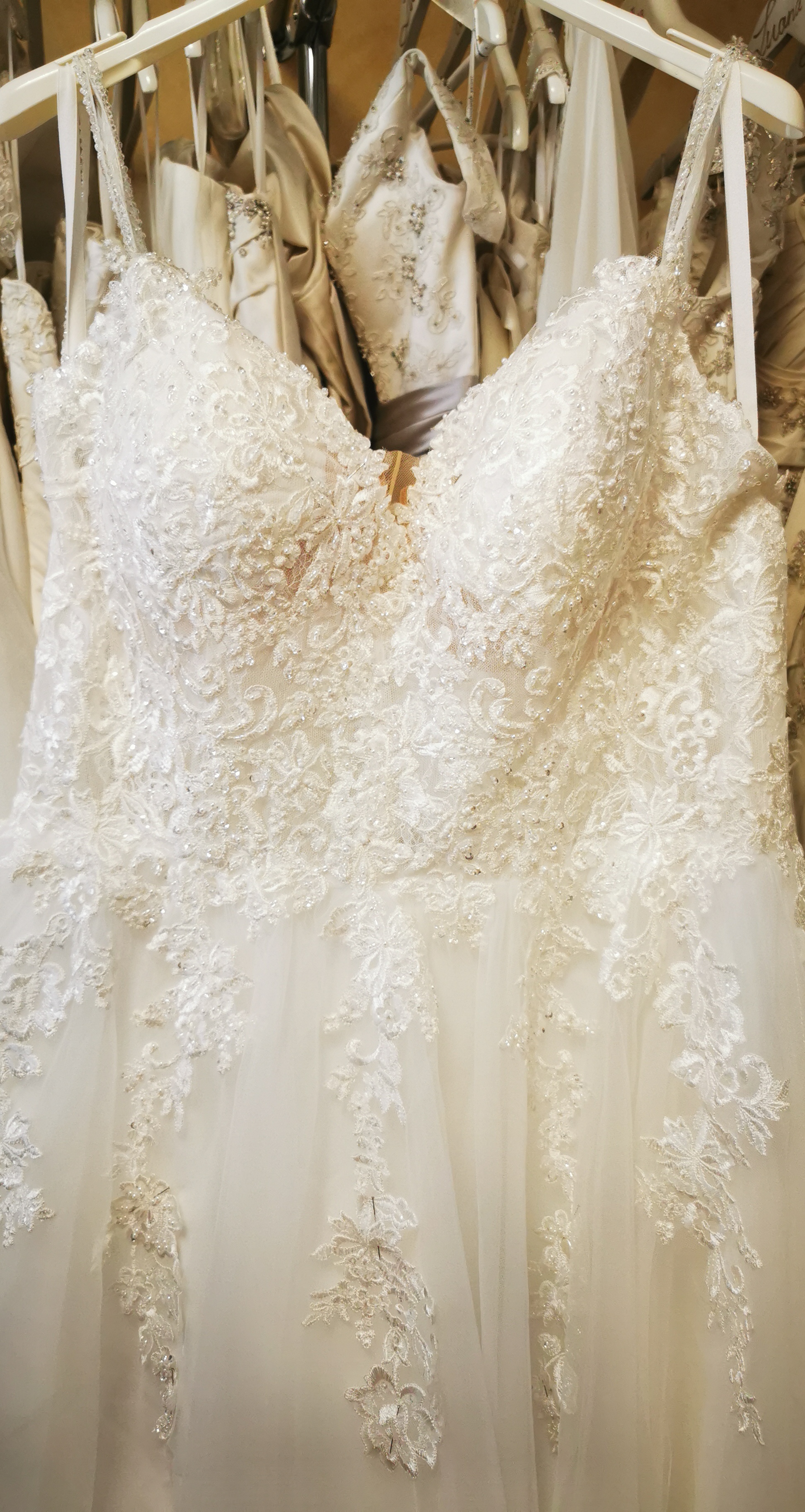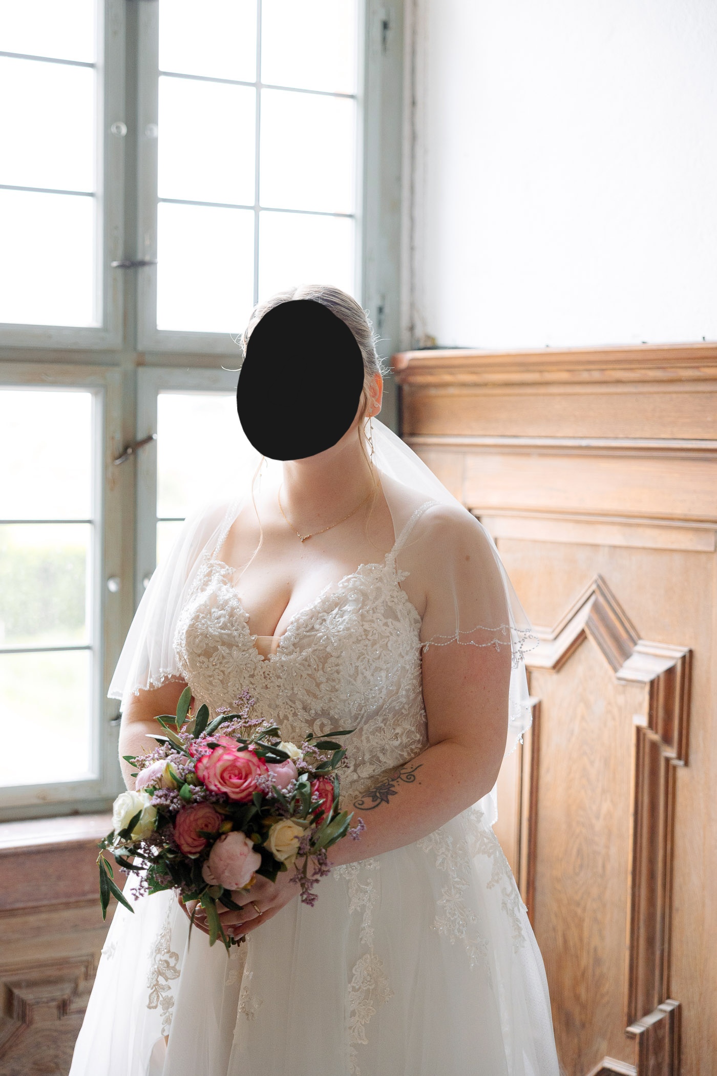 "Ivory Prinzessinnenkleid mit toller Spitze, Glitzer Details, langer Schleppe und zusätzlich angenähten Ornamenten (8 Stück). Das Kleid besitzt auf der rechten Seite einen Schlitz und eine Handschlaufe für die Schleppe. Zusätzlich wurde auch noch ein Knopf angenäht, sodass die Schleppe hoch geknöpft werden kann. Das Kleid wurde gereinigt und gebügelt. "