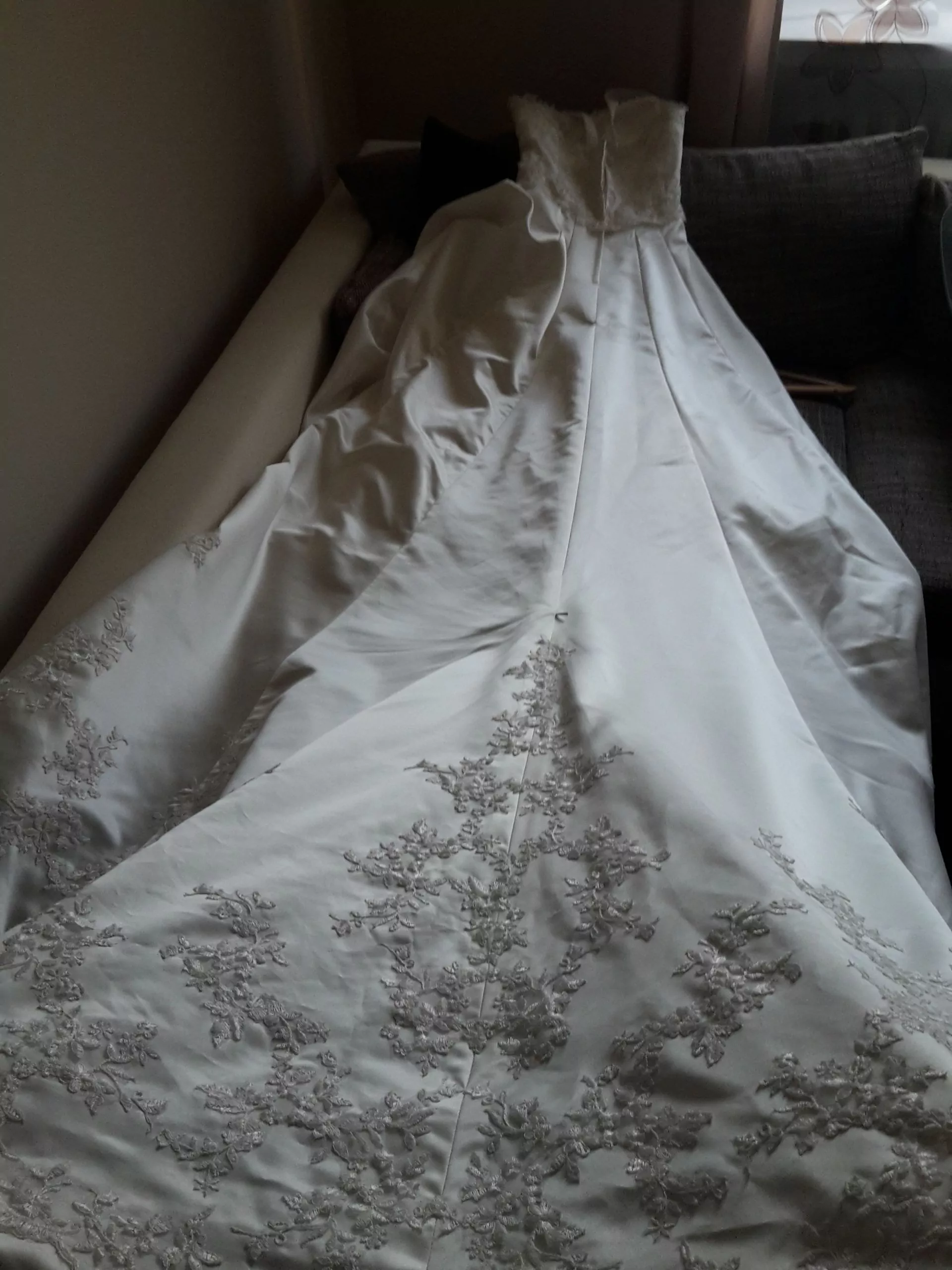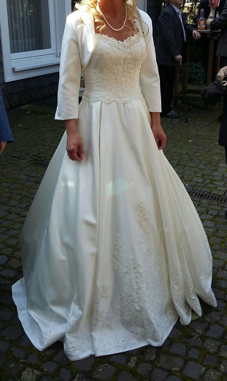 "Brautkleid in einem Neuwertigen Zustand, mit langer Schleppe. Die Schleppe kann man am hinteren Teil des Kleid hoch knöpfen.Träger nachträglich dran gekommen,somit auch wieder abnehmbar. Das Kleid ist an der Taille etwas enger genäht worden,somit auch wieder weiter zu machen.