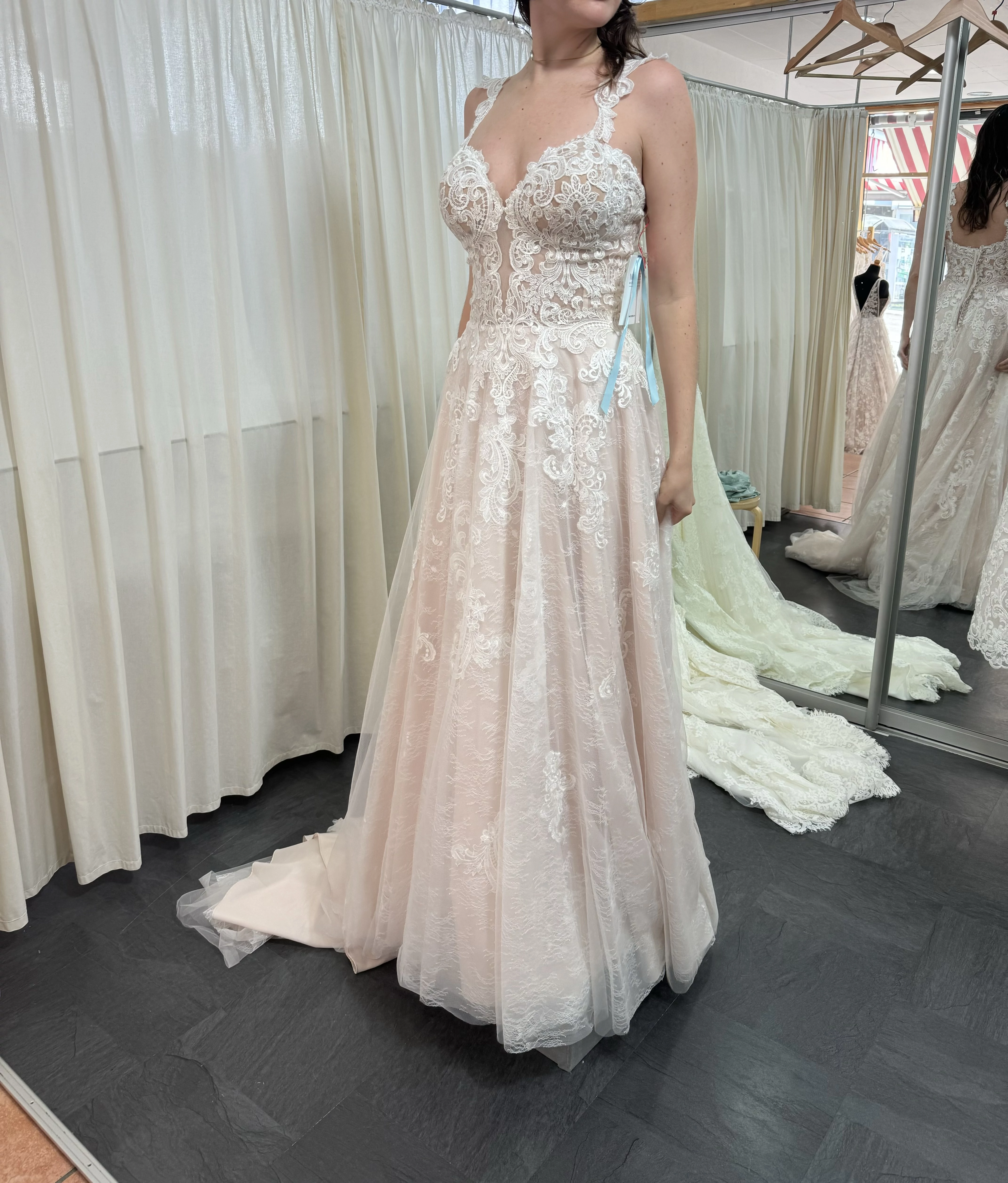 "Aus persönlichen Gründen muss ich das neue, ungetragene und unveränderte Kleid leider verkaufen. Das Kleid ist wunderschön und romantisch und ich bin mir sicher dass ich damit eine andere Braut glücklich machen kann. Ich trage in der Regel Größe 36 sodass hinten das Kleid noch angepasst werden müsste.