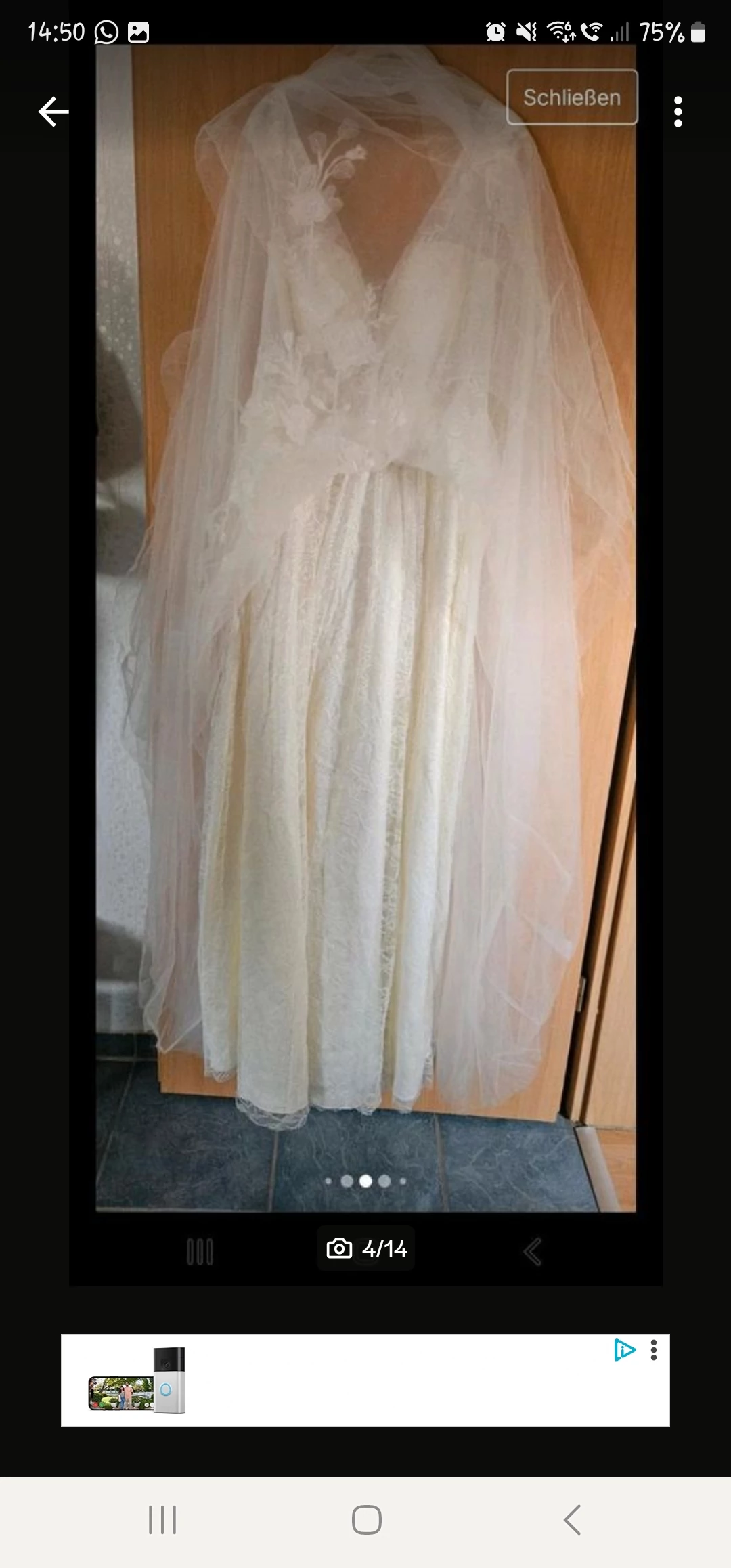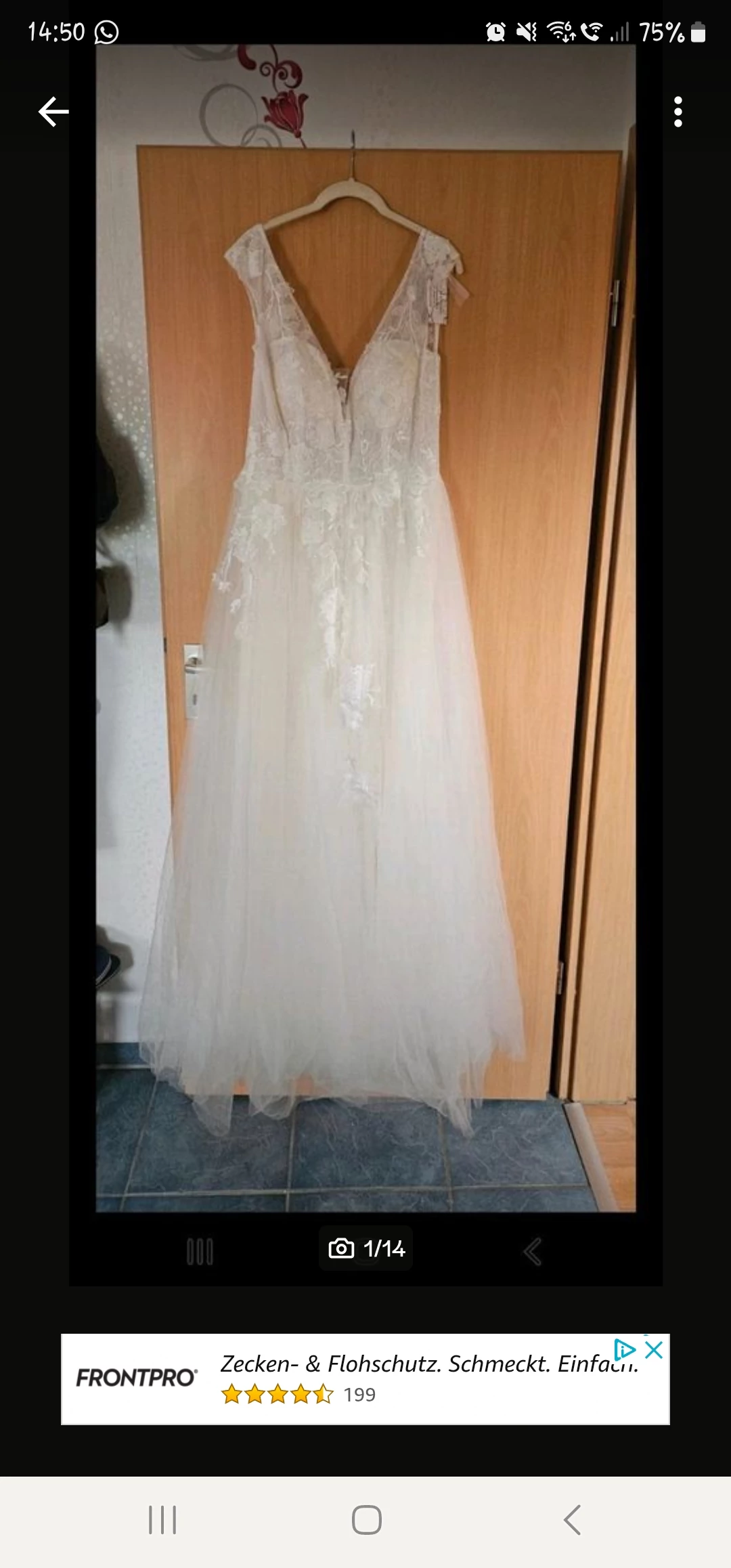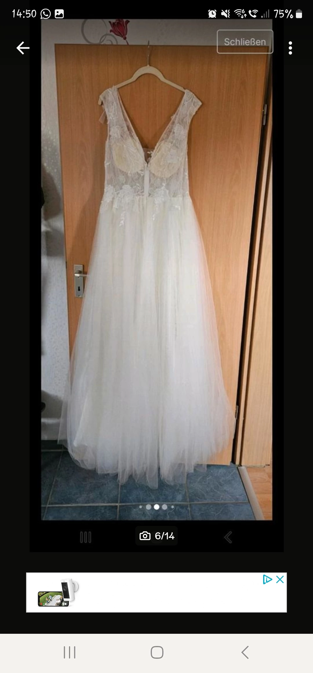"Das Kleid ist mir im Laden sofort ins Auge gesprungen, es hatte alles was ich wollte: Tüll, etwas Glitzer, aber eben nicht zu viel von allem. Und es war in meinem Budget! Bei der Anprobe passte es dann perfekt, das Kleid war wie für mich gemacht. Man kann sich darin super bewegen, also bestimmt auch tanzen. Leider kann ich dies nicht bezeugen, und weiß auch nicht wie es mit passenden Schuhen und Schmuck aussieht (aber bestimmt großartig).Die Hochzeit hat nämlich leider nie stattgefunden. Deswegen hoffe ich, dass eine Bald-Braut dieses Kleid sieht und sich genauso darin verliebt, und es dann auch wirklich auf einer tollen Hochzeit getragen wird. "