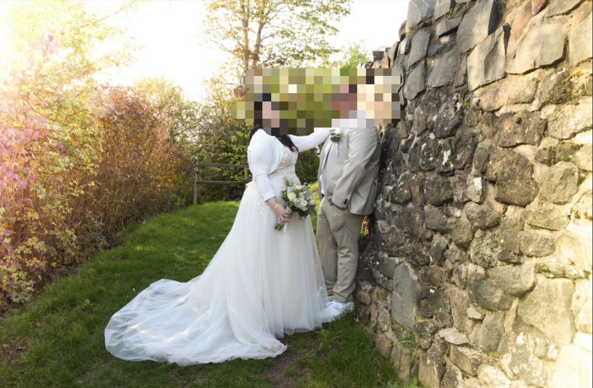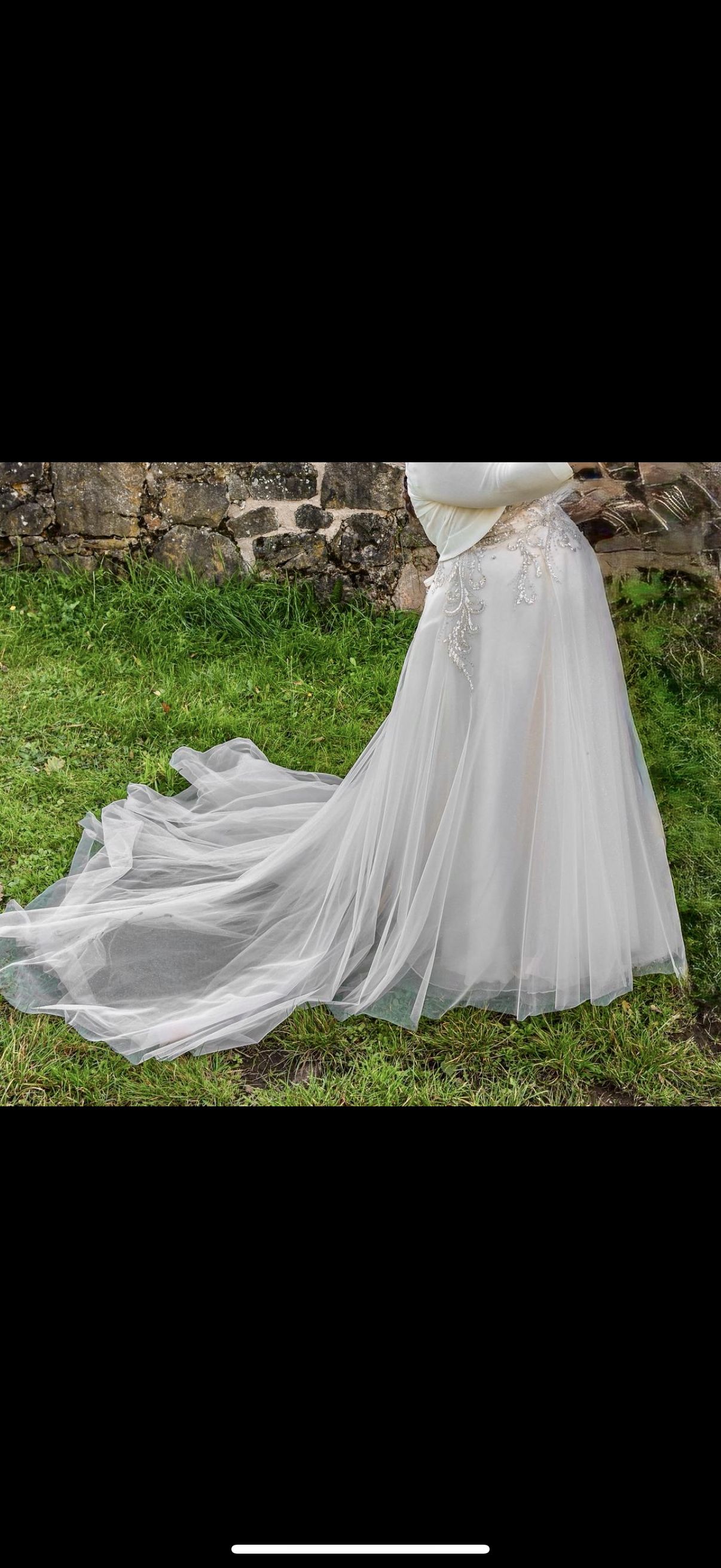 "Wir haben wunderschöne Bilder gemacht bekommen mit diesen tollen Kleid da es eine lange Schleppe hat (die auch mit dem angebrachten Knopf hoch gesteckt werden kann das man es nicht schleift oder gemütlicher sitzen kann) leider zu schade es im Kleiderschrank hängen zu lassen da ich fest der Überzeugung bin das es eine andere Frau genauso wie mich glücklich machen kann am schönsten Tag im Leben. "