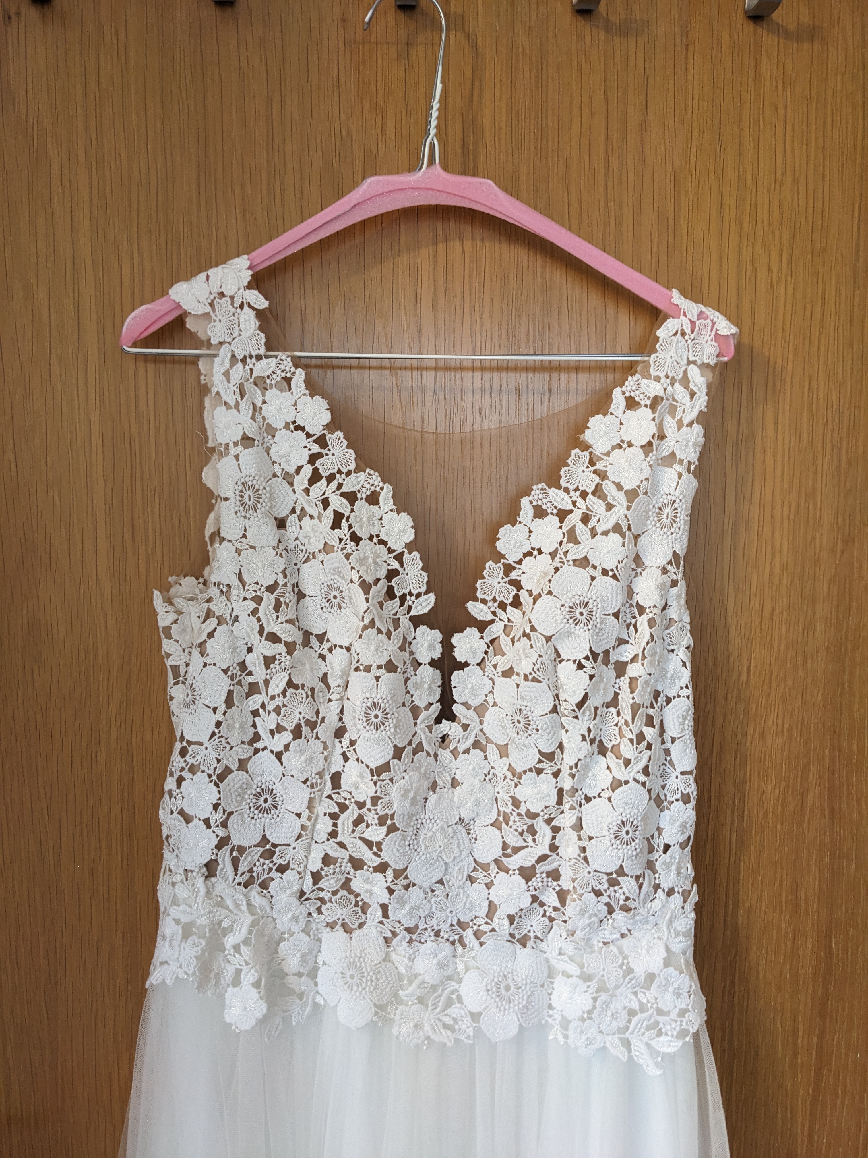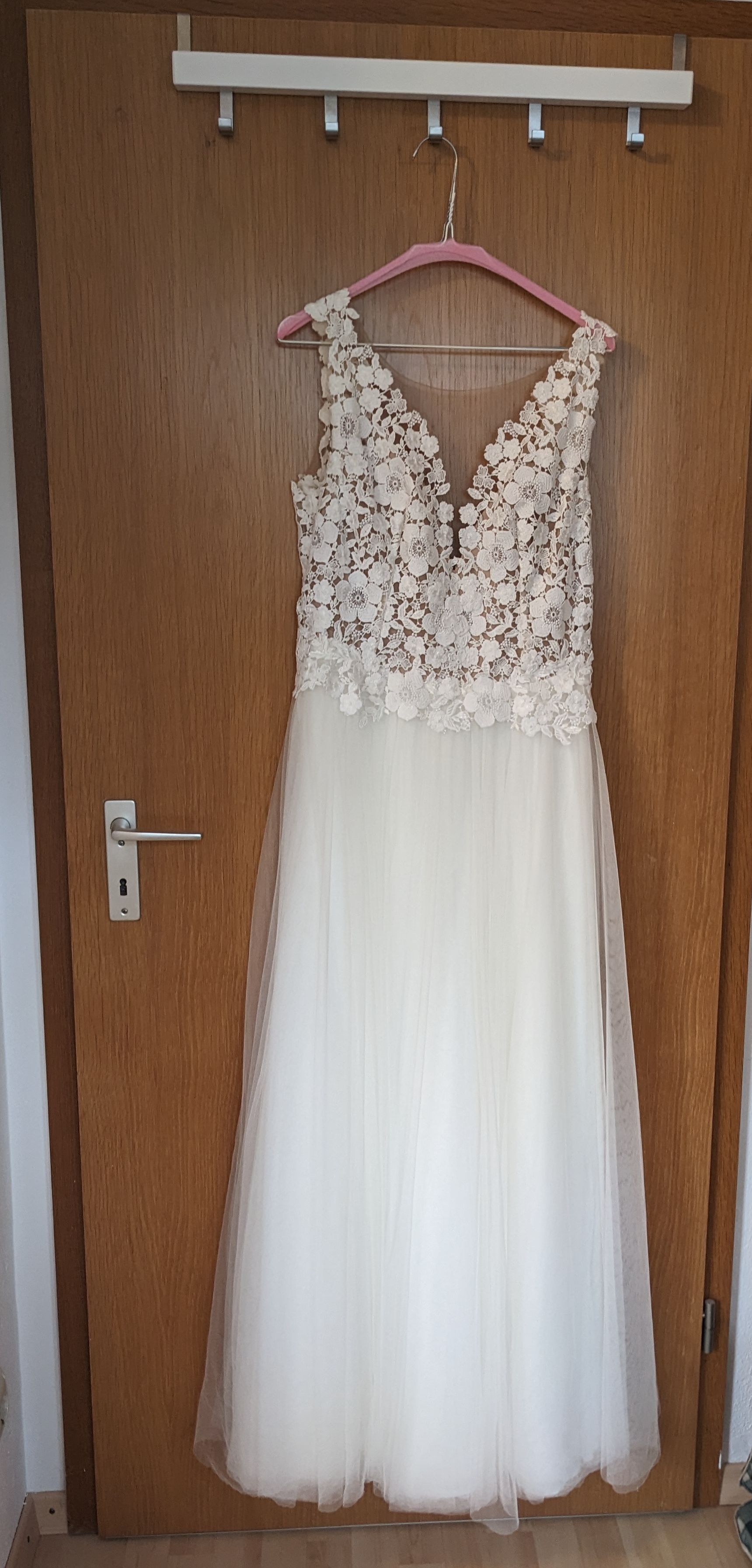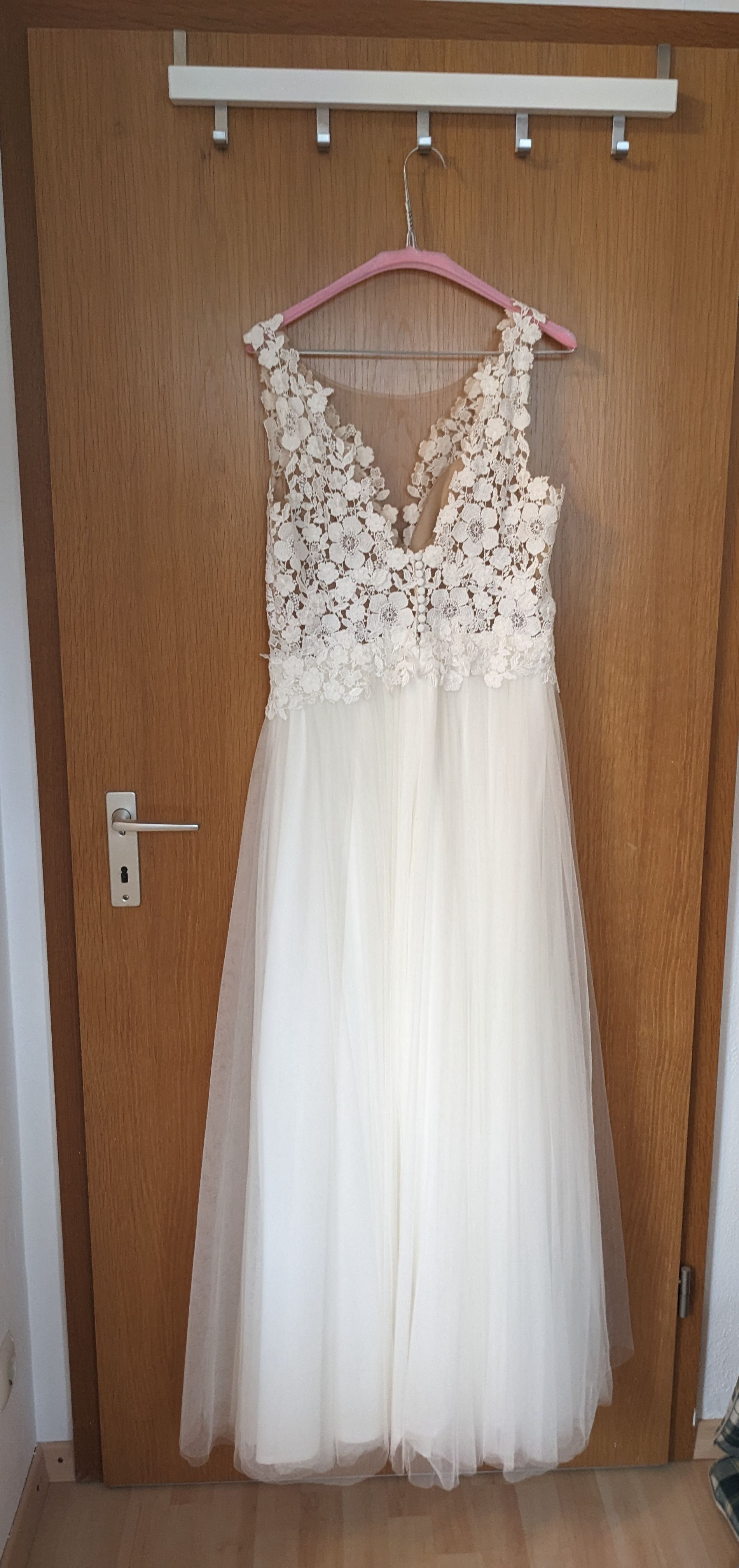 "Mir hat besonders gut gefallen, dass ich es, ob es aus 2. Hand war, komplett an meinen Körper anpassen konnte - vermutlich der Vorteil, dass es aus der Schneiderei kommt. Sowohl Länge als auch Breite, Hüftumfang, Träger, Ausschnitt. Vor allem für Mamas super geeignet, die vielleicht nach der Geburt noch ein paar Kilo abnehmen, aber die Hochzeit trotzdem schonmal planen möchten.