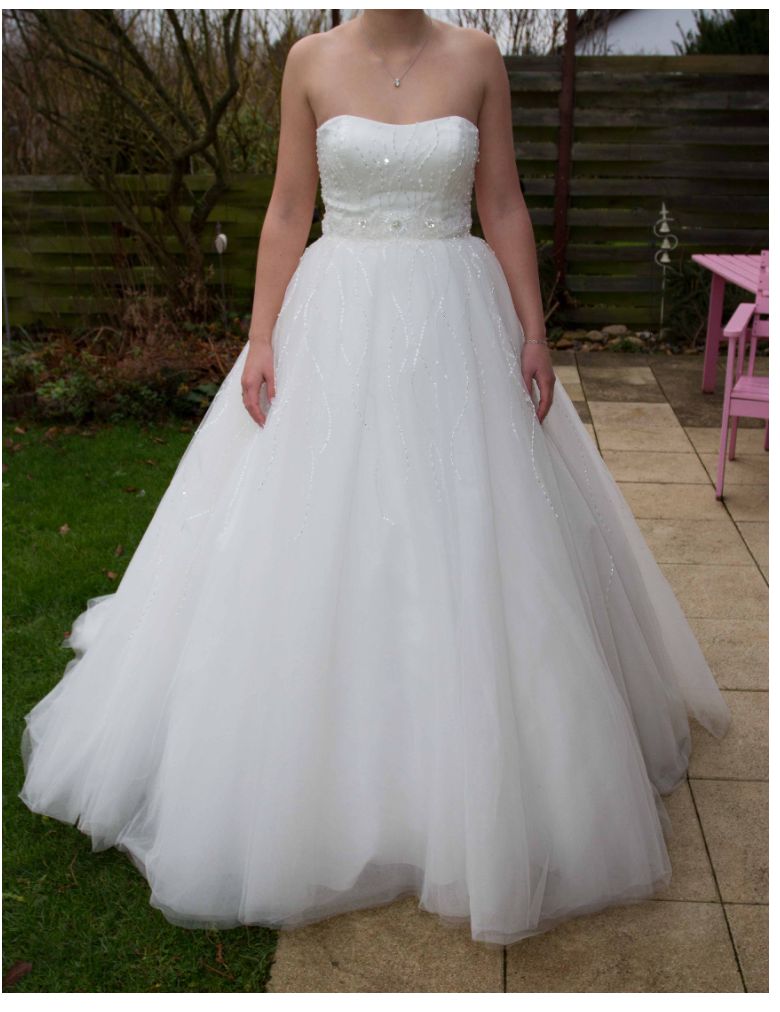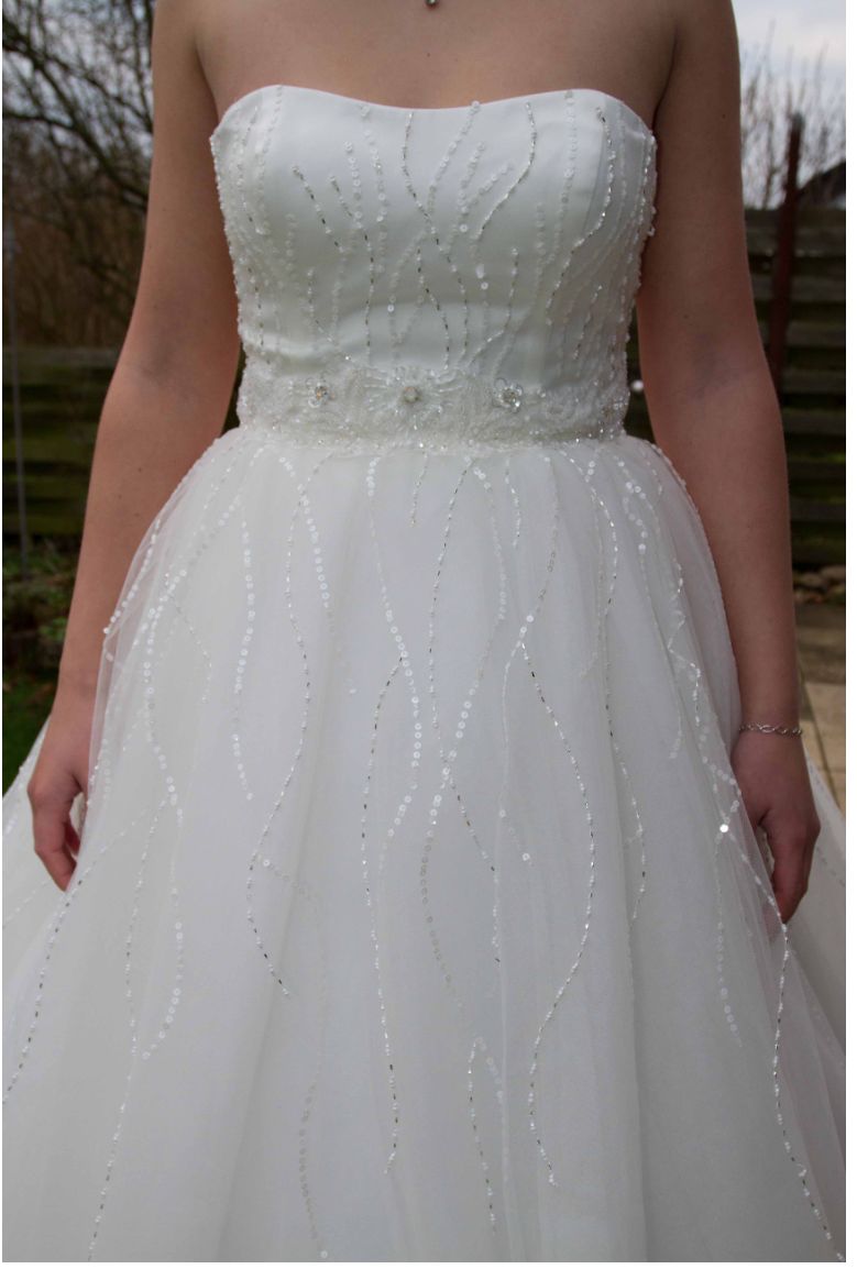 "Dieses Kleid besticht durch die schönen Glitzersteine, die das Kleid und die Braut zum Strahlen bringen. Die Schleppe kann durch einen Knopf hochgesteckt werden, sodass das Kleid super zum Tanzen geeignet ist. Dazu passend gehört ein Reifrock und der Stoff, der abgenäht wurde "