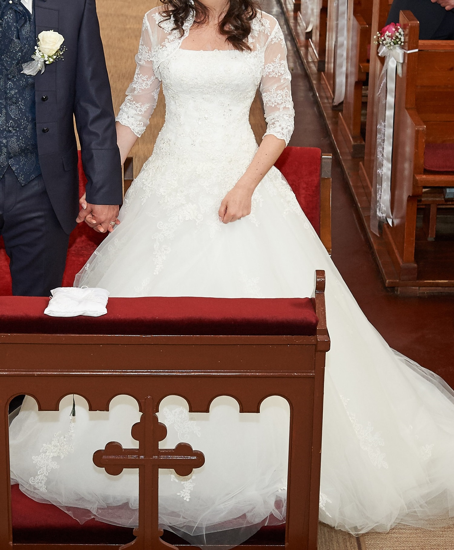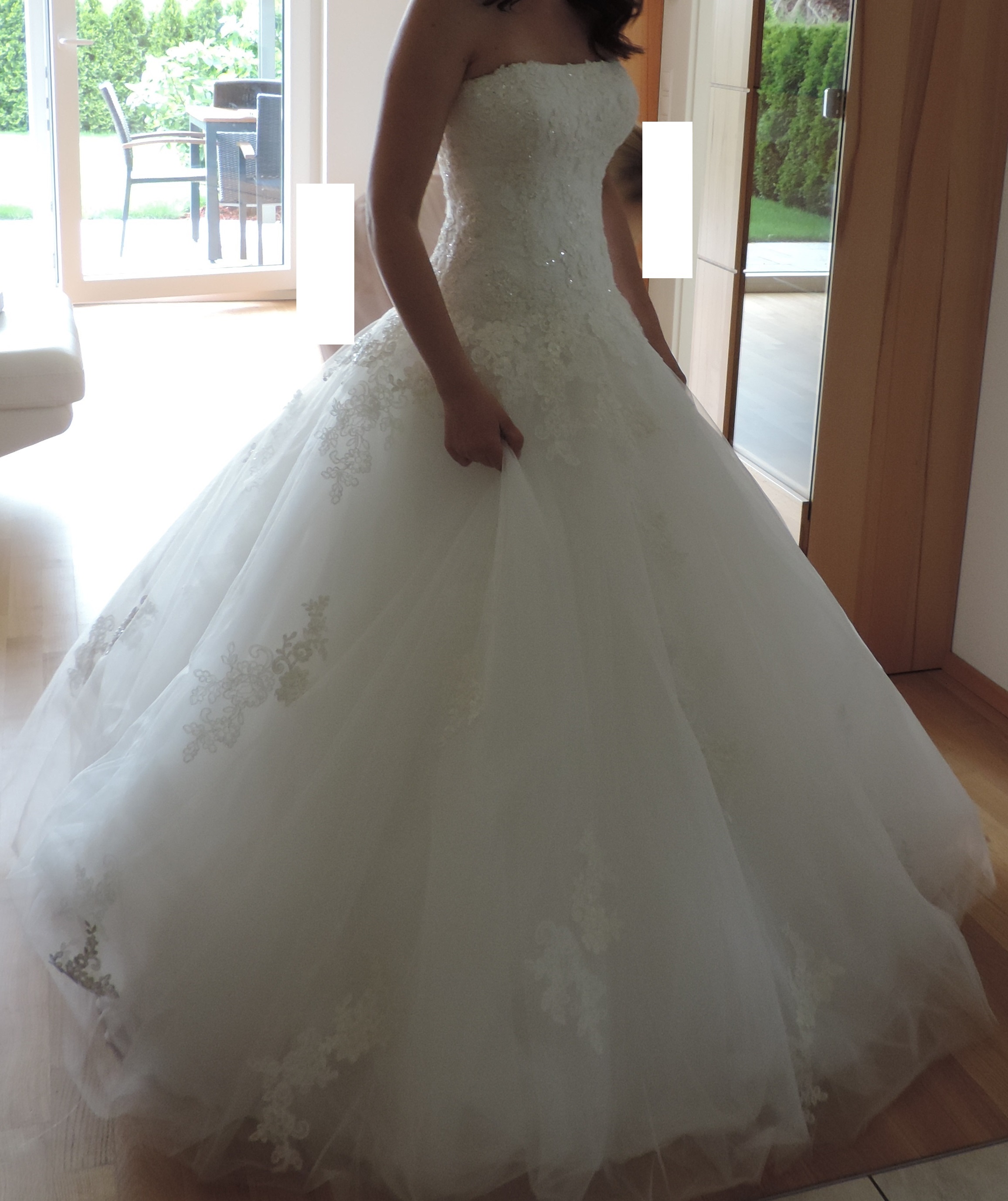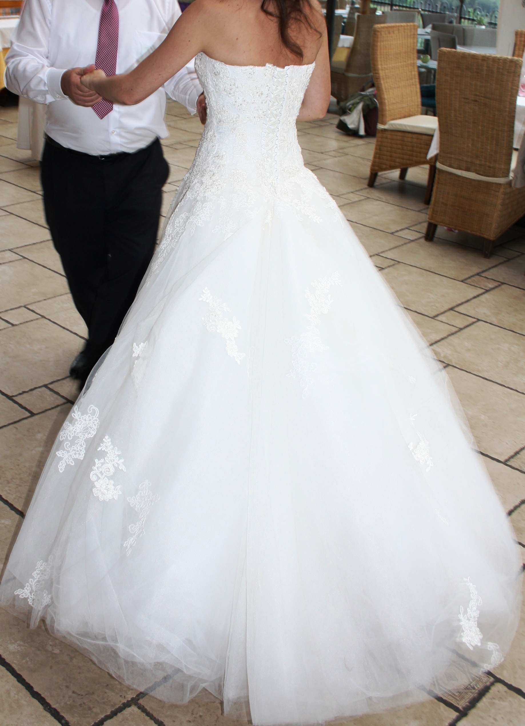 "Das Brautkleid besticht durch einen edlem, hochwertigen und eleganten Stoff in der Farbe Ivory. Es ist mit Stickereien und Perlen versehen. Die Rückenansicht sorgt mit ihrer Corsage und einer traumhaft schönen Schleppe für einen tollen Blickfang. Die Schleppe kann hoch gebunden werden. Das Kleid ist in Größe 34/36. Es können beim Kleid noch Änderungen vorgenommen werden. Ich selbst habe Größe 34 und bin 164cm groß. Die Schuhe hatten einen Absatz von ca. 7cm. Das Kleid wurde 1x getragen und danach in der Textilreinigung gereinigt. Ich fühlte mich in dem Kleid wie eine Prinzessin. "