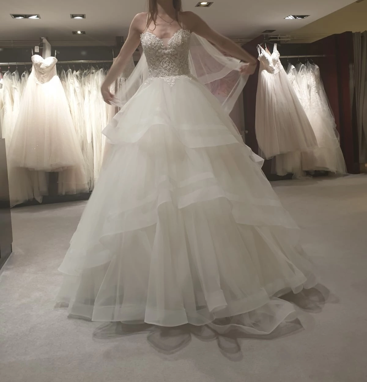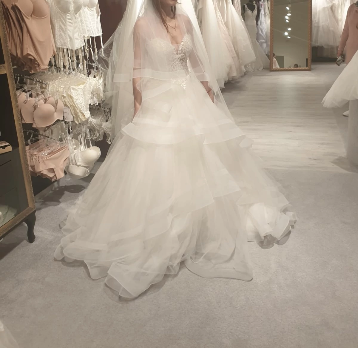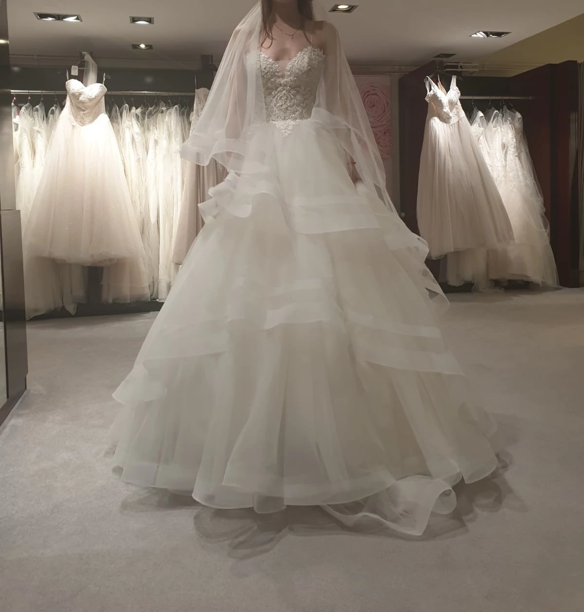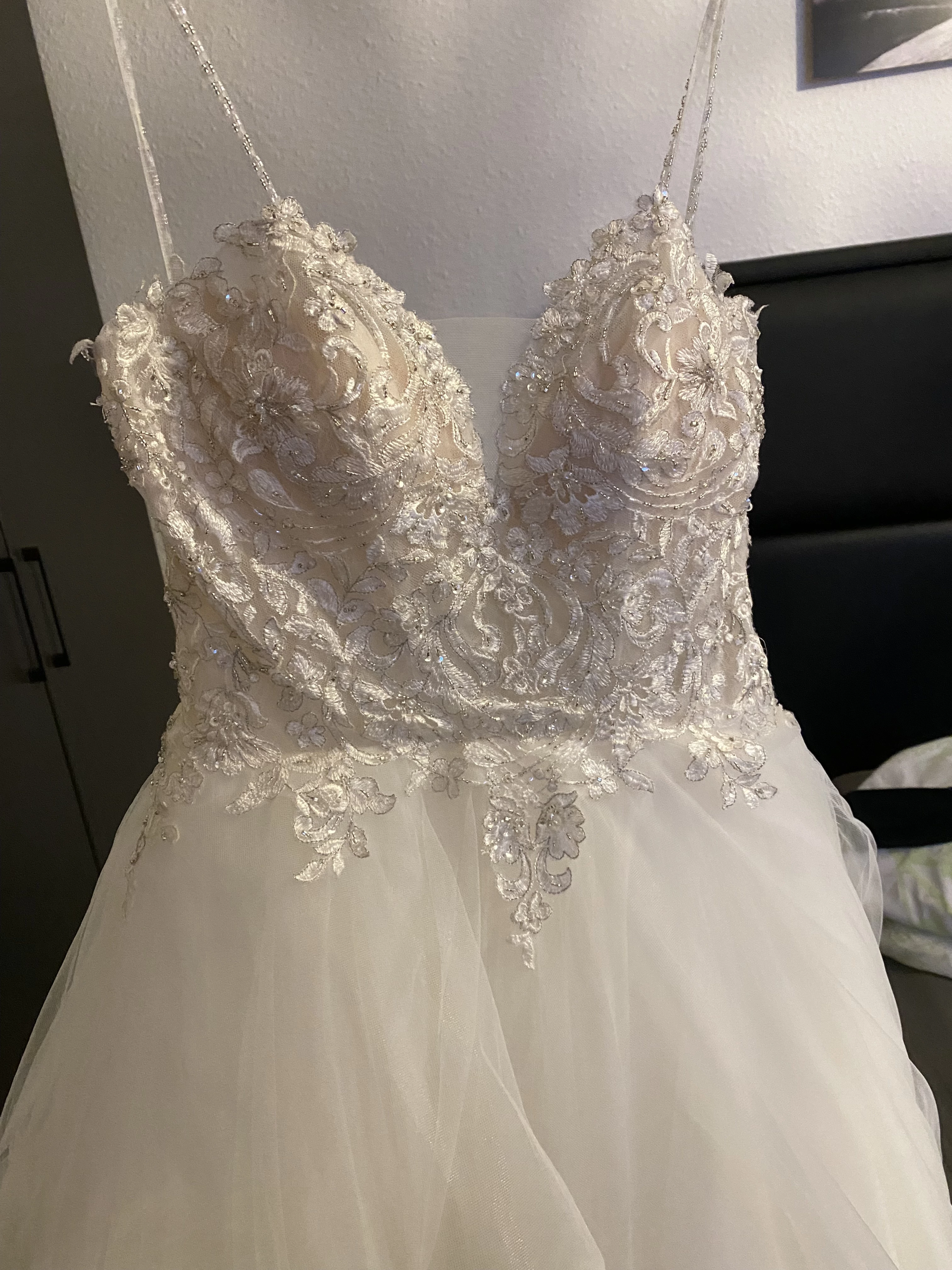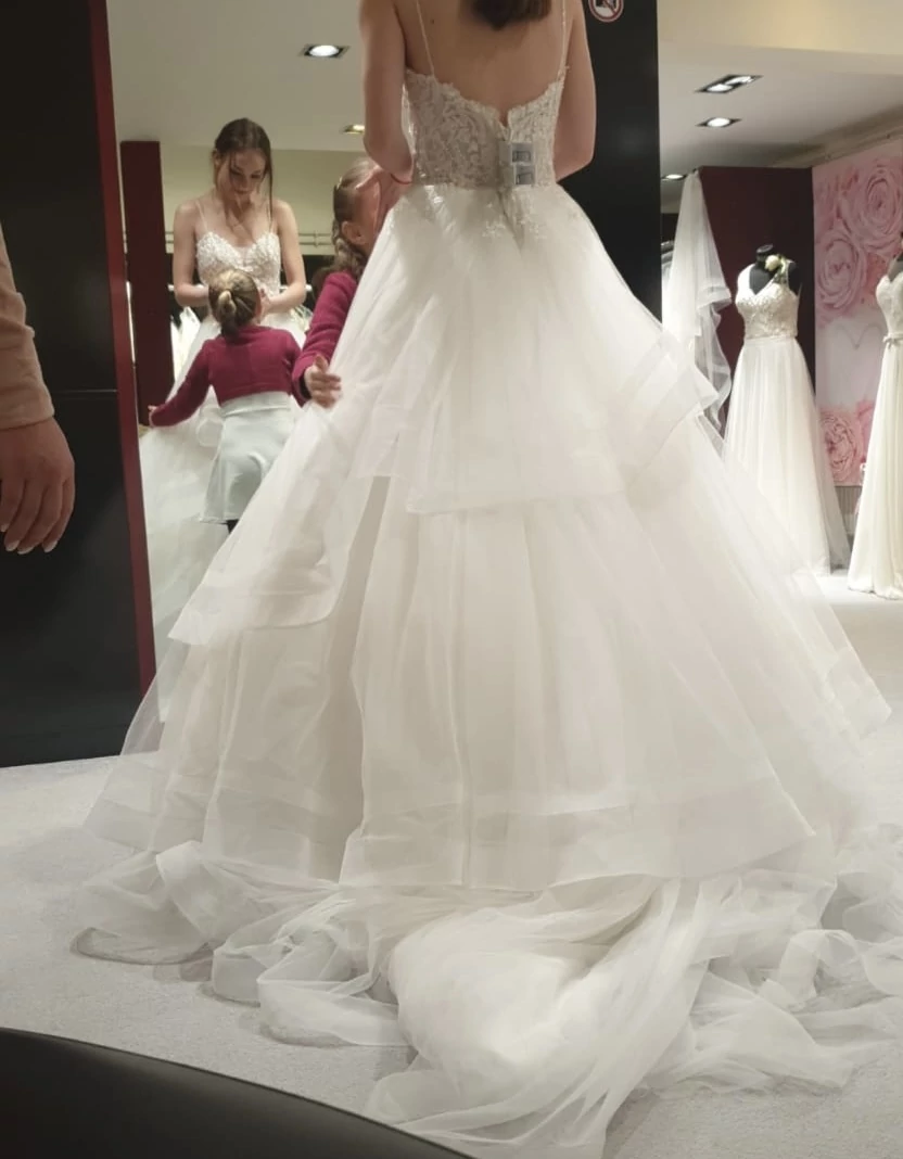 "Die Bilder sprechen für sich. Das Kleid ist bezaubernd. Ich gebe den passenden Schleier wie auf den Bildern dazu. Und bei Bedarf auch die BH Cups in Größe B :)"