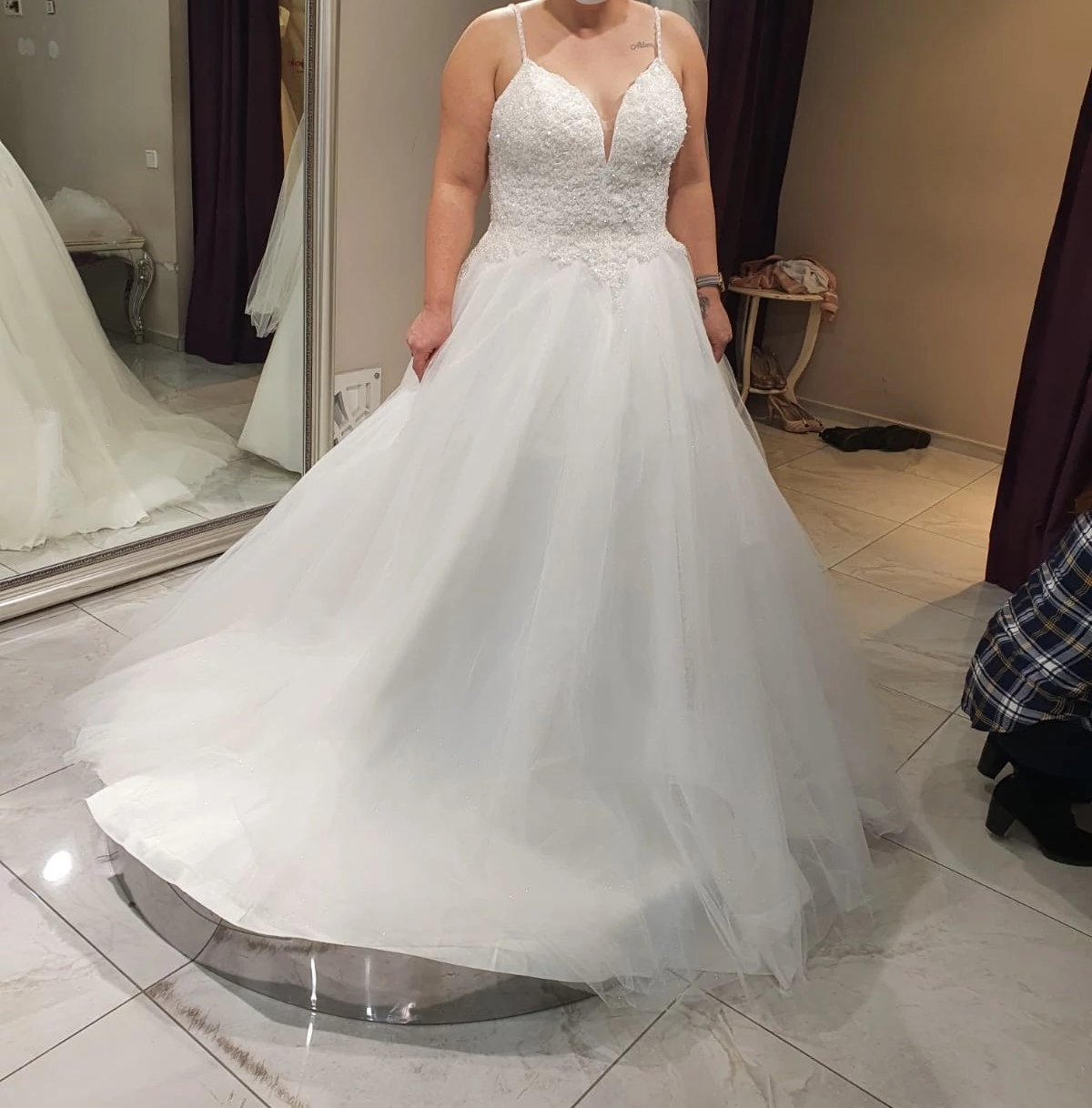 "Biete ein ungetragenes Brautkleid von Prestige. Falls es zu offen ist kann man es mit Bolero kombinieren. Dezenter aber glänzende Tüll. Die Träger ebenfalls die Corsage ist mit steinen bestrickt. Dazu noch der passende Schleier der 1.5m lang ist. "