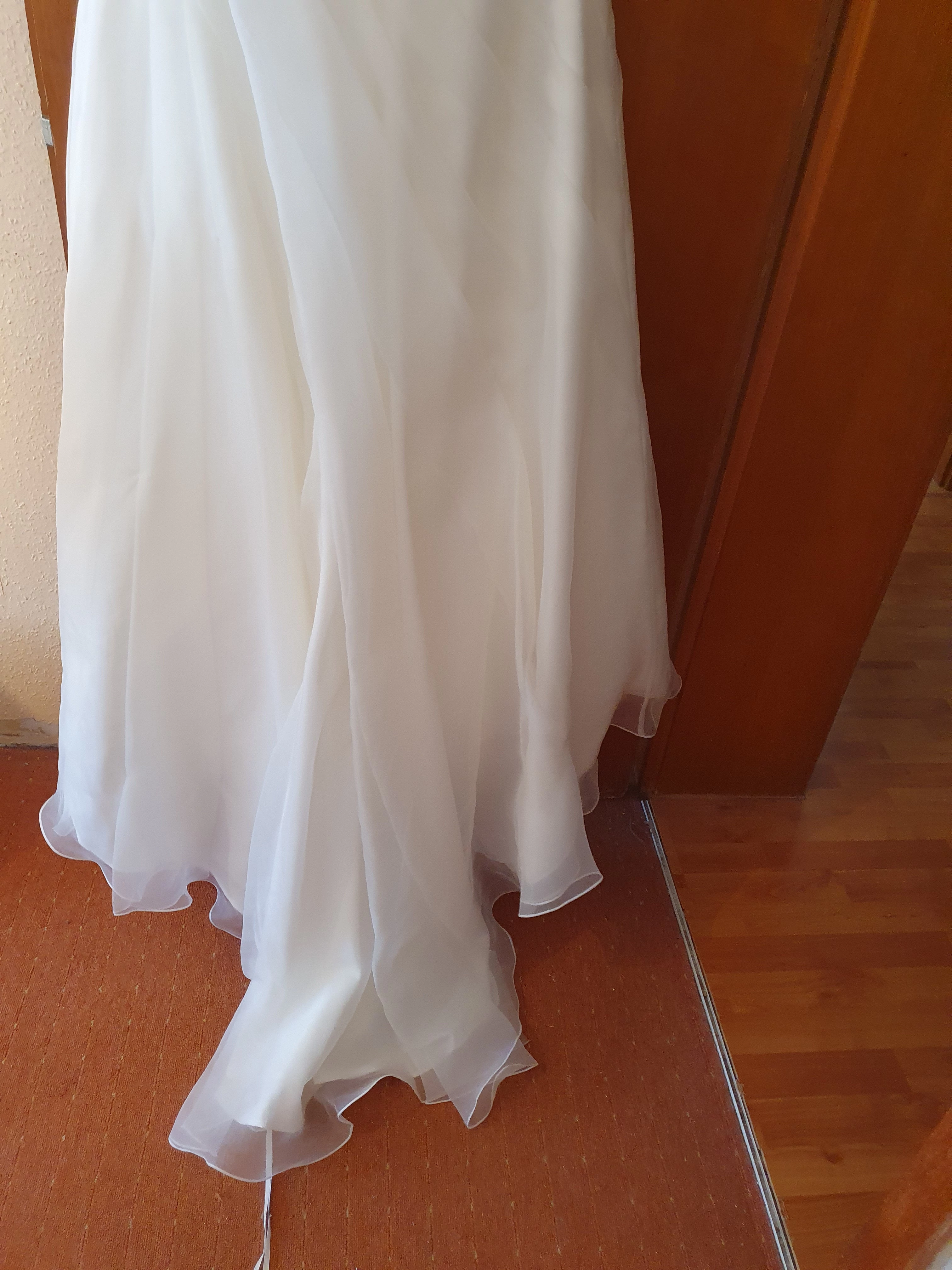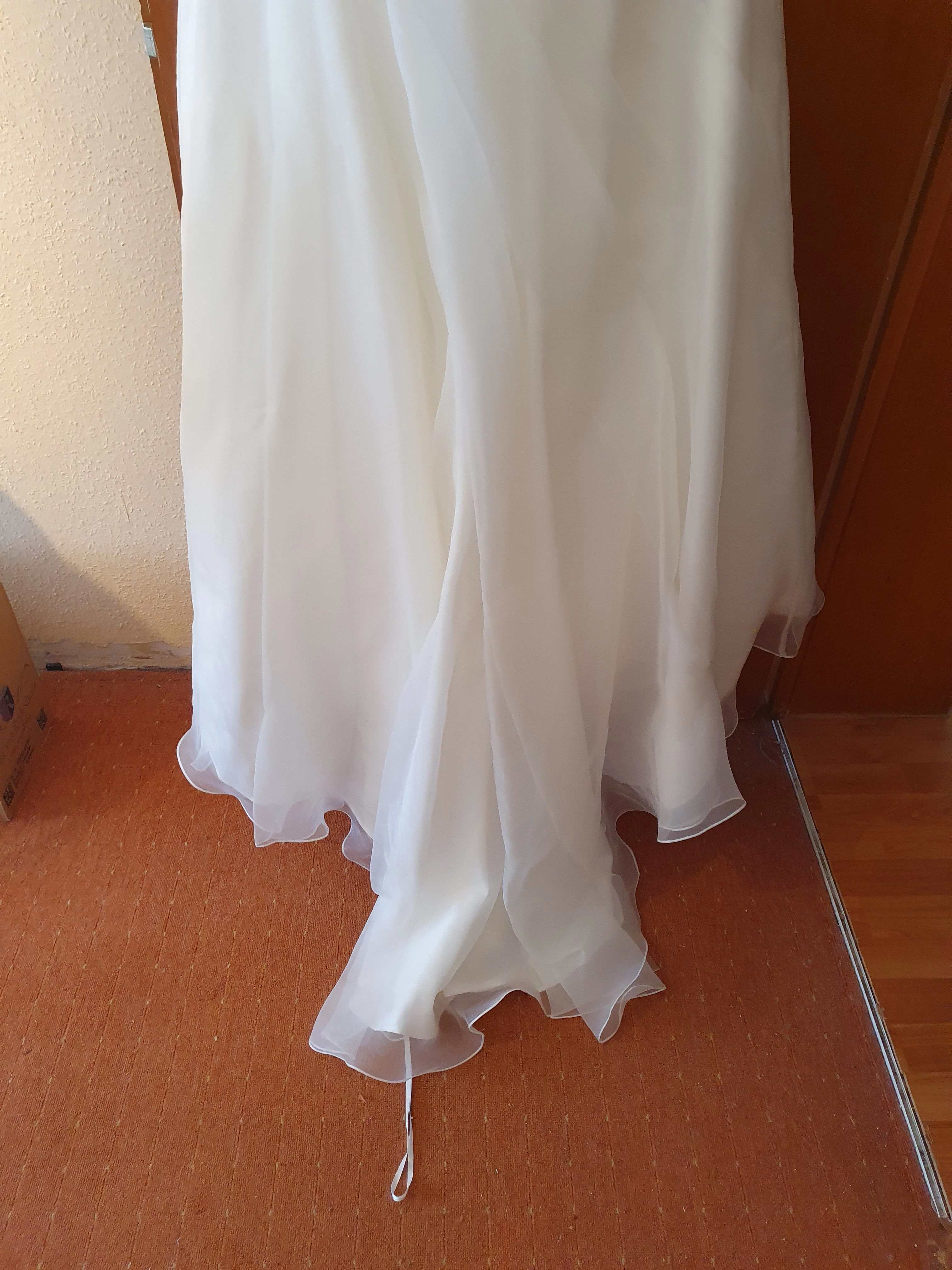 "Dieses Brautkleid wurde nie getragen. Es ist noch komplett neu. Ebenfalls wurde bisher keine Änderungen an diesem Kleid vorgenommen."