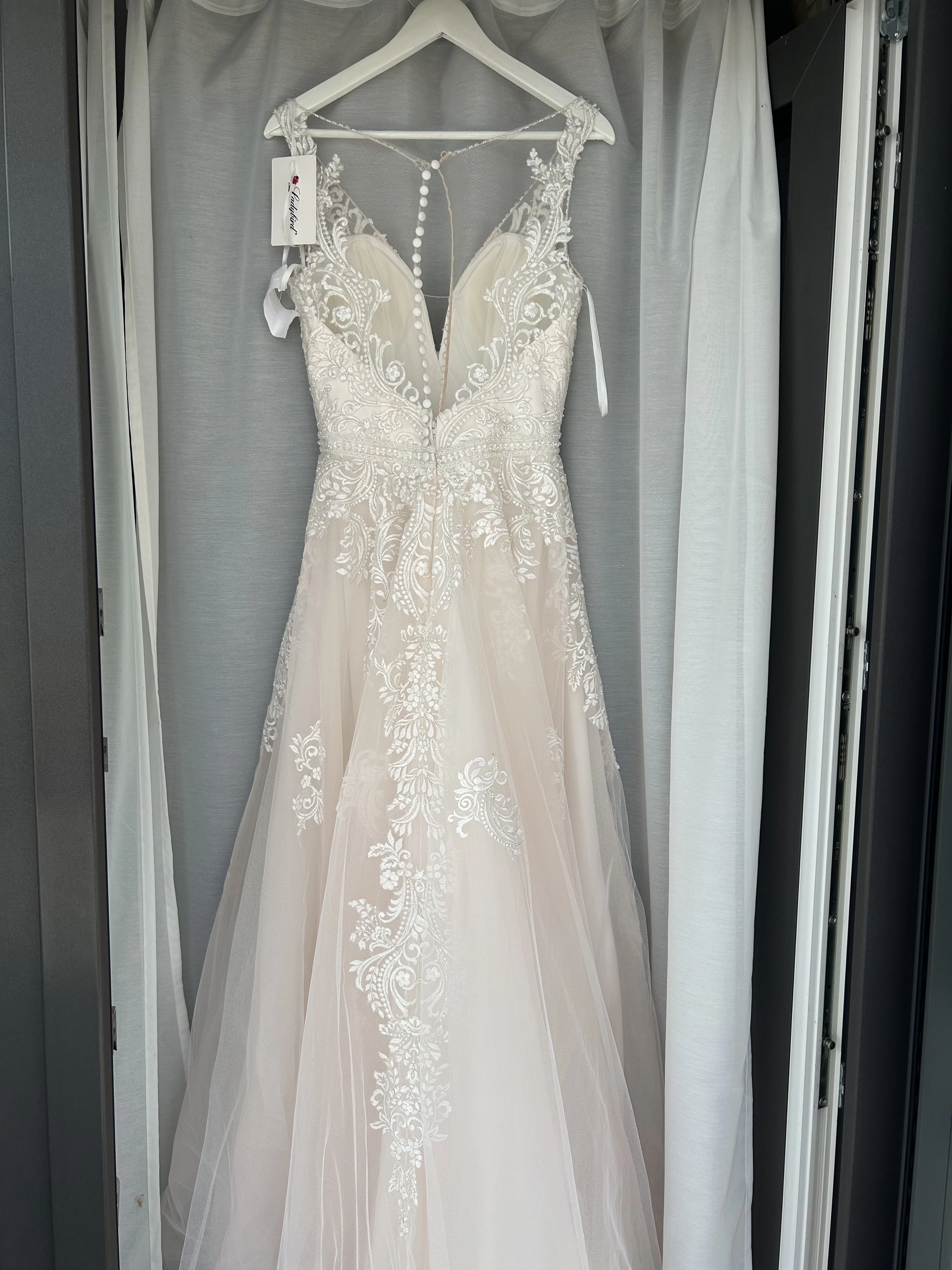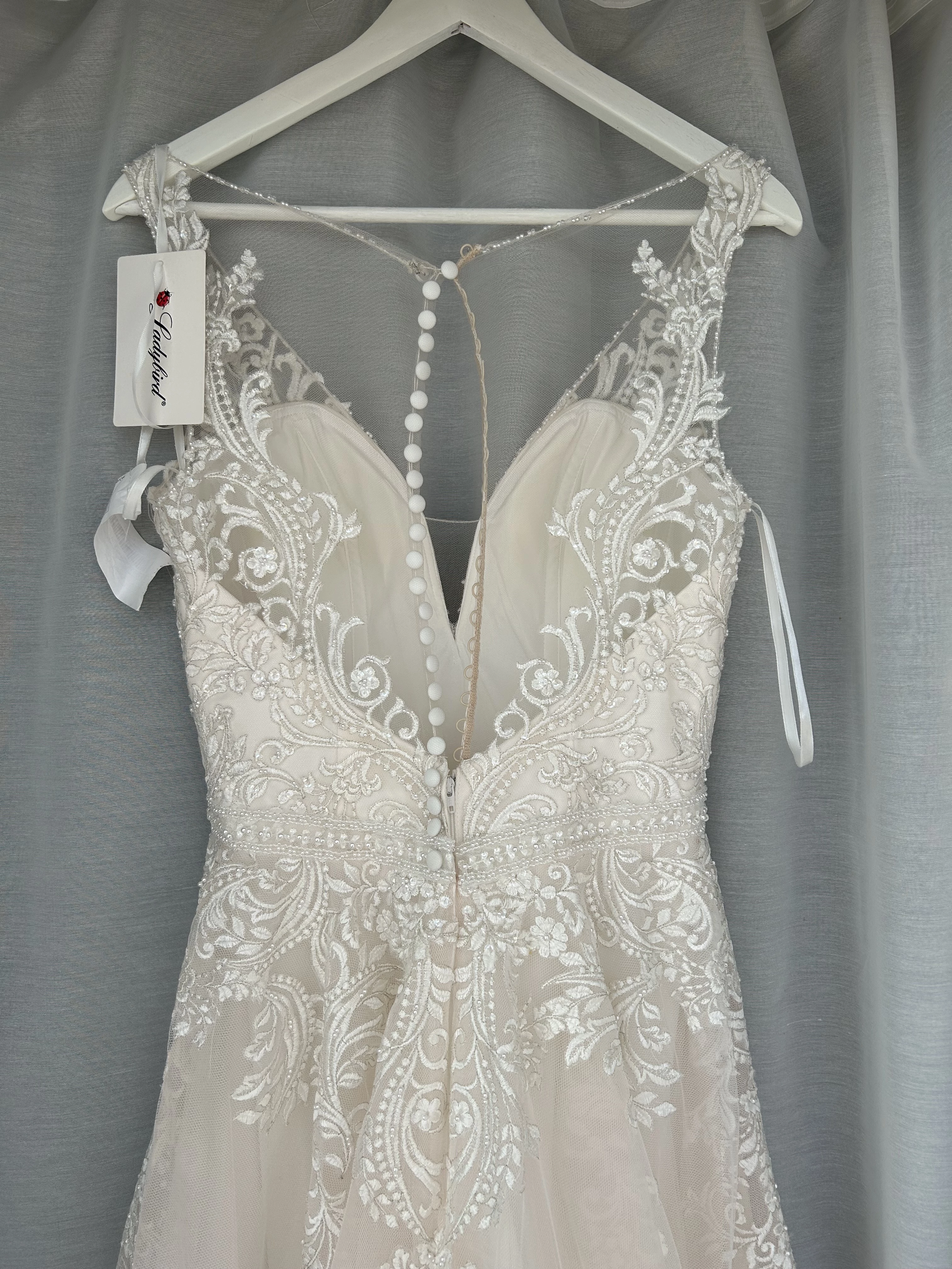 Ich habe das Kleid bei Fräulein TrauDich in Regensburg neu gekauft. Das Kleid war nun ein Jahr zur Kommission in einem Second Hand Brautkleidladen, da der Laden aufgelöst wurde, stelle ich es hier zum Verkauf online.