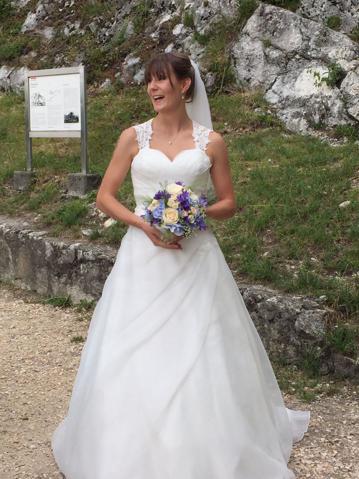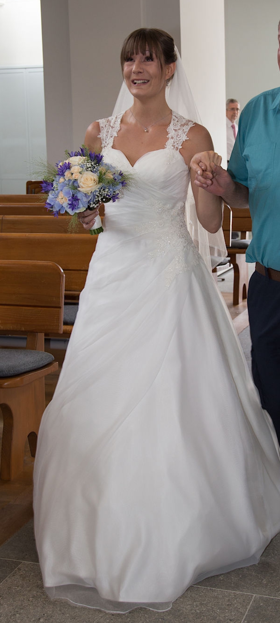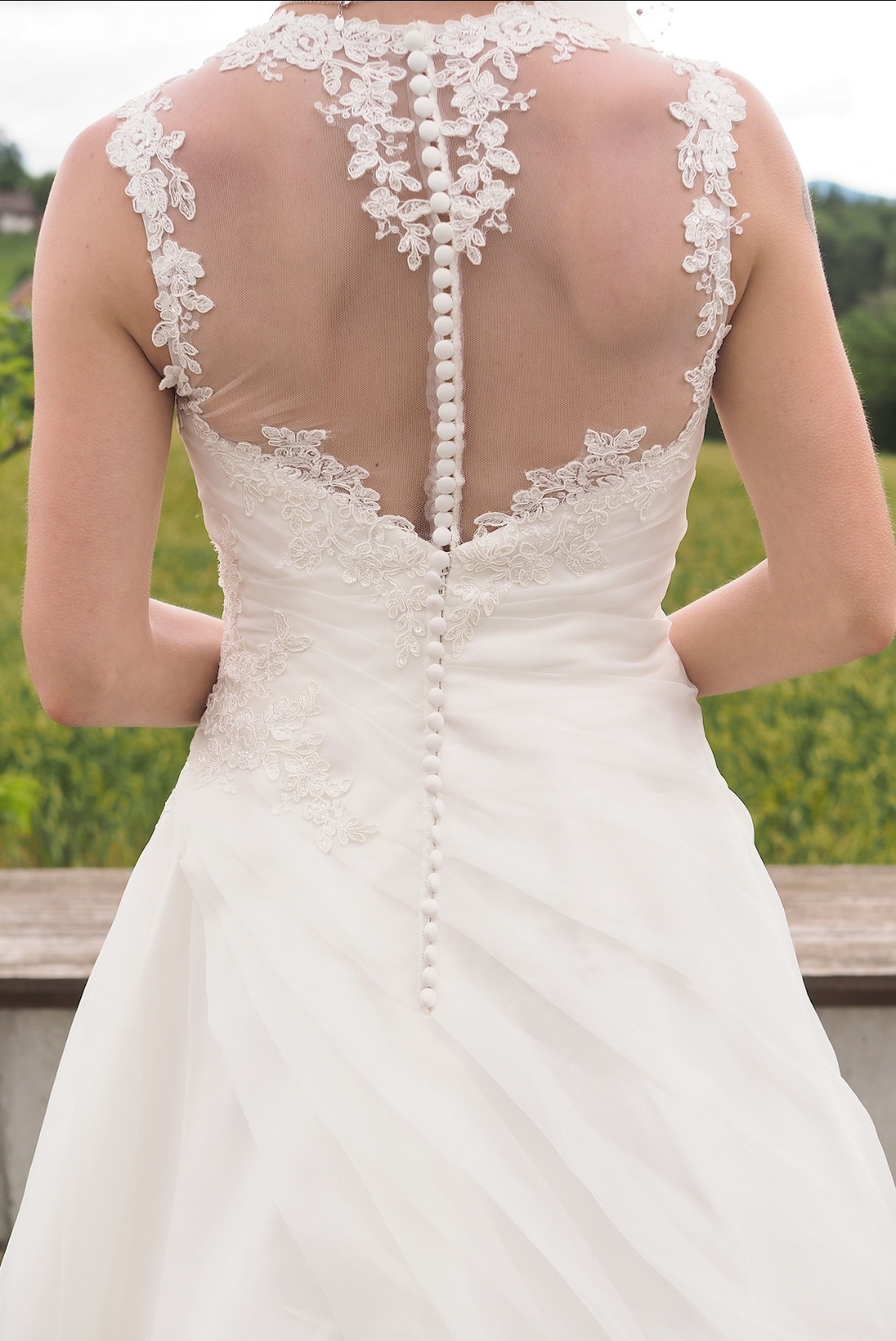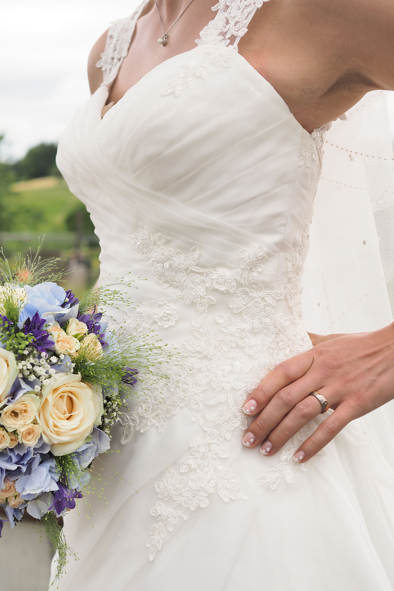 "Mein Traumkleid mit den feinen verzierten Trägern und dem Stickereischmuck auf der linken Kleidseite.