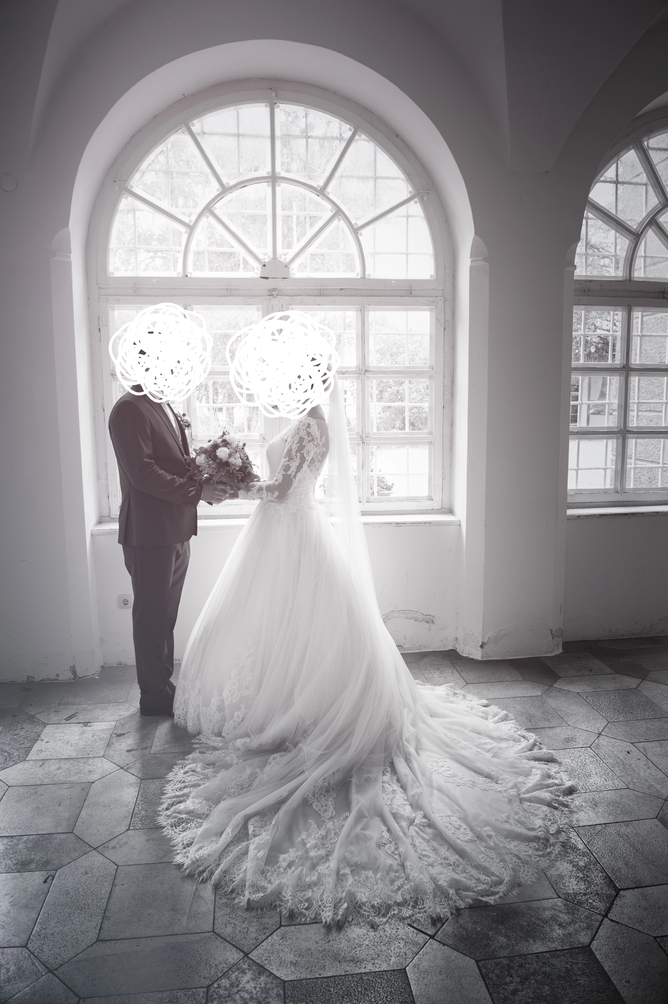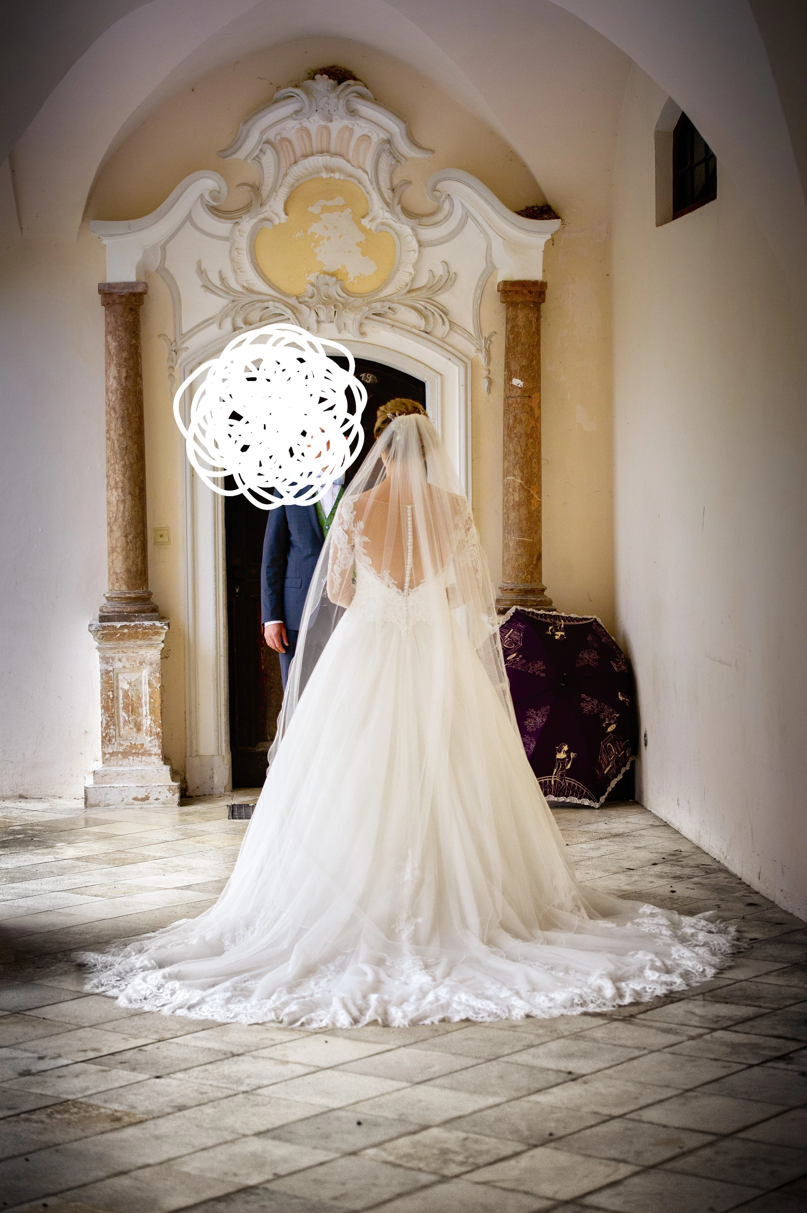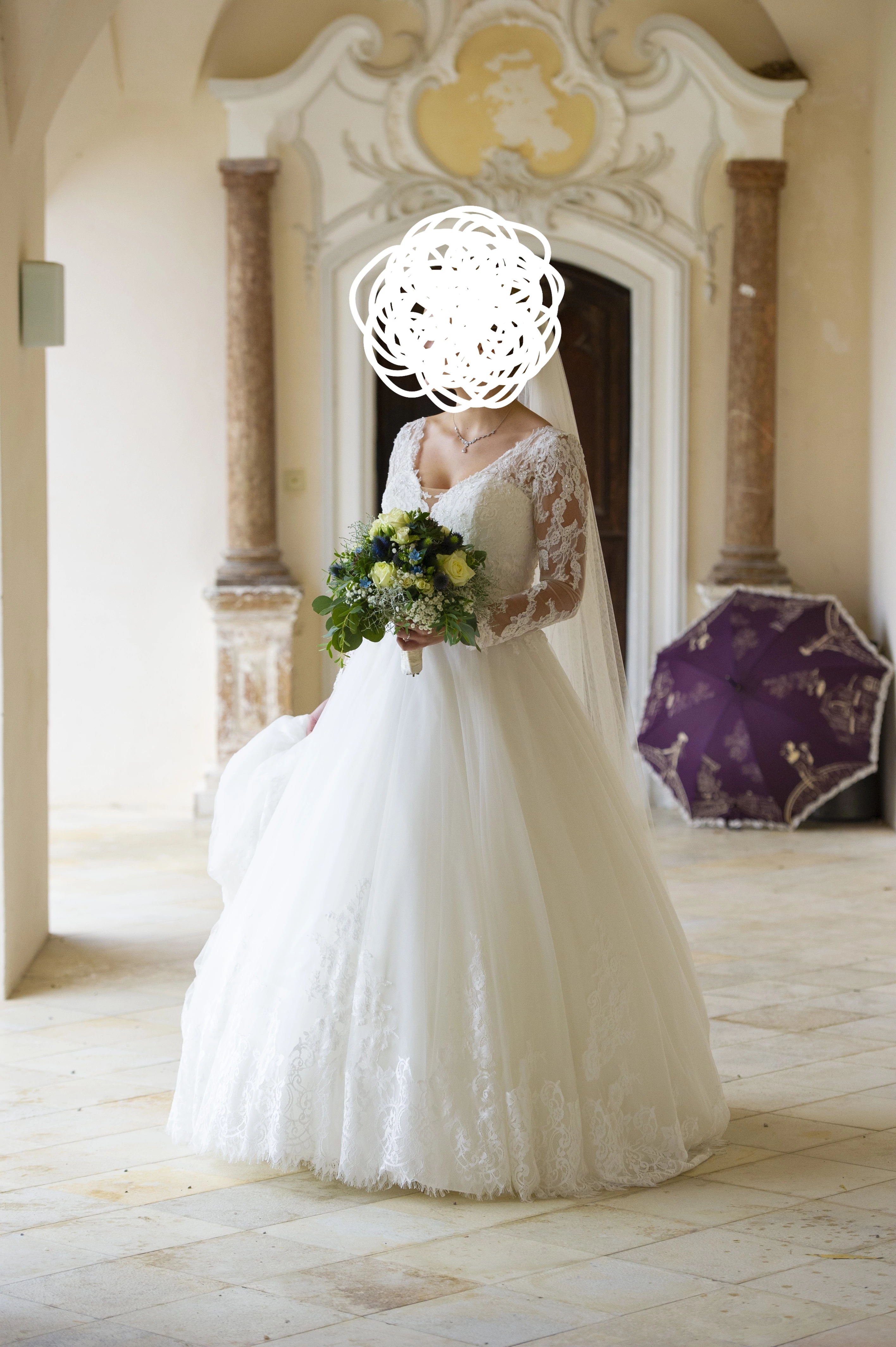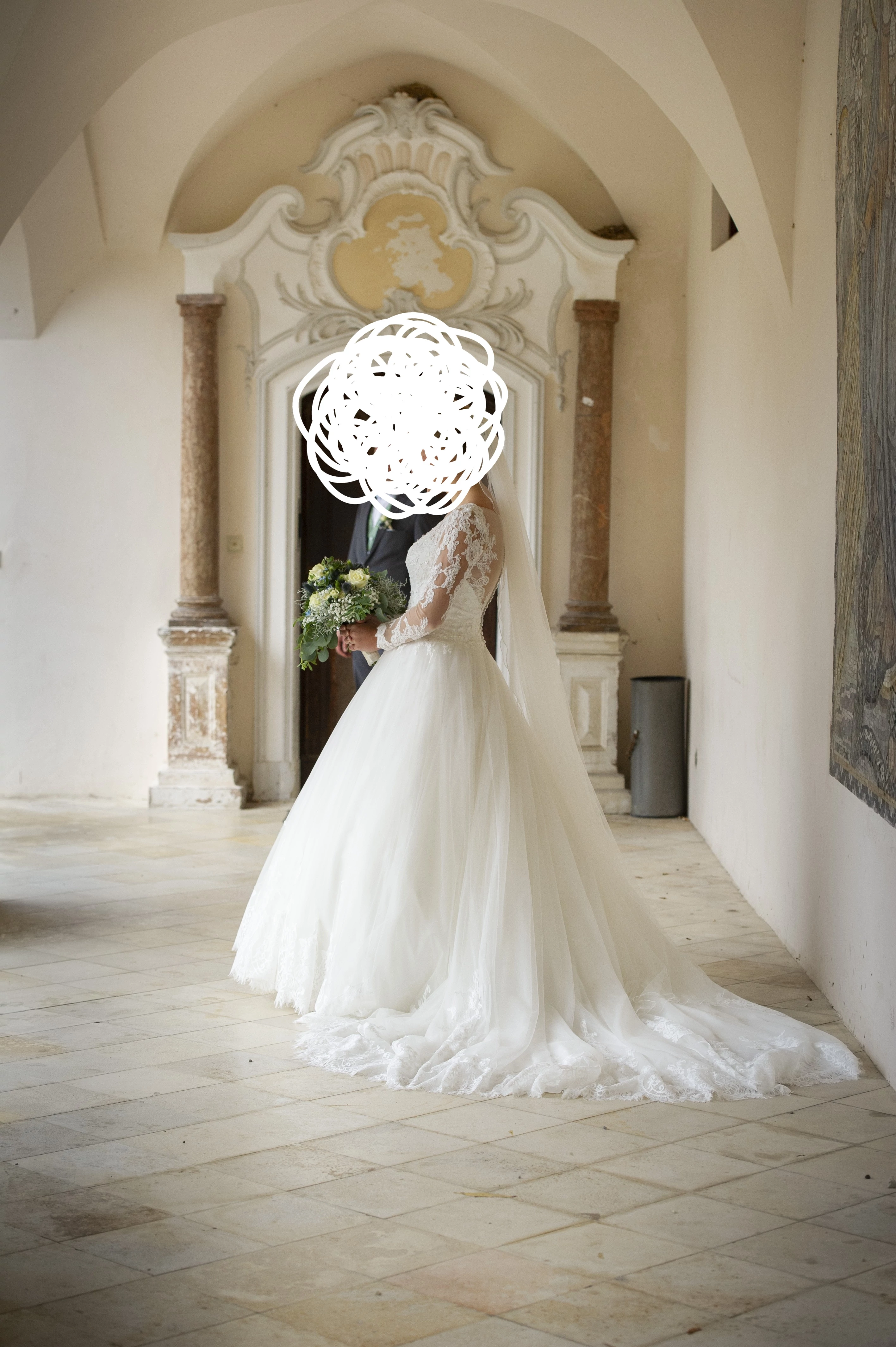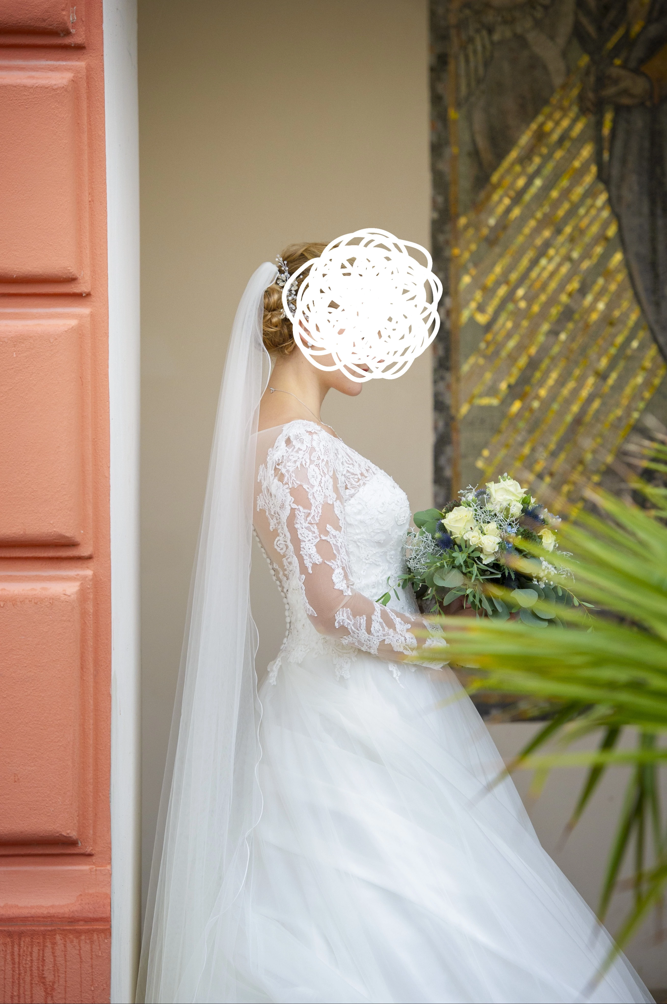 "Die langen Spitzenärmel waren perfekt für eine Herbst-Hochzeit. Die Schleppe ein Traum und ging sehr gut zum hochbinden zum tanzen.