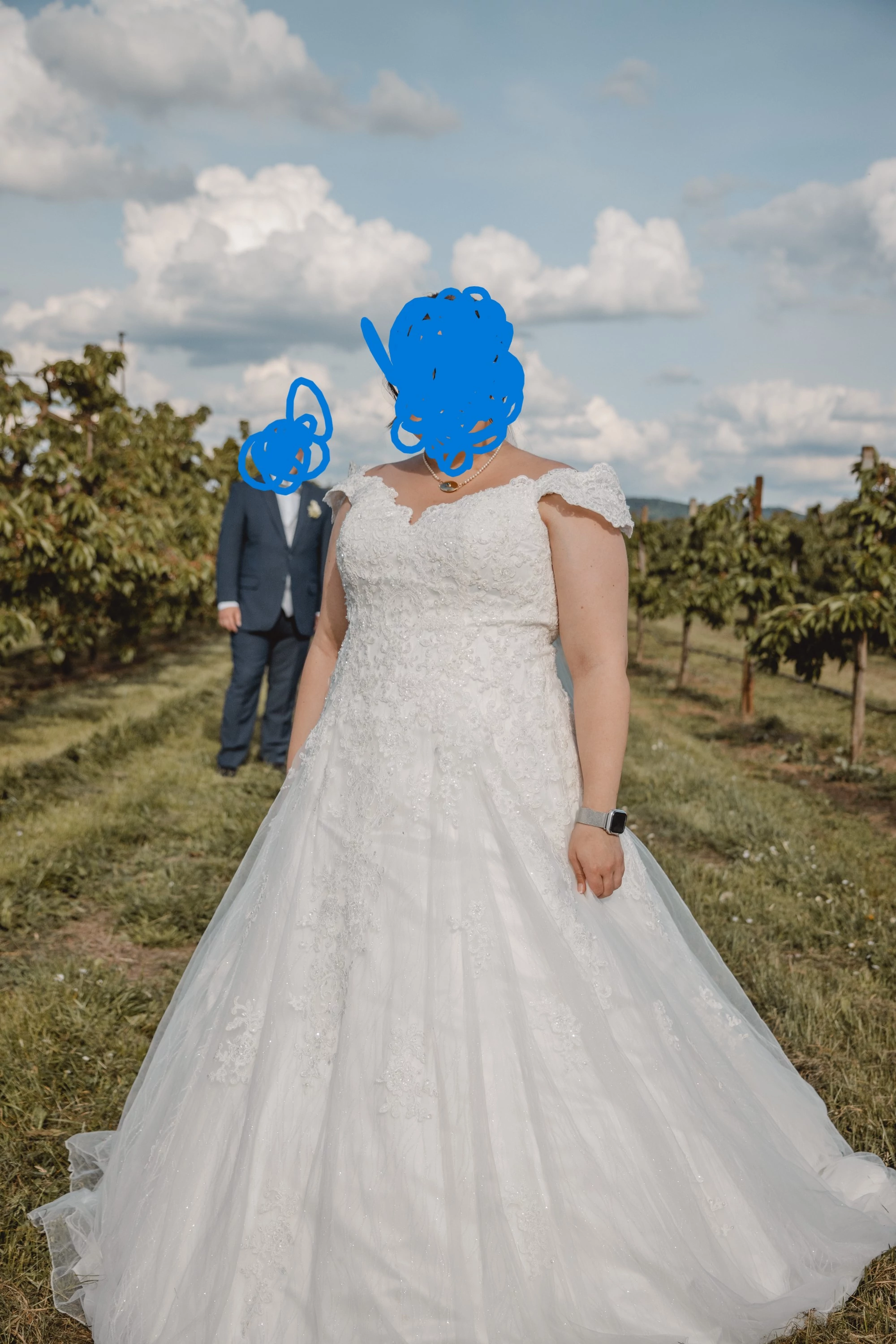 "Das Kleid (Neupreis 1.799,00€) hat nicht nur Stickereien und Glitzersteinbesatz sondern auch einen Glitzertüllunterrock, der durchschimmert, sowie Carmen-Ärmel aus Spitze und Steinchen bestickt und eine Schleppe. Mit der Schnürung hinten ist man noch etwas flexibel falls vor der Hochzeit Gewichtszu- bzw. Abnahme erfolgt. Für einen ggf. kühleren Hochzeitstag habe ich noch eine stylische/flippige Jeansjacke mit Perlen bestickt (Neupreis 100,00€) dazu gekauft und wird mit abgegeben. Der Reifunterrock mit einem Neupreis von 89,90€ sowie der Spitzenschleier mit einem Neupreis von 139,90€ zuzügl. befestigtem Strass-Steinkämmchen werden mit dazu abgegeben. Anprobe nach Terminvereinbarung möglich."