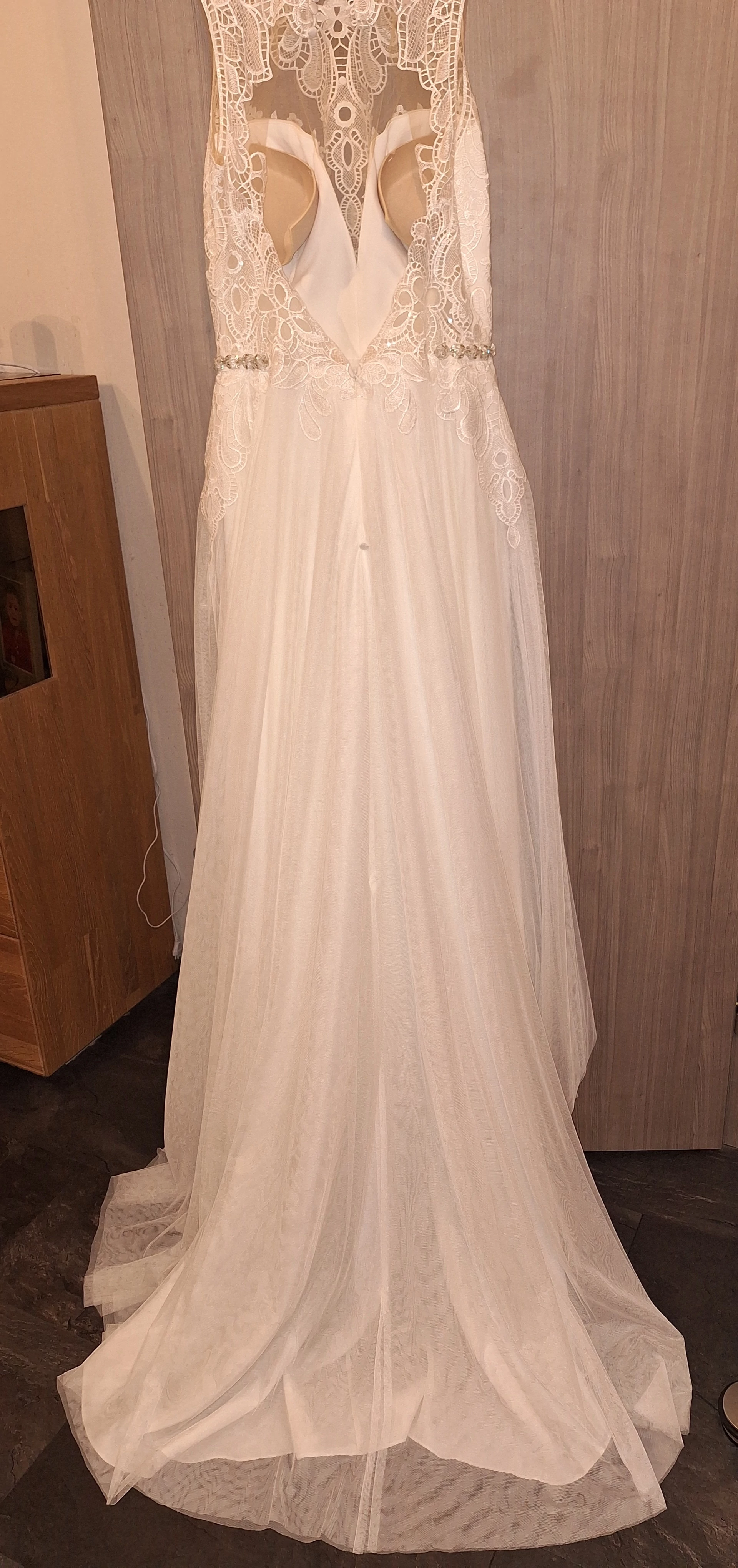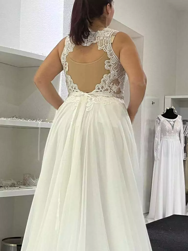 "Traum im Boho-Style, elfenbeinfarben, ärmellos mit Schleppe"