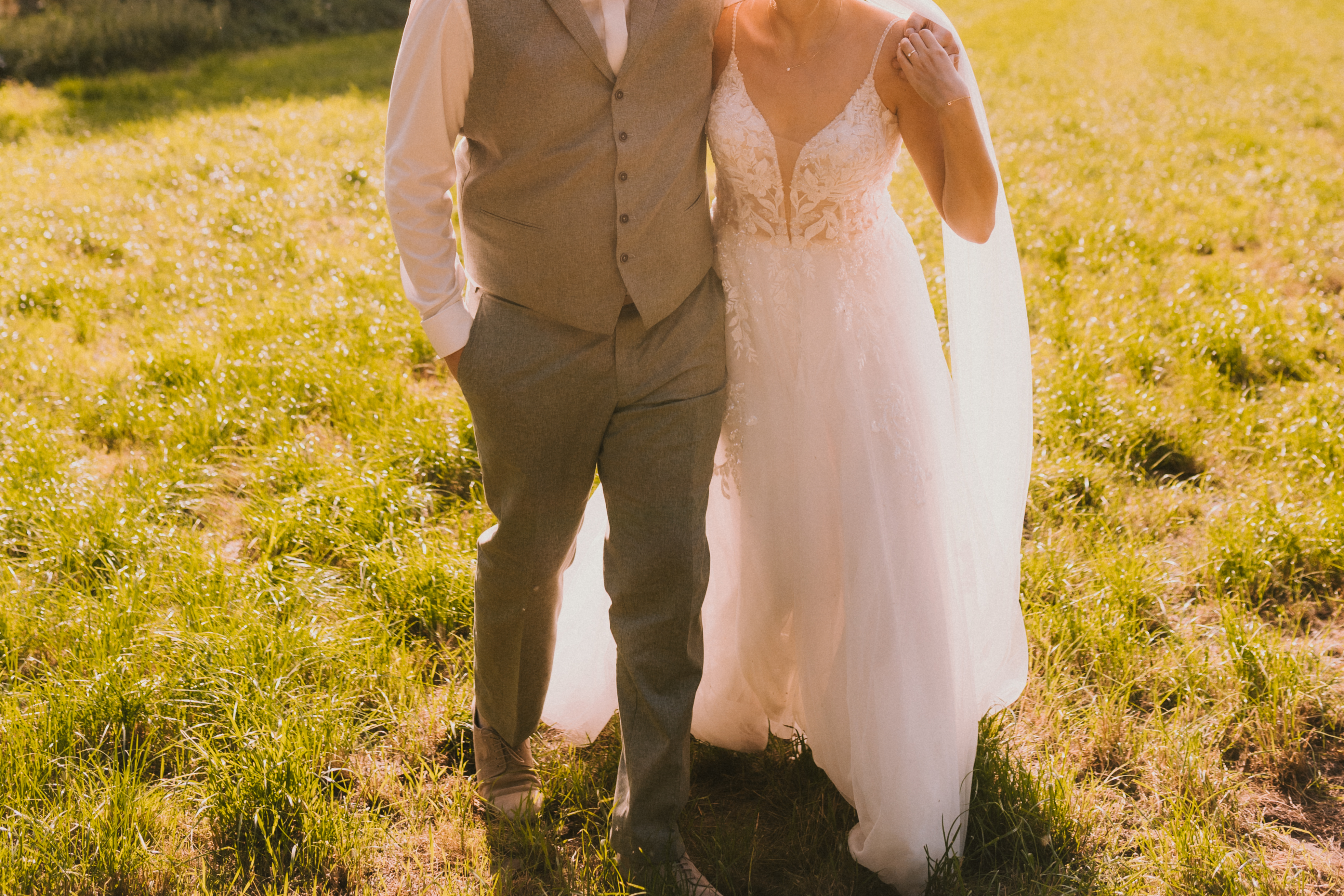 Es ist eine A-Linie mit Spaghettiträgern und einem tiefen Rücken. Außerdem hat es eine Schleppe.