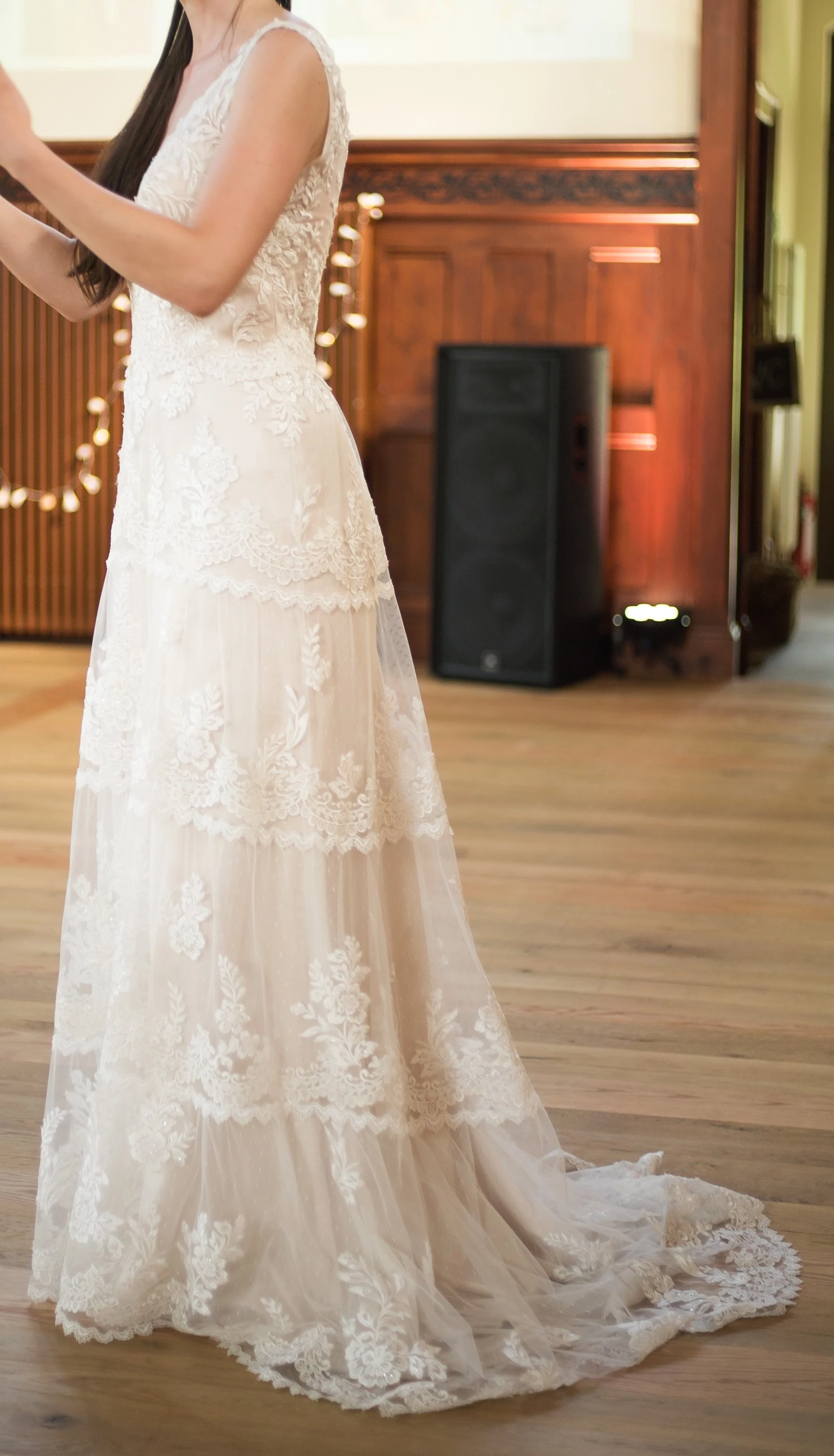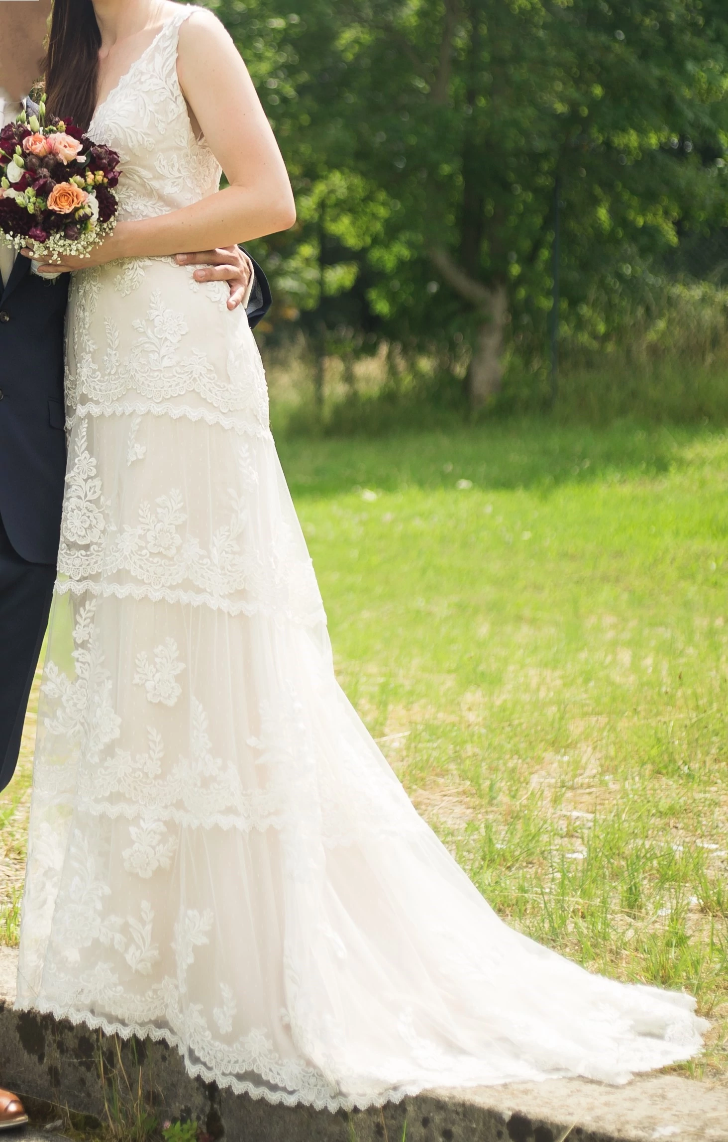 "Die schmal geschnittene A-Linie (trage normalerweise Größe 38) besticht mit ihrem leicht fallendem Rock mit zauberhafter Spitze und dem Rückenausschnitt mit Knopfleiste. "
