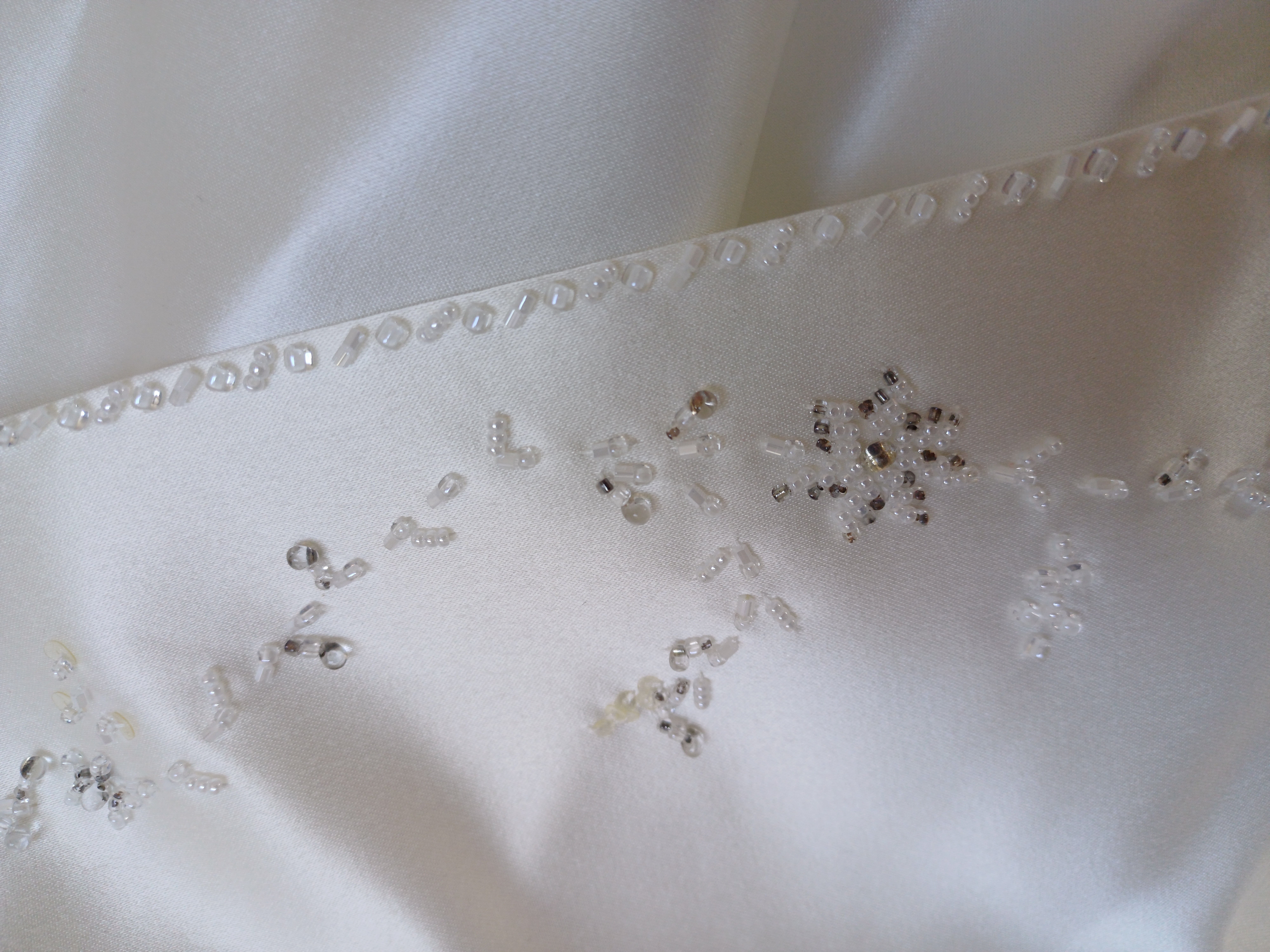"Das Kleid wurde einmal bei unserer Hochzeit getragen und befindet sich dementsprechend in einem sehr guten Zustand. Das Kleid wurde einmal gereinigt, hing aber seitdem länger im Schrank.