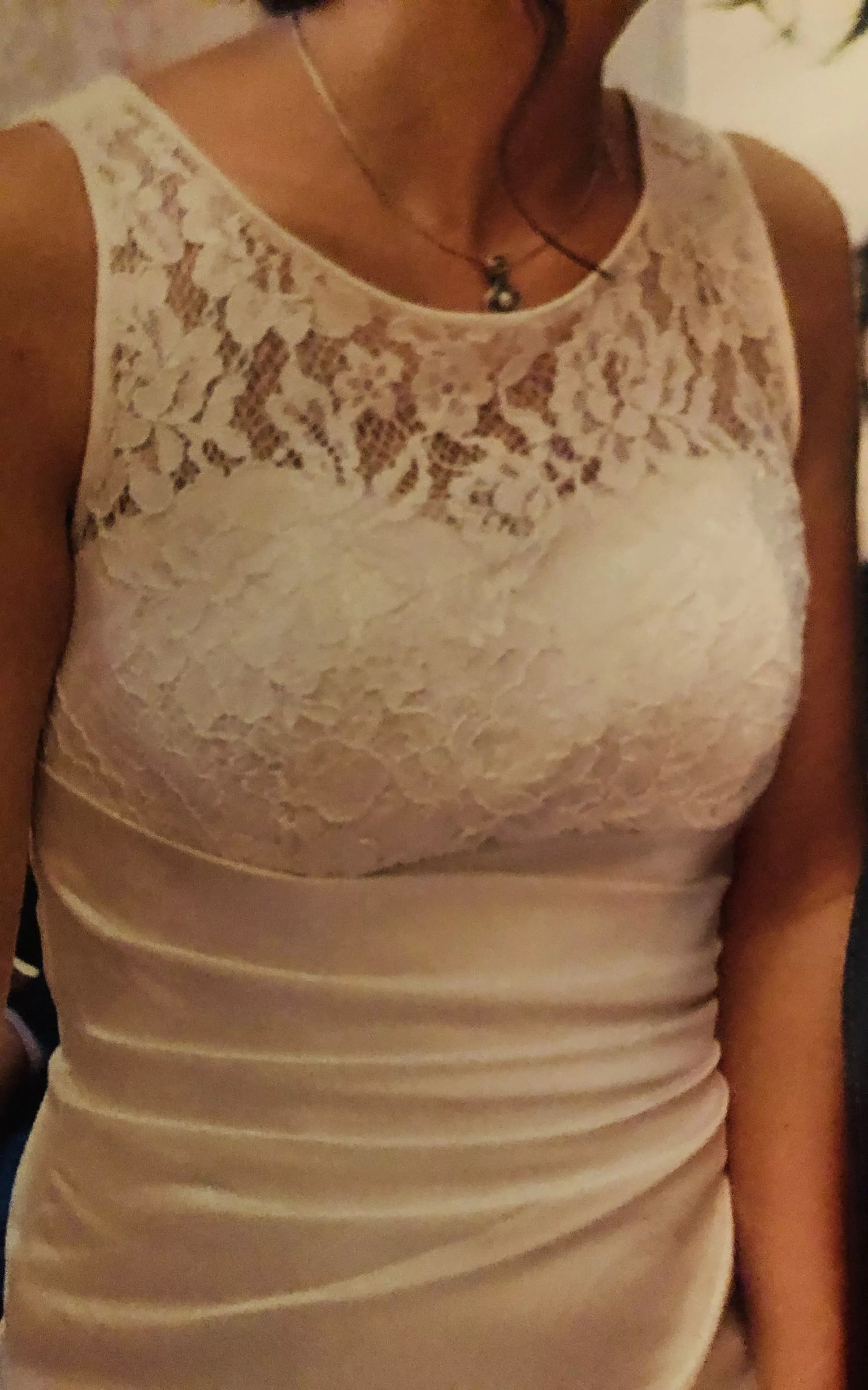 Das Dekolleté ist mit Spitze besetzt.