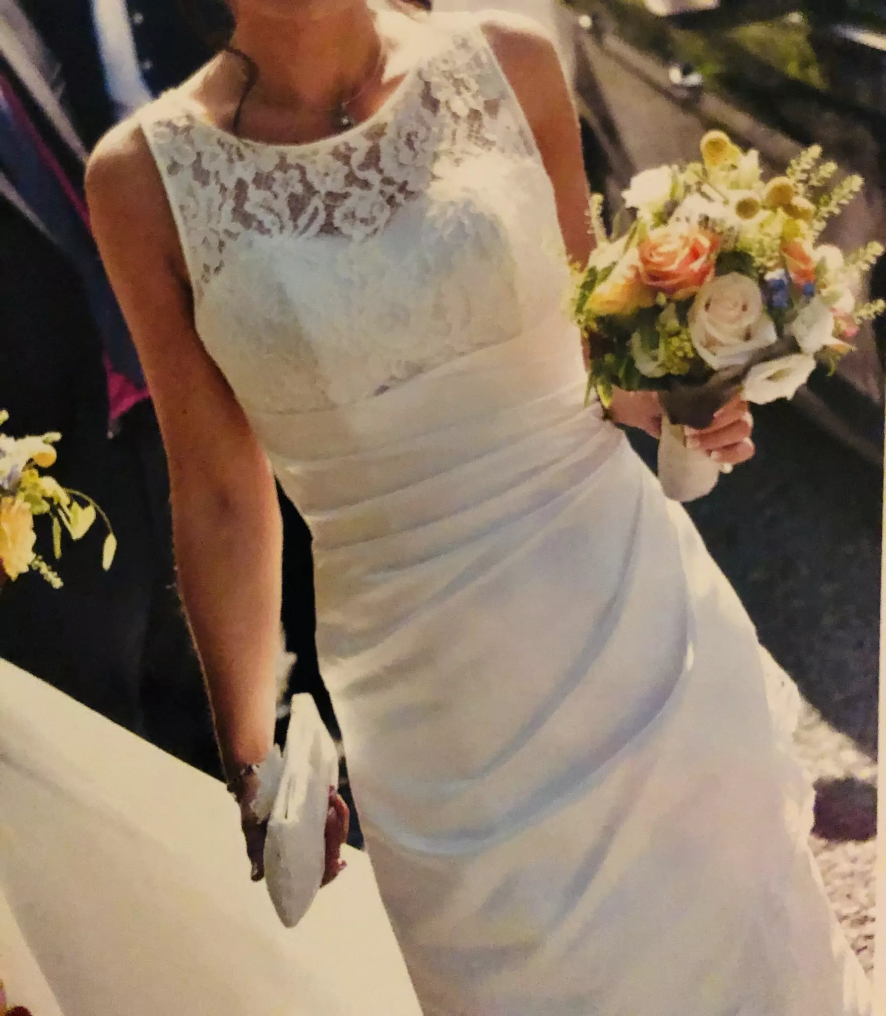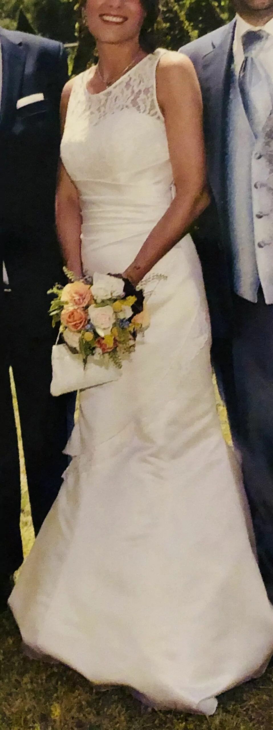 Es hat, wie auf den Bildern zu sehen ist, einen Meerjungfrauen-Schnitt bekommen, anstatt der ursprünglichen A-Linie und aus Größe 38 wurde Größe 36.