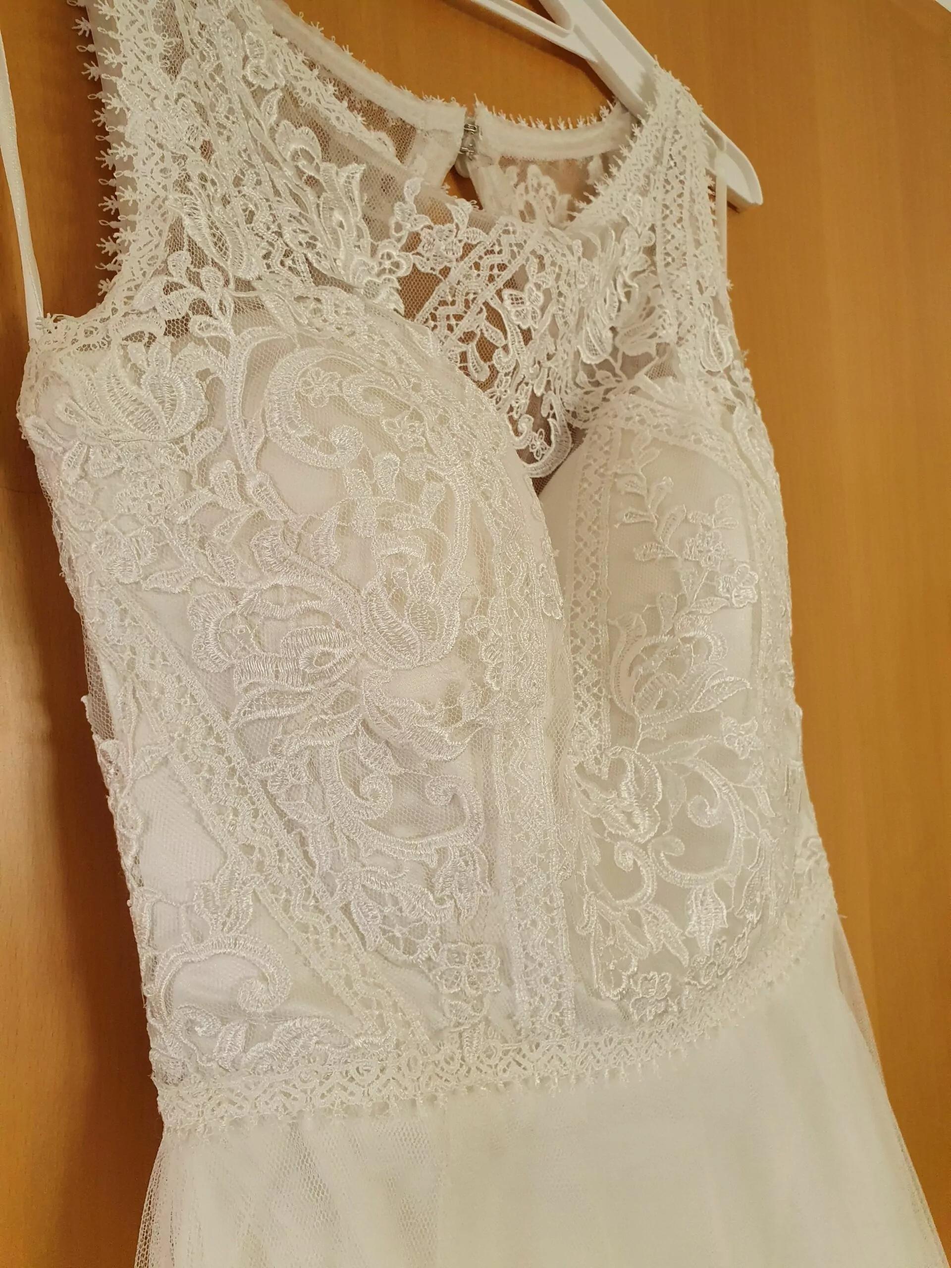 "Ich verkaufe mein Brautkleid welches ich im September 2021 einmal getragen habe. Es hat oben eine schöne Spitze und unten einen Rock mit Tüll drüber. Ich habe es in einem Brautladen in Heilbronn gekauft.