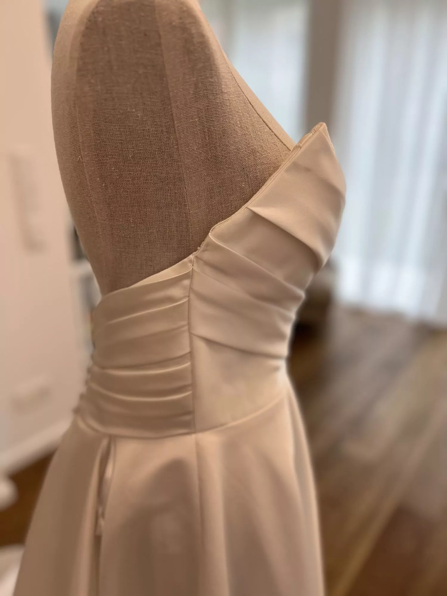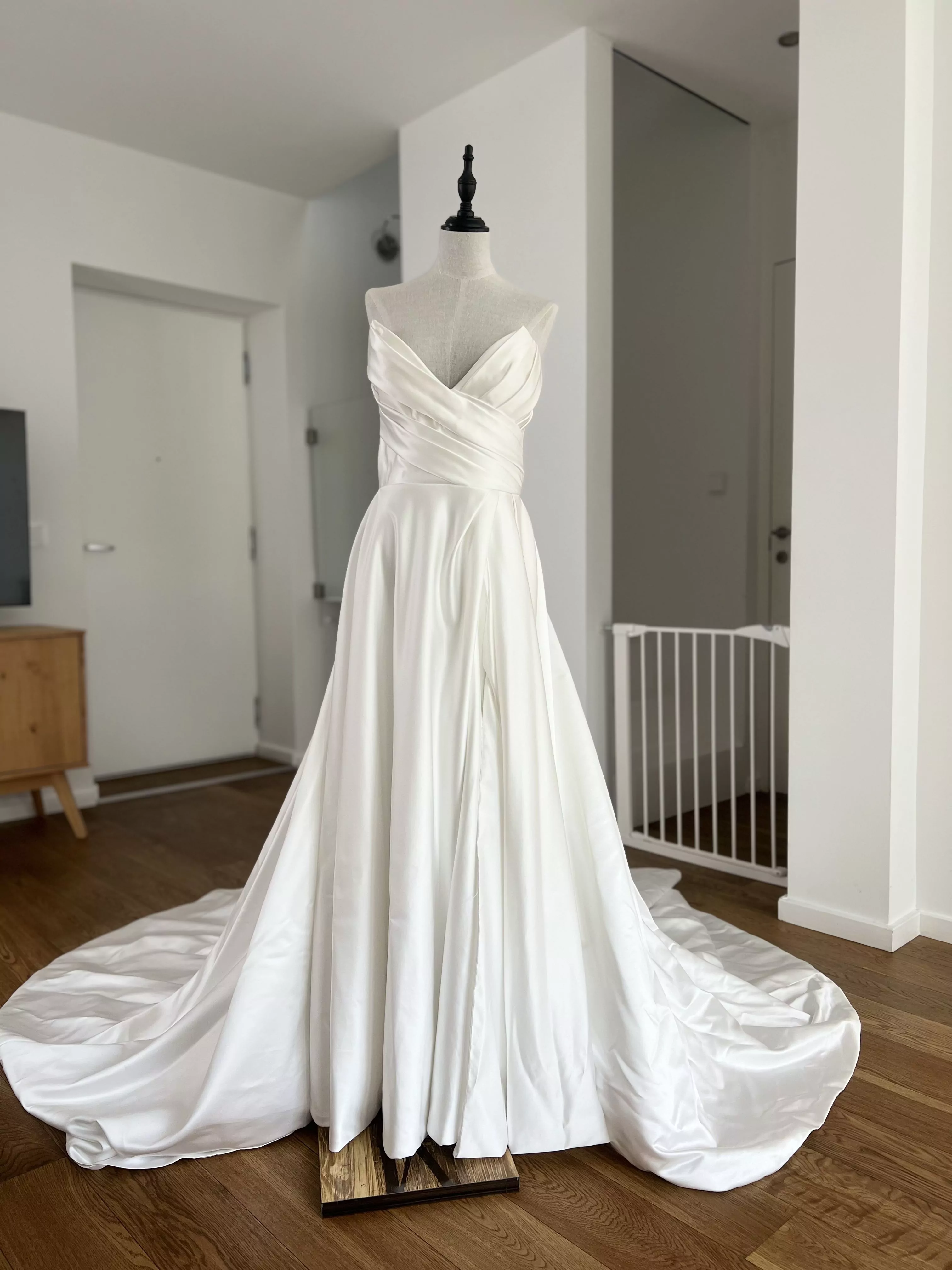 "Ich verkaufe mein wunderschönes Satin Brautkleid. Das Brautkleid wurde nur 4 Stunden getragen, da ich ein zweites Kleid für die Feier angezogen habe. Es wurde für mich gekürzt und angepasst (Körpergröße 165 cm + High Heels ca. 12 cm). Es ist ein modernes Satin Brautkleid in A-Linie, ohne Spitze oder sonstige Applikationen, bodenlang, fließender wunderbarer Satinstoff mit traumhafter Schleppe. Es hat einen tiefen Ausschnitt und ist Rückenfrei, die Schleppe lässt sich an den Knöpfen hochhängen. Das Kleid wurde in Amerika designed. "