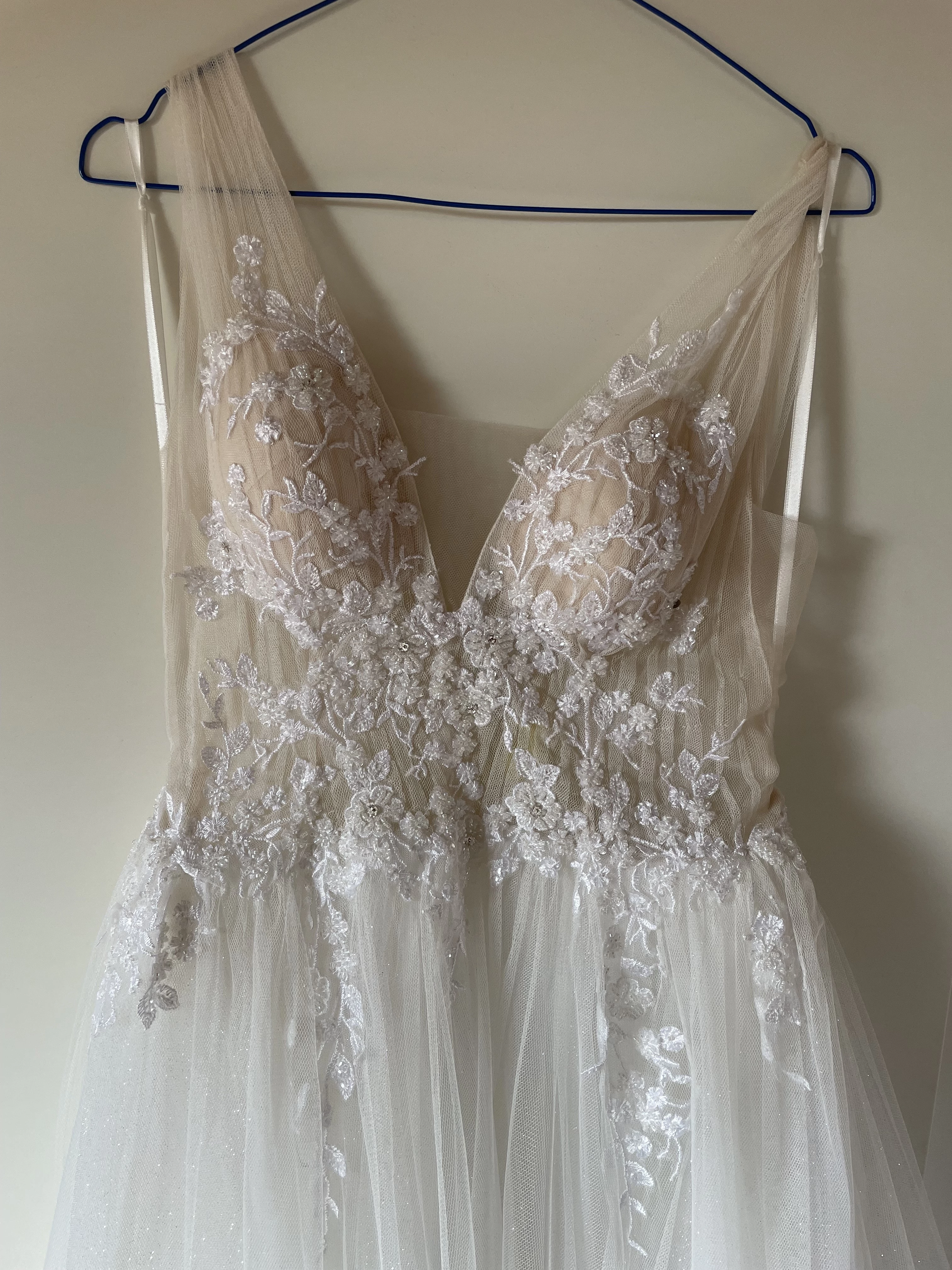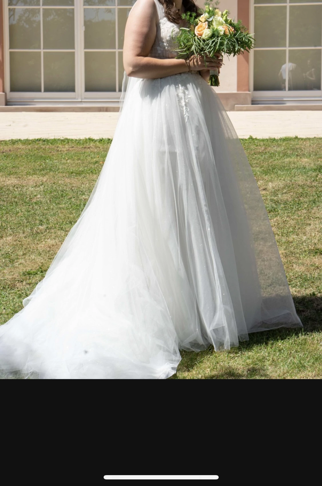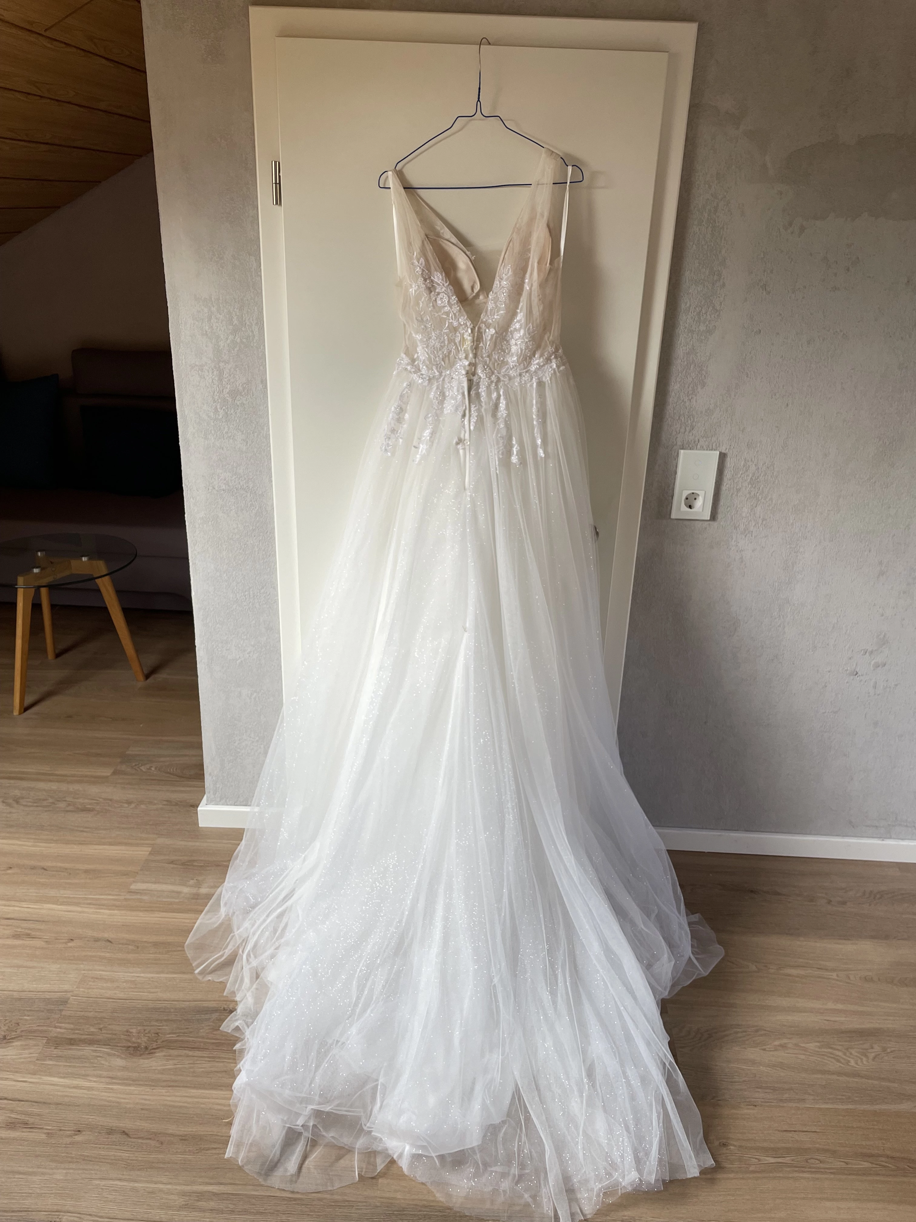 "Das Kleid hat einen wunderschönen Glitzertüll, der im Licht schimmert, ein tolles Oberteil mit Pailletten und Steinchen besetzt , seitliche Cutouts und eine schöne Schleppe 😊"