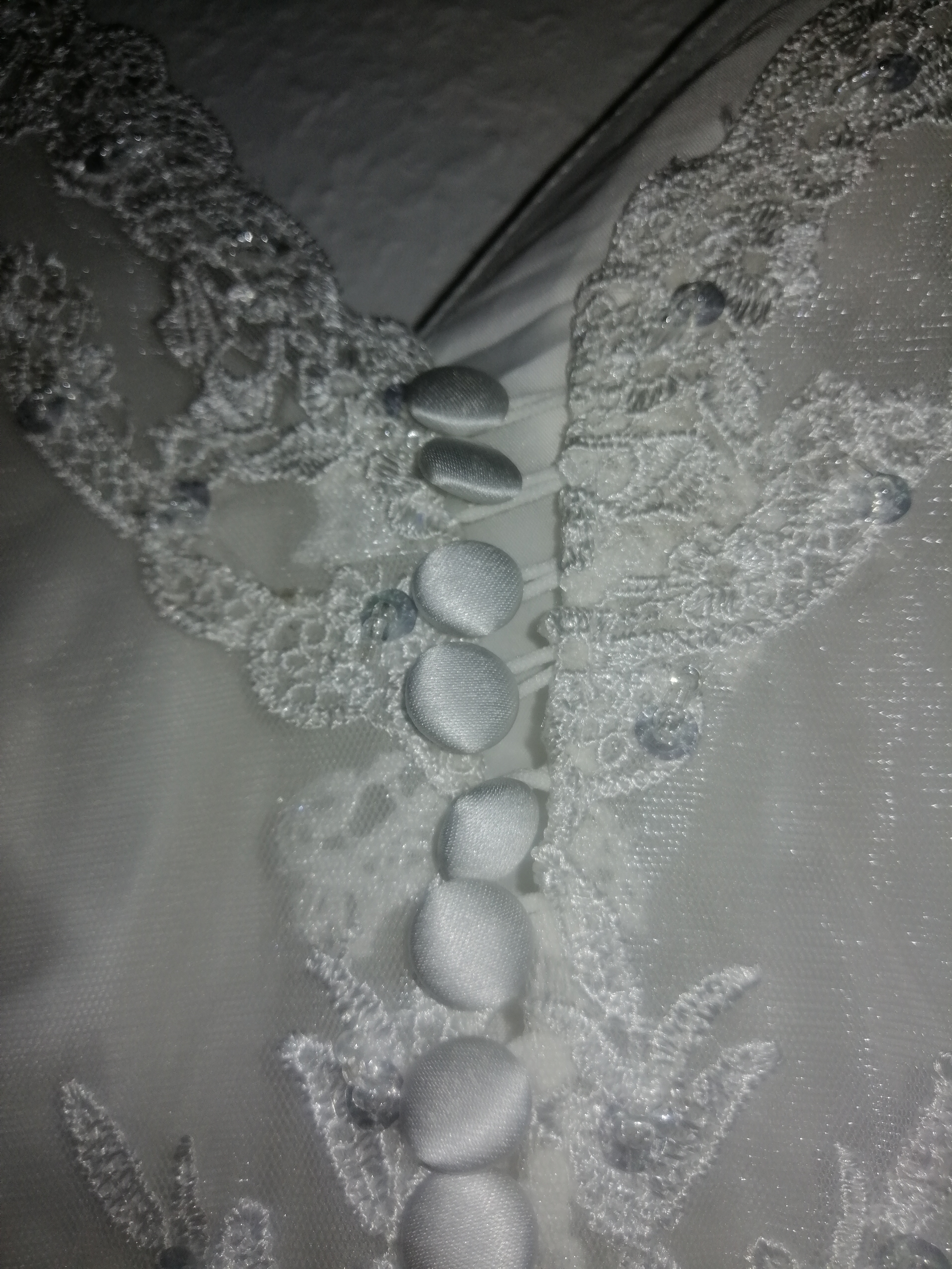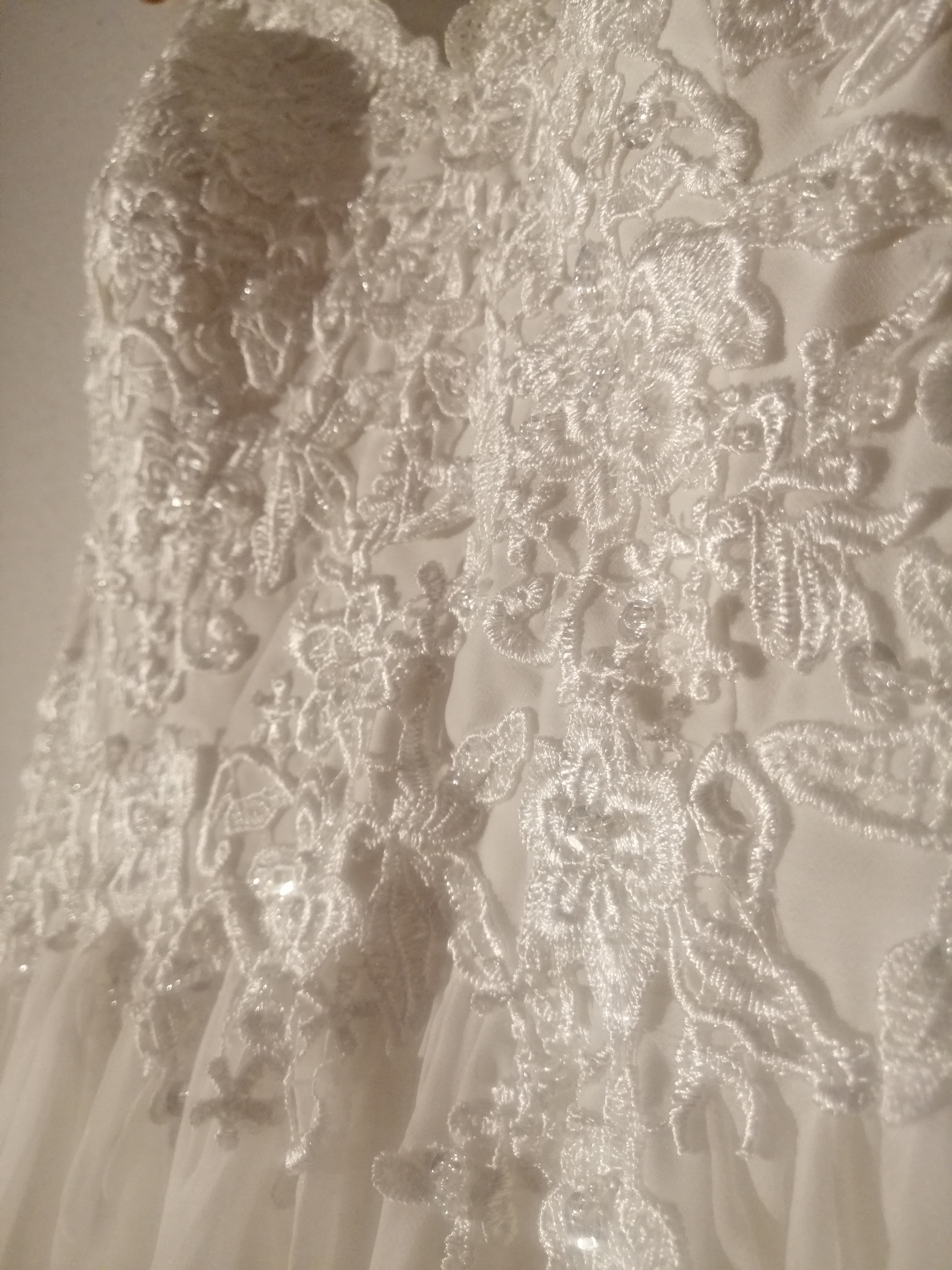 "Das Brautkleid ist tailliert geschnitten. Es kommt mit floraler Spitze, Ziersteinen und V-Ausschnitt sowie semitransparentem Obermaterial."