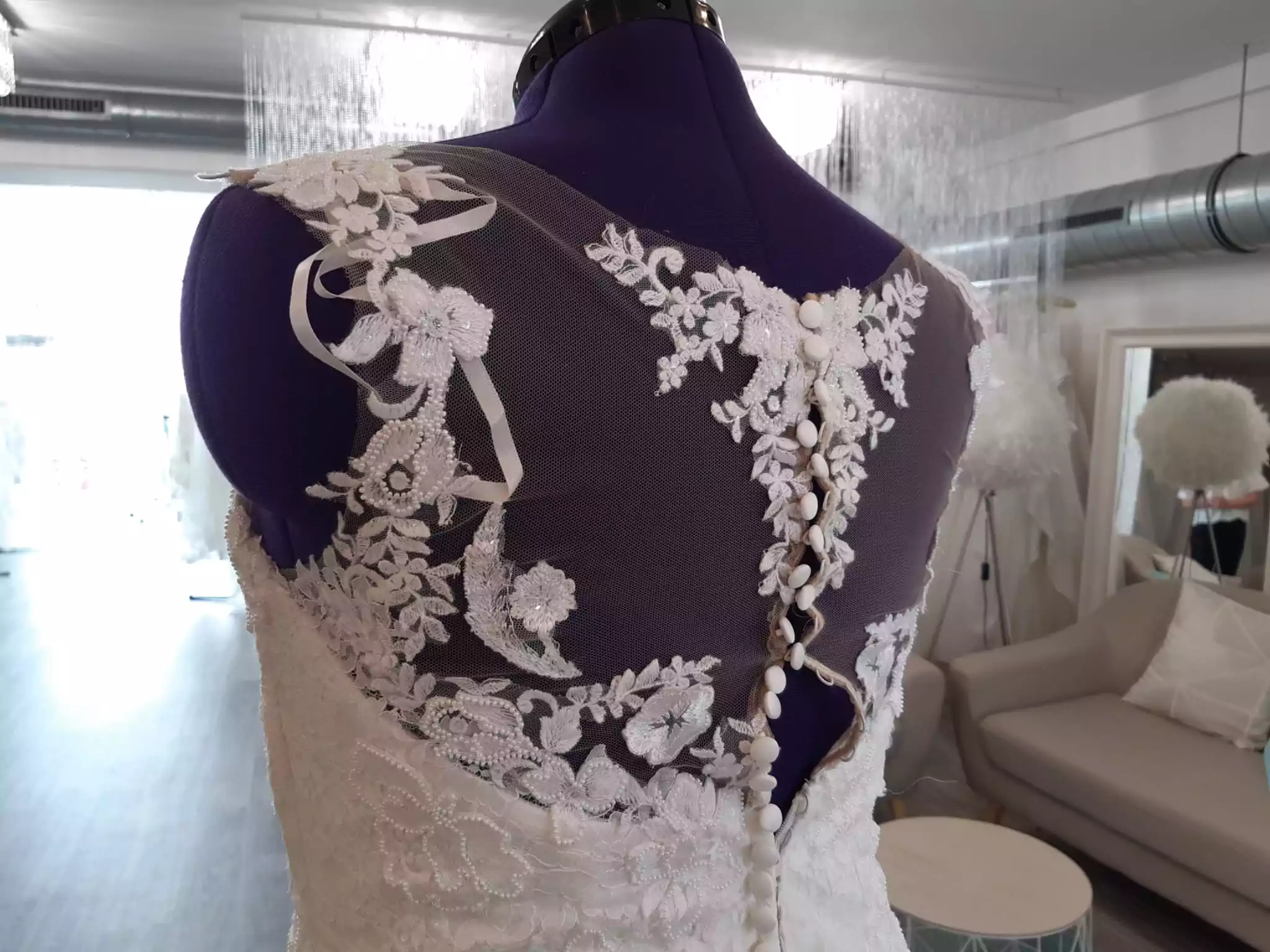 "Wunderschönes Brautkleid mit Trägern und mit Details am Rücken aus Spitze und kleiner Schleppe"