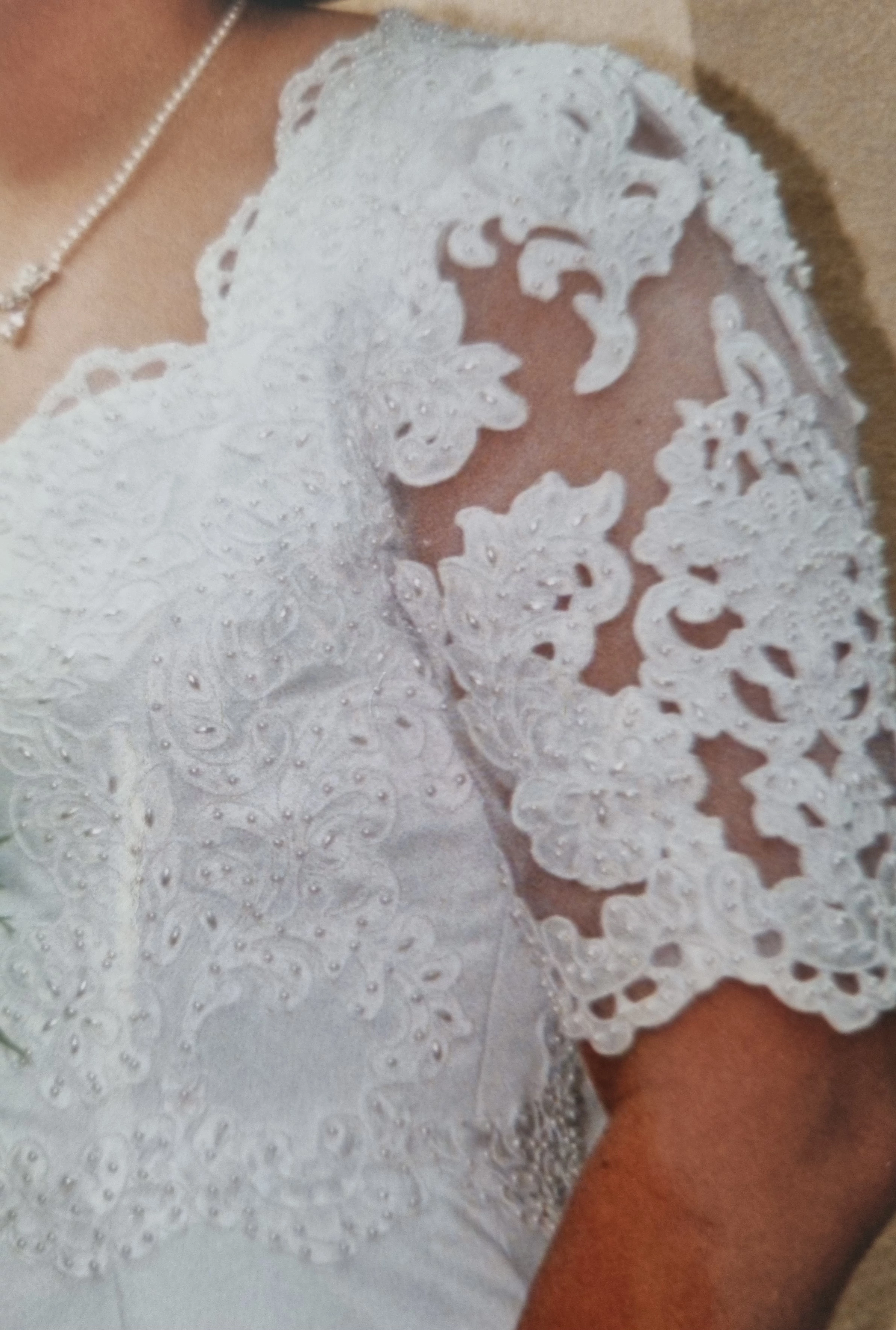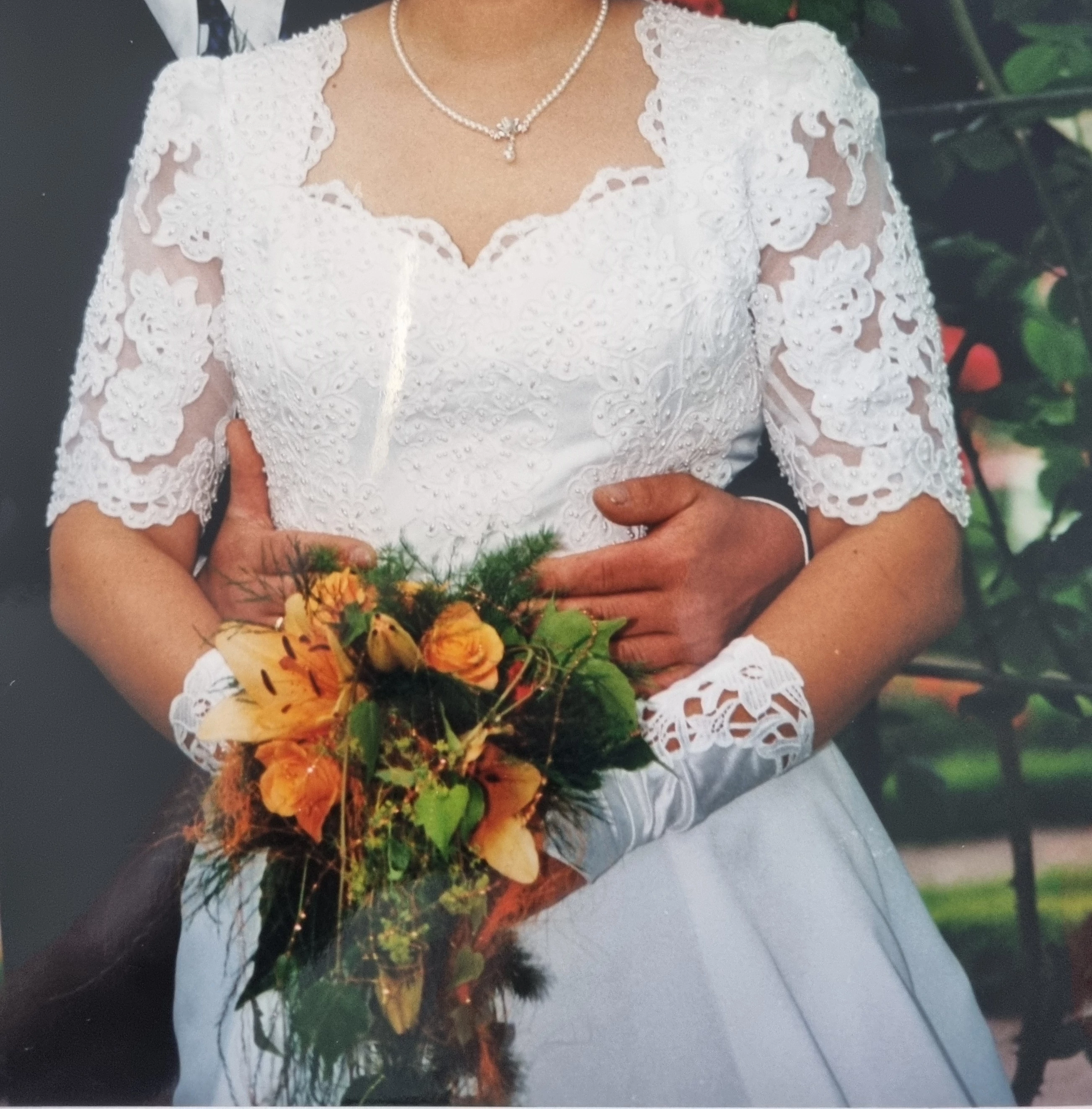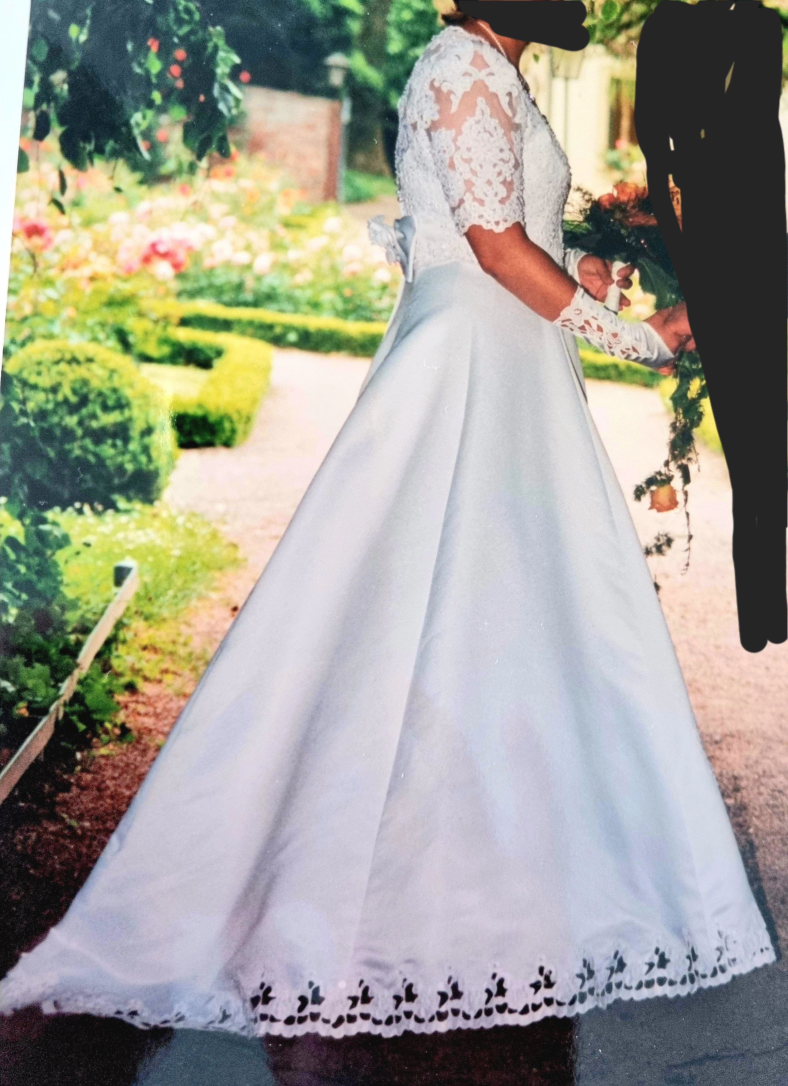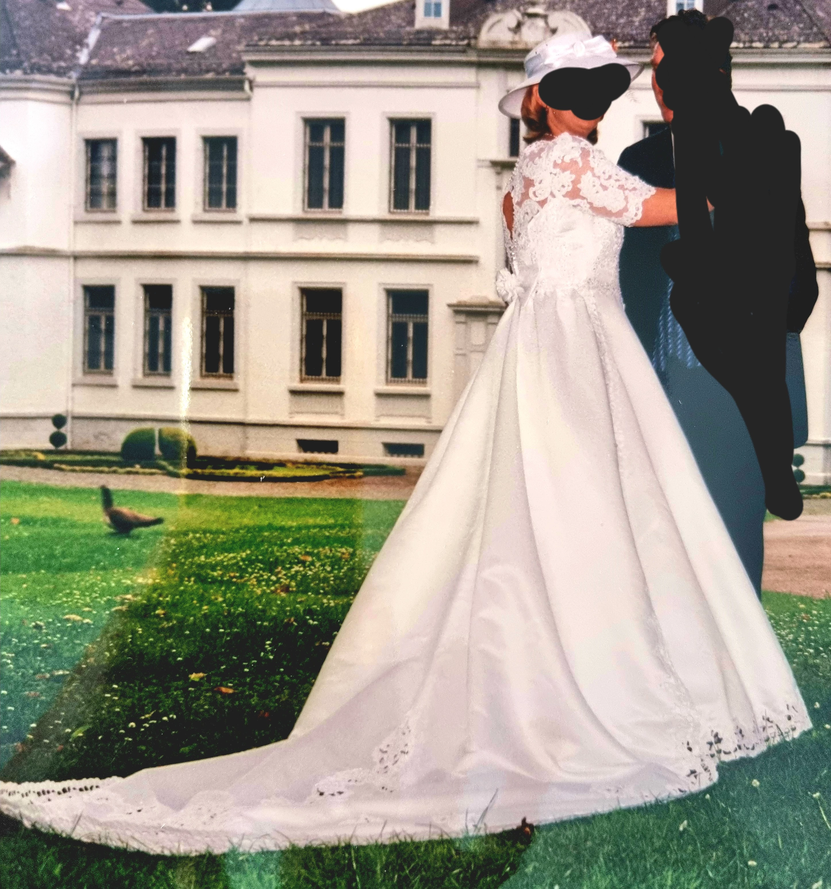 "Eleganz mit aufwendigen Details und doch schlicht. Abnehmbare Schleppe, schöne A-Linie"