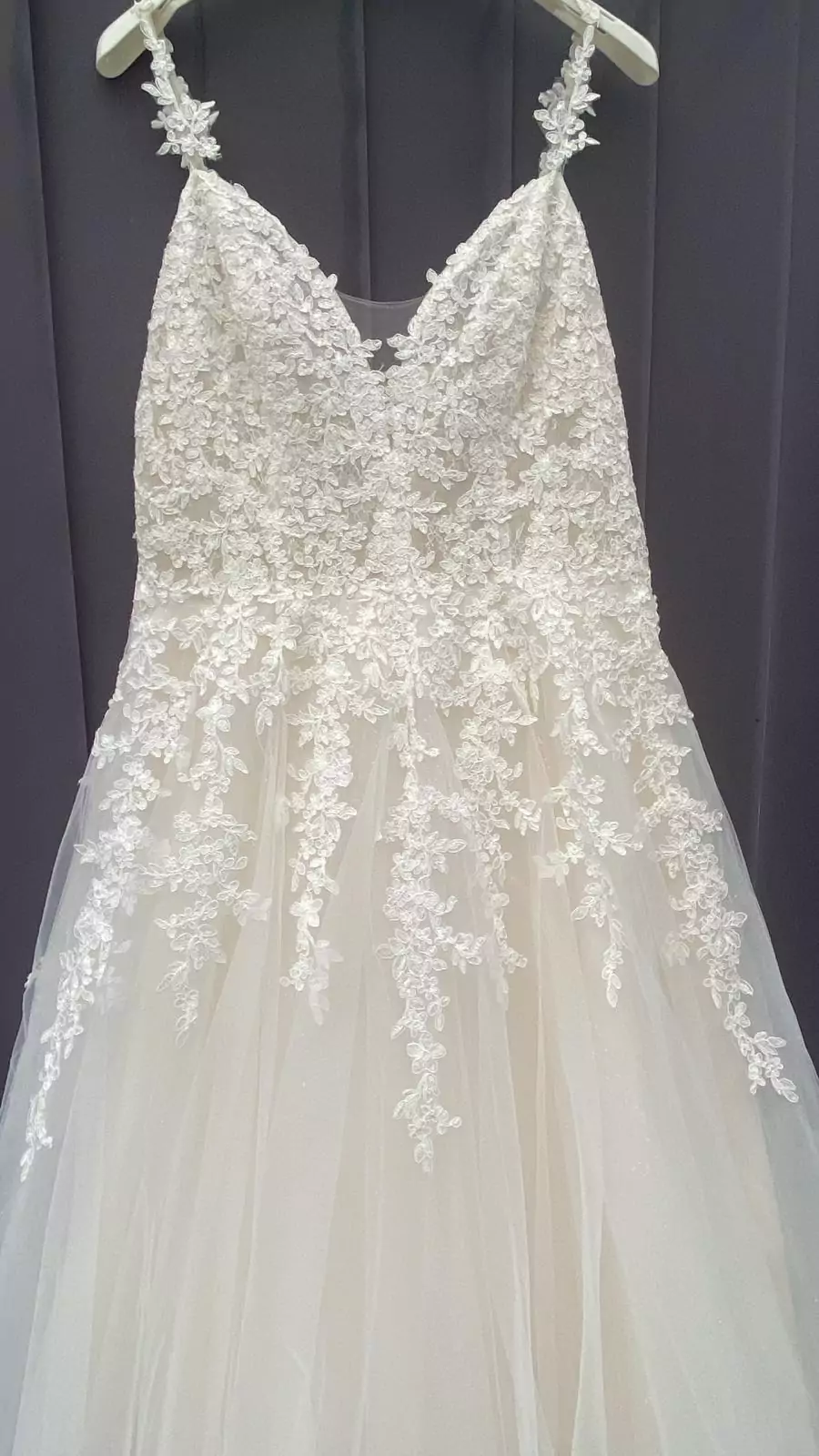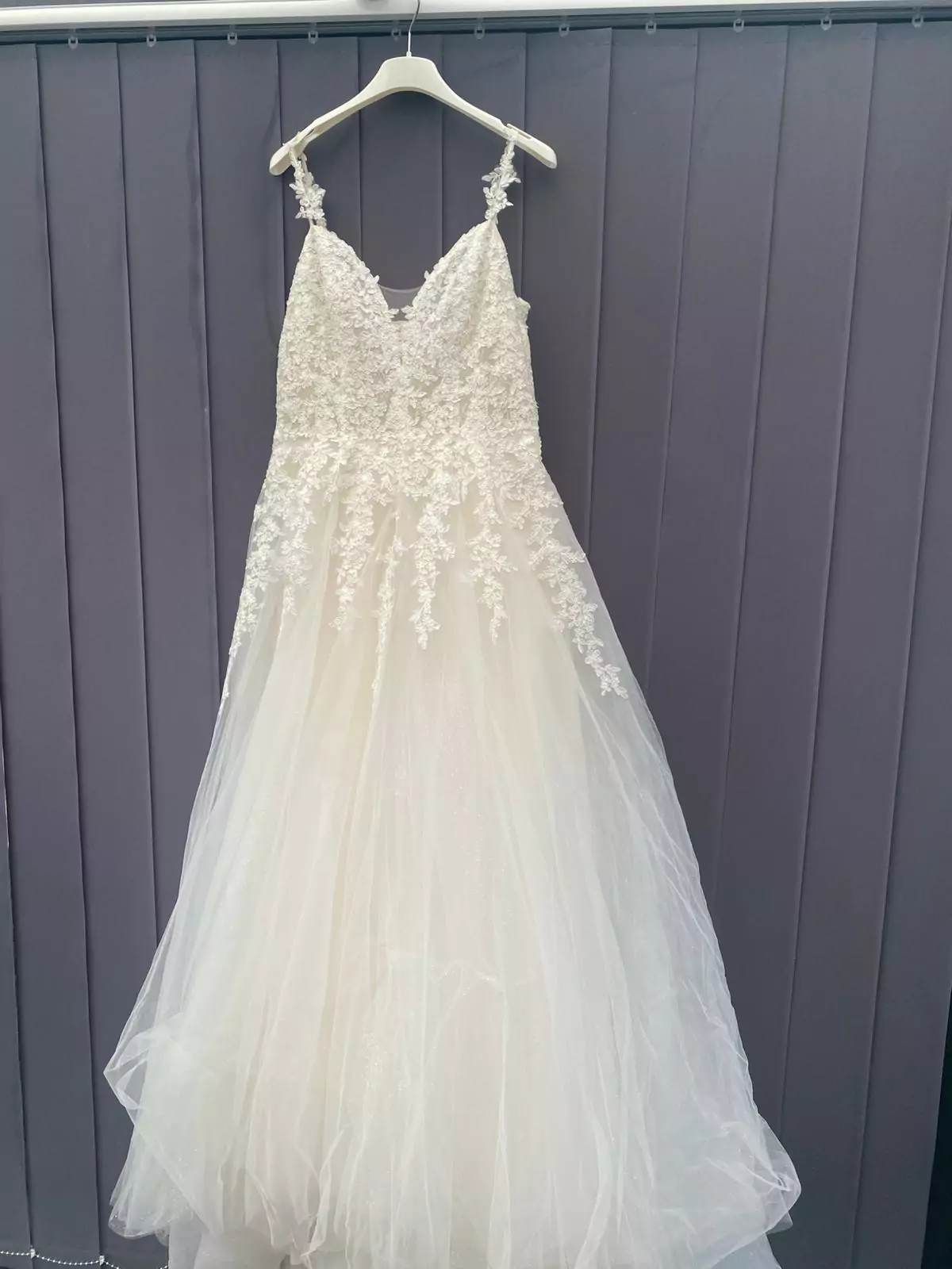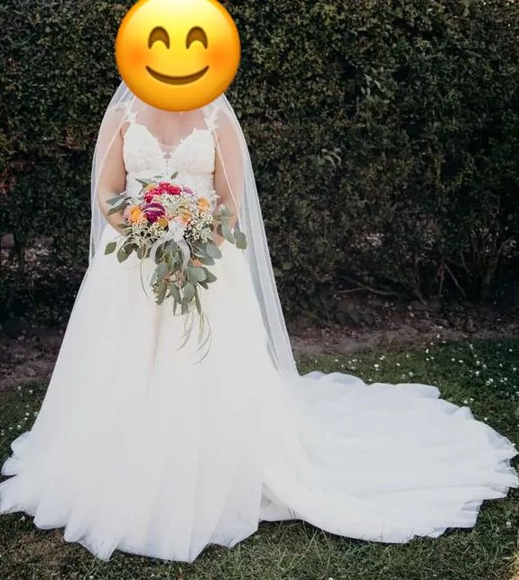 "Das Kleid hat alles, was ein modernes Brautkleid ausmacht: A-Linie, Spitzenoberteil mit Glitzerdetails, Tüllrock mit Glitzeranteil, Schleppe inkl. Schleier und Reifrock"