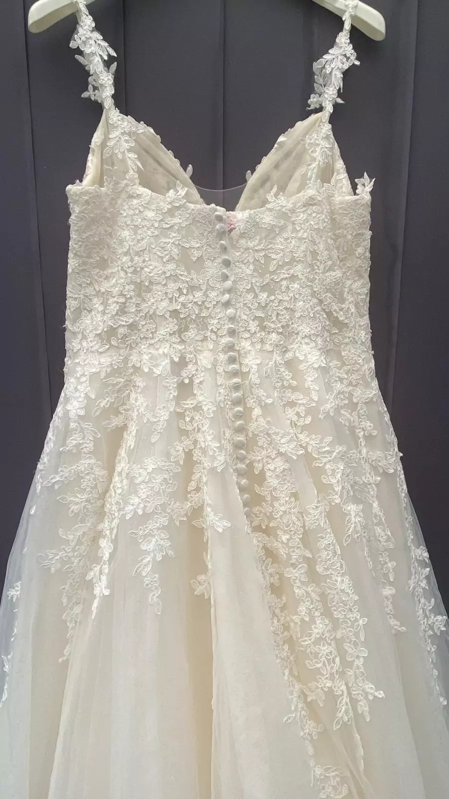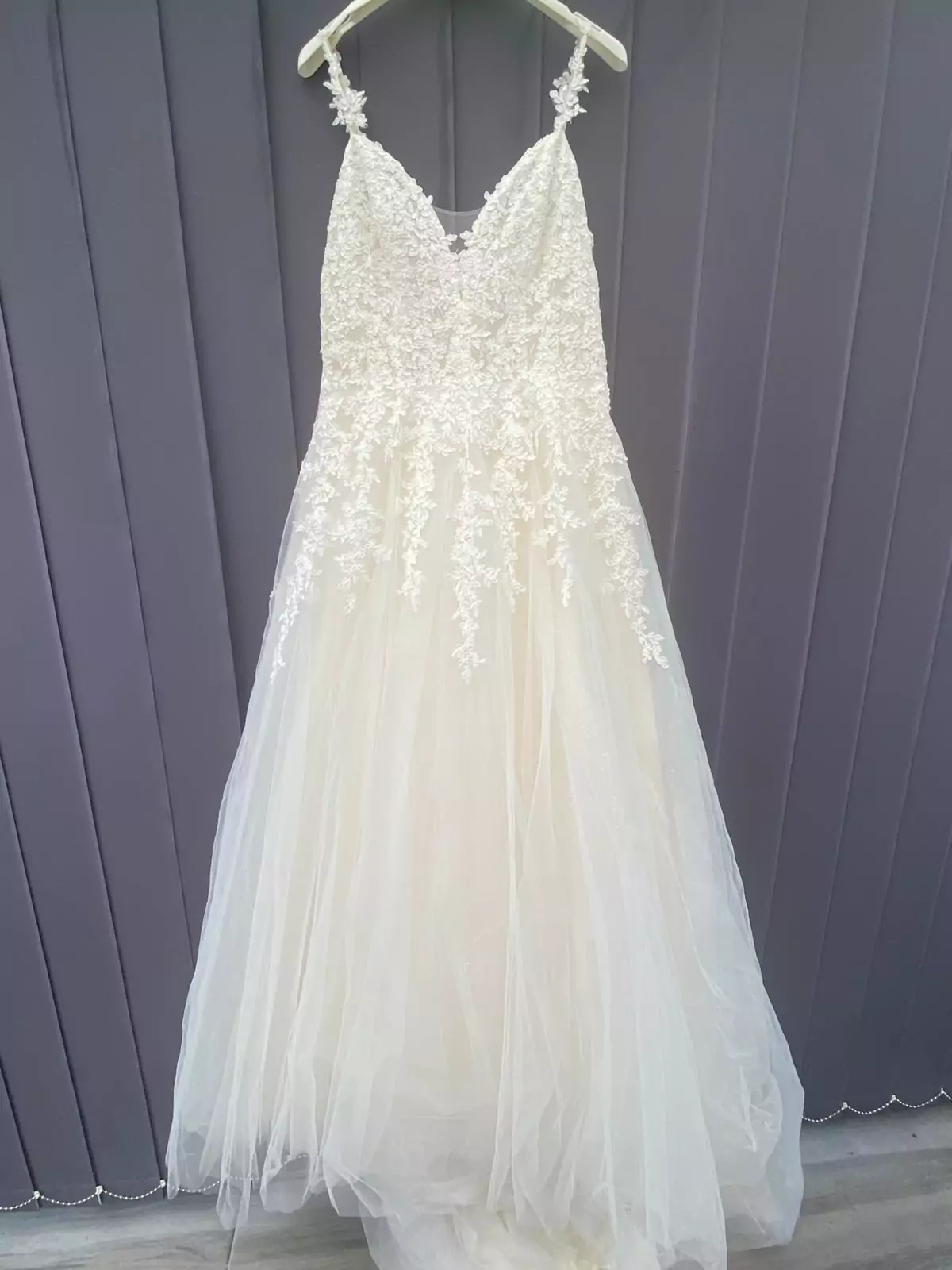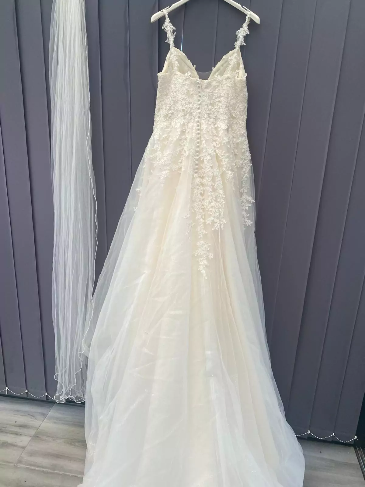 "Das Kleid hat alles, was ein modernes Brautkleid ausmacht: A-Linie, Spitzenoberteil mit Glitzerdetails, Tüllrock mit Glitzeranteil, Schleppe inkl. Schleier und Reifrock"