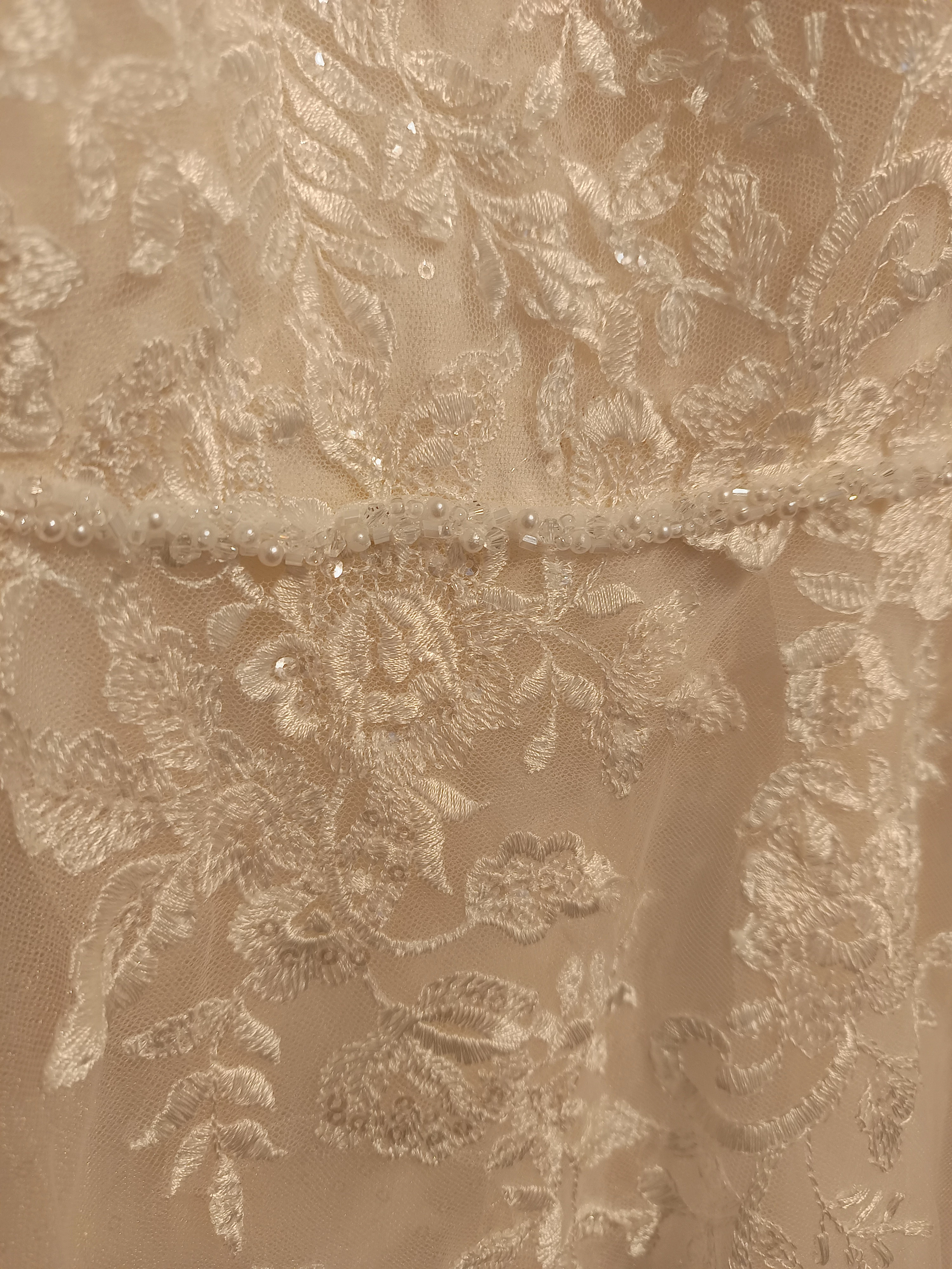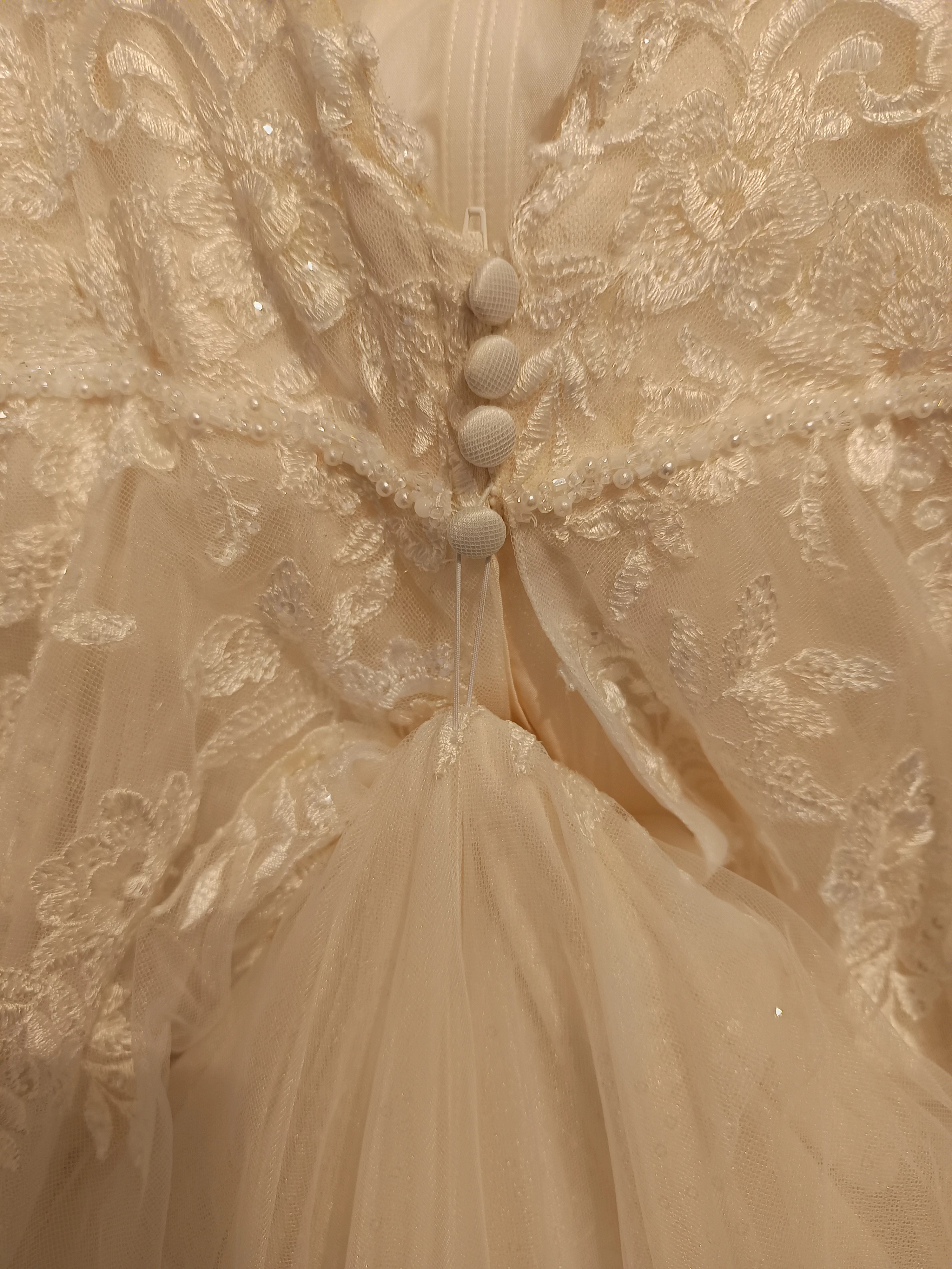 "Der Unterrock besteht aus einem glitzernden Paillettenstoff. Das Kleid hat die Farbe Ivory.