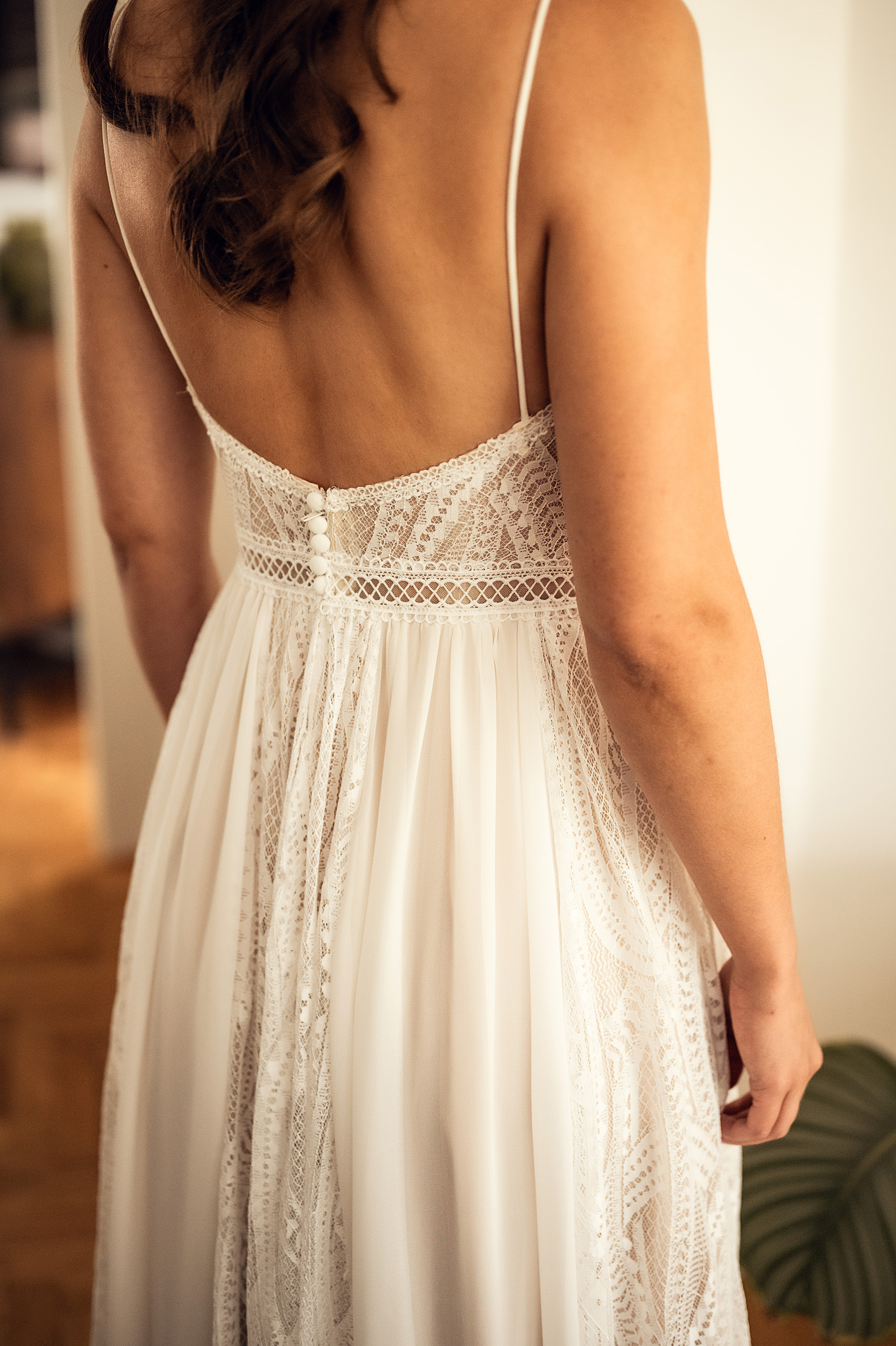 Die Schleppe kann durch drei kleine (nicht sichtbare) Knöpfe hochgenommen werden. Der Wechsel aus Chiffon und Spitze bleibt auch bei hochgesteckten Schleppe erhalten.